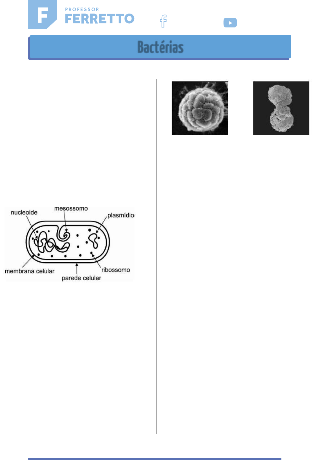 1 01 - (Unichristus) O Vibrio cholerae é um microrganismo causador de doença no ser humano. Esse microrganismo se instala no intestino humano provocando uma intensa diarreia. Se esse vibrião fosse comparado com a célula intestinal, que estruturas celulares seriam encontradas em ambos? a) Ribossomos e membrana plasmática. b) Complexo golgiense e parede celular. c) Membrana plasmática e vacúolo celular. d) Lisossomos e ribossomos. e) Centríolos e lisossomos. 02 - (Unichristus) Disponível em: https://www.exerciciosweb.com.br/citologia/celula-<procariota- exercicios-gabarito02/attachment/img_5945b0995ce21/> Acesso em: 8 ago. 2018. Se, em um exame laboratorial, for diagnosticado que o agente causador de determinada doença possui as características celulares ilustradas anteriormente, pode-se afirmar que é uma a) virose. b) micose. c) protozoose. d) bacteriose. e) verminose. 03 - (Ufmg) Analise estas figuras, em que estão representadas fases da vida de um organismo encontrado em lagoas hipersalinas: O organismo apresenta inúmeras células. O organismo sem membrana nuclear e com um cromossomo sofre divisão. O organismo alimenta-se de matéria orgânica. FONTE: Journal of Structure Biology, 145, mar, 2004. Esse organismo é uma bactéria que, surpreendentemente, apresenta uma característica não usual ao grupo a que pertence. É correto afirmar que tal característica consiste no fato de essa bactéria a) ter número haploide de cromossomo. b) alimentar-se de forma heterotrófica. c) ser organismo multicelular. d) possuir DNA disperso no citoplasma. 04 - (Uece) Considerando as principais características dos domínios Bacteria, Archaeae e Eukarya, assinale a afirmação verdadeira. a) Bacteria são eucariontes e incluem bactérias e cianobactérias; Archaeae são eucariontes e incluem as arqueas capazes de viver em condições extremas; e Eukarya são eucariontes e incluem os reinos Protista, Fungi, Plantae e Animalia. b) Bacteria são procariontes e incluem bactérias e cianobactérias; Archaeae são procariontes e incluem as arqueas capazes de viver em condições extremas; e Eukarya são eucariontes e incluem os reinos Protista, Fungi, Plantae e Animalia. c) Bacteria são procariontes e incluem bactérias e cianobactérias; Archaeae são eucariontes e incluem as arqueas capazes de viver em condições extremas; e Eukarya são eucariontes e incluem os reinos Protista, Fungi, Plantae e Animalia. d) Bacteria são procariontes e incluem bactérias e cianobactérias; Archaeae são eucariontes e incluem as arqueas capazes de viver em condições extremas; e Eukarya são procariontes e incluem os reinos Protista, Fungi, Plantae e Animalia. www.professorferretto.com.br ProfessorFerretto ProfessorFerretto Bactérias ee 2 05 - (Ufrgs) A partir da década de 90, foi proposta a classificação dos seres vivos em 3 domínios: Archaea, Bacteria e Eukarya. Sobre esses seres vivos, considere o quadro abaixo. Características Domínios Bacteria Archaea Eukarya Núcleo envolto por membrana (1) Núcleo envolto por membrana (2) Presença de peptidioglicano na parede celular (3) Maioria vive em ambientes de condições extremas (4) Assinale a alternativa que, completando o quadro, contém a sequência de palavras que substitui corretamente os números de 1 a 4, de acordo com algumas das principais características de cada um desses grandes grupos. a) ausente – ausentes – sim – sim. b) ausente – presentes – sim – sim. c) ausente – ausentes – sim – não. d) presente – presentes – não – sim. e) presente – ausentes – não – não. 06 - (Uern) Analise o cladograma, que representa o estudo filogenético dos três grandes domínios ou super-reinos denominados Bacteria, Archaea e Eukarya. Biologia dos Organismos – Amabis e Martho Com base no diagrama, pode-se concluir que a) as bactérias atuais são mais evoluídas em relação às arqueobactérias. B) a partir do organismo 2, todos são eucarióticos. c) as arqueobactérias são mais evoluídas em relação às bactérias atuais. d) o super-reino Archaea é mais aparentado evolutivamente com o super reino Eukarya. 07 - (Uece) Pode-se afirmar corretamente, que o tipo de organismo procarionte que obtém energia por quimiossíntese a partir da energia geotérmica emanada nas profundezas oceânicas, onde a luz do sol não penetra é um(a) a) protista. b) arqueobactéria. c) cianobactéria. d) eubactéria. 08 - (Uece Examine as afirmativas abaixo, referentes à presença de arqueobactérias: I. Encontram-se no leite durante o processo de fabricação de iogurtes; II. Estão presentes no ar, provocando infecções respiratórias; III. No intestino dos ruminantes são responsáveis pela produção do gás metano; Marque a opção que contém somente afirmativa(s) verdadeira(s): a) I. b) II. c) III. d) I, II, III. 09 - (Ufpb) A seguir, estão listadas características de três diferentes grupos de arqueobactérias ou arqueas: termófilas extremas (ou termoacidófilas), halófilas extremas e metanogênicas. I. São anaeróbicas estritas e importantes decompositoras de matéria orgânica, sendo comuns em áreas pantanosas desprovidas de oxigênio. II. São encontradas em estações de tratamento de lixo e no aparelho digestório de cupins e herbívoros. III. Ocorrem em lagoas rasas de evaporação, formadas por água do mar, nas quais se obtém o sal de cozinha. IV. Obtêm energia da oxidação do enxofre, sendo quimiossintetizantes e ocorrem em fontes termais ou fendas vulcânicas, localizadas nas profundezas oceânicas. A correspondência entre as características descritas e os três grupos de arqueobactérias está corretamente apresentada em: TERMÓFILAS EXTREMAS HALÓFILAS EXTREMAS METANOGÊNICAS a) IV II I e III b) I e II III IV c) IV III I e II d) IV II e III I e) II e III IV I 3 10 - (Fip) A grande quantidade de CO2 contribui para um intenso efeito estufa, que resulta em elevada temperatura, fato também incompatível com a