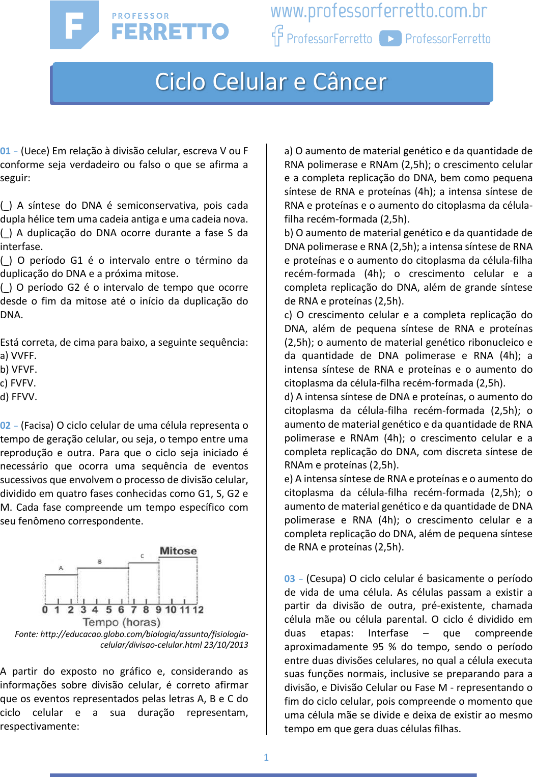 1 01 – (Uece) Em relação à divisão celular, escreva V ou F conforme seja verdadeiro ou falso o que se afirma a seguir: (_) A síntese do DNA é semiconservativa, pois cada dupla hélice tem uma cadeia antiga e uma cadeia nova. (_) A duplicação do DNA ocorre durante a fase S da interfase. (_) O período G1 é o intervalo entre o término da duplicação do DNA e a próxima mitose. (_) O período G2 é o intervalo de tempo que ocorre desde o fim da mitose até o início da duplicação do DNA. Está correta, de cima para baixo, a seguinte sequência: a) VVFF. b) VFVF. c) FVFV. d) FFVV. 02 – (Facisa) O ciclo celular de uma célula representa o tempo de geração celular, ou seja, o tempo entre uma reprodução e outra. Para que o ciclo seja iniciado é necessário que ocorra uma sequência de eventos sucessivos que envolvem o processo de divisão celular, dividido em quatro fases conhecidas como G1, S, G2 e M. Cada fase compreende um tempo específico com seu fenômeno correspondente. Fonte: http://educacao.globo.com/biologia/assunto/fisiologia- celular/divisao-celular.html 23/10/2013 A partir do exposto no gráfico e, considerando as informações sobre divisão celular, é correto afirmar que os eventos representados pelas letras A, B e C do ciclo celular e a sua duração representam, respectivamente: a) O aumento de material genético e da quantidade de RNA polimerase e RNAm (2,5h); o crescimento celular e a completa replicação do DNA, bem como pequena síntese de RNA e proteínas (4h); a intensa síntese de RNA e proteínas e o aumento do citoplasma da célula- filha recém-formada (2,5h). b) O aumento de material genético e da quantidade de DNA polimerase e RNA (2,5h); a intensa síntese de RNA e proteínas e o aumento do citoplasma da célula-filha recém-formada (4h); o crescimento celular e a completa replicação do DNA, além de grande síntese de RNA e proteínas (2,5h). c) O crescimento celular e a completa replicação do DNA, além de pequena síntese de RNA e proteínas (2,5h); o aumento de material genético ribonucleico e da quantidade de DNA polimerase e RNA (4h); a intensa síntese de RNA e proteínas e o aumento do citoplasma da célula-filha recém-formada (2,5h). d) A intensa síntese de DNA e proteínas, o aumento do citoplasma da célula-filha recém-formada (2,5h); o aumento de material genético e da quantidade de RNA polimerase e RNAm (4h); o crescimento celular e a completa replicação do DNA, com discreta síntese de RNAm e proteínas (2,5h). e) A intensa síntese de RNA e proteínas e o aumento do citoplasma da célula-filha recém-formada (2,5h); o aumento de material genético e da quantidade de DNA polimerase e RNA (4h); o crescimento celular e a completa replicação do DNA, além de pequena síntese de RNA e proteínas (2,5h). 03 – (Cesupa) O ciclo celular é basicamente o período de vida de uma célula. As células passam a existir a partir da divisão de outra, pré-existente, chamada célula mãe ou célula parental. O ciclo é dividido em duas etapas: Interfase – que compreende aproximadamente 95 % do tempo, sendo o período entre duas divisões celulares, no qual a célula executa suas funções normais, inclusive se preparando para a divisão, e Divisão Celular ou Fase M - representando o fim do ciclo celular, pois compreende o momento que uma célula mãe se divide e deixa de existir ao mesmo tempo em que gera duas células filhas. www.professorferretto.com.br ProfessorFerretto ProfessorFerretto Ciclo Celular e Câncer 2 http://maxaug.blogspot.com.br - adaptado. Analise a figura e o quadro abaixo e associe os eventos descritos no quadro com os períodos G1, S e G2 da Interfase apresentadas na figura. INTERFASE Períodos Eventos Duplicação do DNA Crescimento e diferenciação Síntese dos componentes dos microtúbulos Síntese de histonas Início da condensação da cromatina Assinale a alternativa que contém a sequência correta das fases da Interfase apresentadas no quadro acima. a) S, G2, G1, S, G1. b) S, G1, G2, S, G2. c) S, G2, S, G2, S. d) S, S, G1, G1, G2. 04 – (Fuvest) Um indivíduo é heterozigótico em dois locos: AaBb. Um espermatócito desse indivíduo sofre meiose. Simultaneamente, uma célula sanguínea do mesmo indivíduo entra em divisão mitótica. Ao final da interfase que precede a meiose e a mitose, cada uma dessas células terá, respectivamente, a seguinte constituição genética: a) AaBb e AaBb. b) AaBb e AAaaBBbb. c) AAaaBBbb e AaBb. d) AAaaBBbb e AAaaBBbb. e) AB e AaBb. 05 - (Fuvest) Na figura abaixo, está representado o ciclo celular. Na fase S, ocorre síntese de DNA; na fase M, ocorre a mitose e, dela, resultam novas células, indicadas no esquema pelas letras C. Considerando que, em G1, existe um par de alelos Bb, quantos representantes de cada alelo existirão ao final de S e de G2 e em cada C? a) 4, 4 e 4. b) 4, 4 e 2. c) 4, 2 e 1. d) 2, 2 e 2. e) 2, 2 e 1. 06 - (Uel) Em uma população de organismos diploides, foram encontrados quatro alelos diferentes para um determinado locus gênico, denominados S1, S2, S3 e S4. A figura abaixo mostra, à esquerda, as diferenças na sequência de DNA que caracterizam cada um desses alelos e, à direita, o par de cromossomos homólogos (metafásicos) onde esse gene é encontrado. Diante dessas informações, se um único indivíduo desta população for escolhido ao acaso, qual combinação alelo/posição cromossômica poderia ser encontrada no par de cromossomos metafásicos deste indivíduo? a) (S1 - A) (S1 - B) (S3 - C) (S3 - D). b) (S1 - A) (S2 - B) (S3 - C) (S4 - D). c) (S4 - A) (S4 - B) (S4 - G) (S4 - H). d) (S3 - A) (S3 - B) (S3 - E) (S3 - F). e) (S2 - A) (S2 - C) (S3 - E) (S3 - G). 3 07 - (Unicamp) Em relação a um organismo diploide, que apresenta 24 cromossomos em cada célula somática, pode-se afirmar que a) uma célula desse organismo na fase G2 da interfase apresenta 48 moléculas de DNA de fita dupla. b) seu código genético é composto p