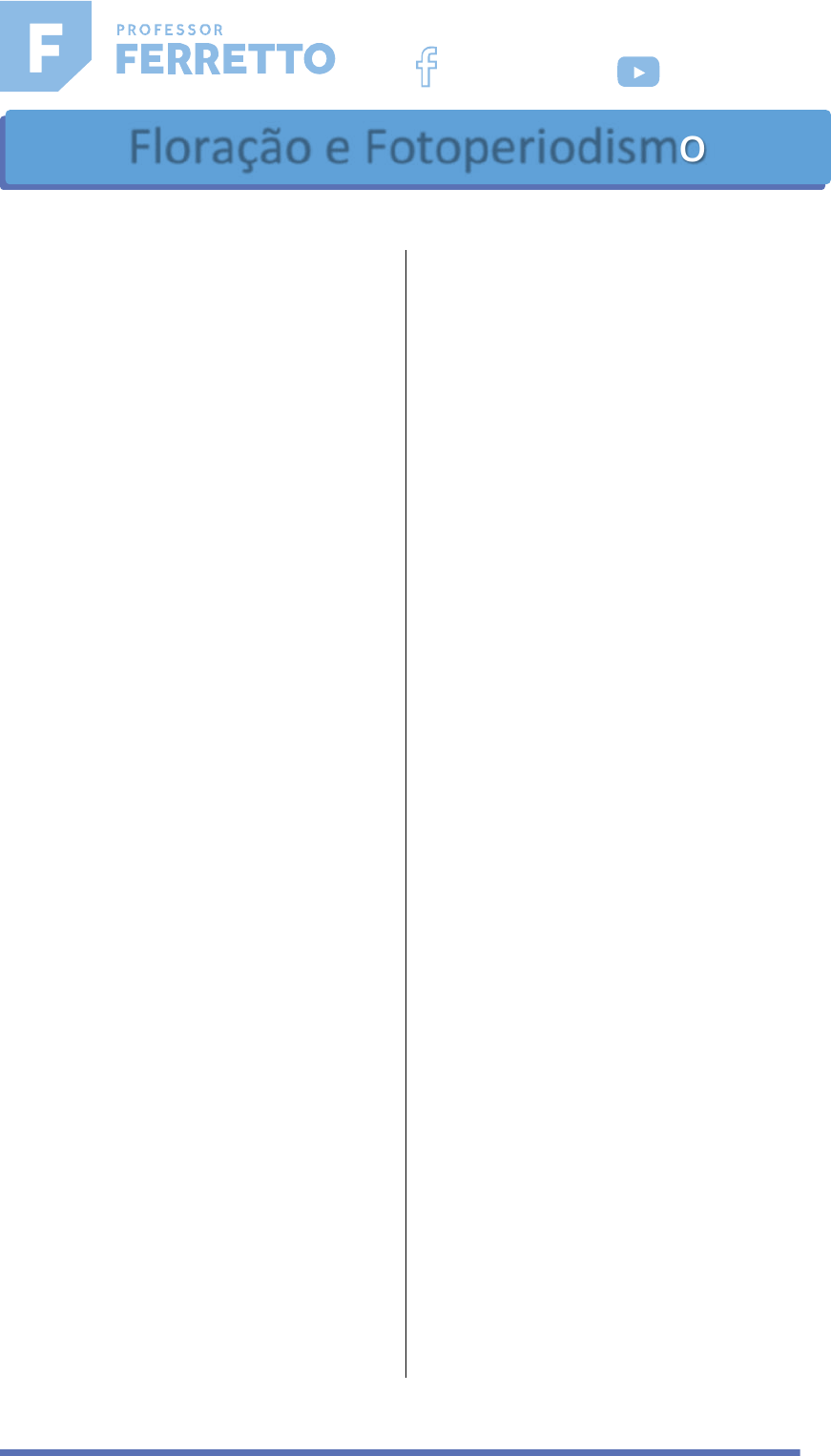 1 01 - (Puccamp) Certas plantas só florescem em determinados meses do ano e o fator preponderante que exerce o papel de relógio biológico para elas é a) a mudança do pH do solo. b) o período de iluminação diário. c) a variação da velocidade do vento. d) a intensidade das chuvas. e) a quantidade de nutrientes do solo. 02 - (Unesp) Os moradores de uma determinada cidade sentem-se orgulhosos pela beleza de suas praças e alamedas. Todos os anos, em determinado mês, quase todos os ipês da cidade florescem e as deixam enfeitadas de amarelo e roxo. O florescimento simultâneo dos ipês é devido ao: a) fato de todas as árvores terem sido plantadas na mesma época. b) fato de todas as árvores terem sido plantadas com a mesma idade ou grau de desenvolvimento. c) fato de só nessa época do ano haver agentes polinizadores específicos. d) fototropismo. e) fotoperiodismo. 03 - (Uece) A biosfera recebe a radiação solar em comprimentos de onda que variam de 0,3 μm a aproximadamente 3,0 μm. Em média, 45% da radiação proveniente do Sol encontra-se dentro de uma faixa espectral de 0,18 μm a 0,71 μm, que é utilizada para a fotossíntese das plantas (radiação fotossinteticamente ativa, RFA). Em função da luz solar, pode-se afirmar corretamente que a) as plantas que crescem sob a sombra, desenvolvem estrutura e aparência semelhantes às daquelas que crescem sob a luz. b) a parte aérea das plantas recebe somente a radiação unidirecional. c) fotoperiodismo é a resposta da planta ao comprimento relativo do dia e da noite e às mudanças neste relacionamento ao longo do ano. d) respostas sazonais em plantas não são possíveis porque os organismos vegetais são incapazes de “perceber” o período do ano em que se encontram. 04 - (Puccamp) Na época de Colombo, a batata era cultivada nas terras altas da América do Sul e se tornou um dos mais importantes alimentos da Europa durante dois séculos, fornecendo mais do que duas vezes a quantidade de calorias por hectare do que o trigo. Atualmente, se o convidarem para saborear um belo cozido português, certamente a última coisa que experimentará entre as iguarias do prato será a batata, pois ao ser colocada na boca sempre parecerá mais quente. (...) Mas será que ela está sempre mais quente, uma vez que todos os componentes do prato foram cozidos juntos e saíram ao mesmo tempo da panela? Adaptado de P. H. Raven, et all: Biologia Vegetal. Guanabara: Koogan-2001 e Anibal Figueiredo e Maurício Pietrocola. Física - um outro lado - Calor e temperatura. São Paulo: FTD, 1997. Em diversas espécies vegetais a formação de tubérculos é influenciada pela luz. Em certa variedade de batatas, por exemplo, se a planta ficar exposta a 18 horas de luz, não forma tubérculos, mas produz bom número deles se for iluminada durante 10 horas apenas. Isso significa que a tuberização está sujeita a) à fotossíntese. b) à fotonastia. c) à fotoindução. d) ao fotoperiodismo. e) ao fototropismo. 05 - (Unesp) O professor chamou a atenção dos alunos para o fato de que todos os ipês-roxos existentes nas imediações da escola floresceram quase que ao mesmo tempo, no início do inverno. Por outro lado, os ipês- amarelos, existentes na mesma área, também floresceram quase que ao mesmo tempo, porém já próximo ao final do inverno. Uma possível explicação para este fato é que ipês-roxos e ipês-amarelos apresentam a) pontos de compensação fótica diferentes e, provavelmente, são de espécies diferentes. b) pontos de compensação fótica diferentes, e isto não tem qualquer relação quanto a serem da mesma espécie ou de espécies diferentes. c) fotoperiodismos diferentes e, provavelmente, são de espécies diferentes. www.professorferretto.com.br ProfessorFerretto ProfessorFerretto Floração e Fotoperiodismo 2 d) fotoperiodismos diferentes, e isto não tem qualquer relação quanto a serem da mesma espécie ou de espécies diferentes. e) fototropismos diferentes, e isto não tem qualquer relação quanto a serem da mesma espécie ou de espécies diferentes. 06 - (Fatec) Grupos de angiospermas das espécies I, II e III foram submetidos a tratamentos fotoperiódicos, manifestando os resultados descritos a seguir. Quando receberam diariamente 3 horas de luz e 21 de escuro, I não floresceu, mas II e III floresceram. Quando foram expostos a 10 horas diárias de luz e 14 de escuro, I e II floresceram, porém III não floresceu. Com base nesses dados pode-se concluir acertadamente que I, II e III são, respectivamente, plantas a) de dia curto, neutras e de dia longo. b) de dia curto, de dia longo e neutras. c) neutras, de dia curto e de dia longo. d) de dia longo, neutras e de dia curto. e) de dia longo, de dia curto e neutras. 07 - (Unifor) O fotoperíodo crítico de uma planta de uma planta é de 12 horas. Se ela ficar 7 horas no claro e 17 horas no escuro, não floresce. Desses dados, pode-se concluir que a planta em questão é: a) Adaptada à sombra. b) Fotoblástica negativa. c) Fotoblástica positiva. d) De dia longo. e) De dia curto. 08 - (Ufv) O esquema abaixo representa um experimento, realizado com uma espécie de planta, para verificar aspectos relacionados com sua floração. Analisando o resultado do experimento, é correto afirmar que a planta: a) é de dia curto e floresce quando exposta a curtos períodos de exposição à luz. b) é de dia curto e floresce quando a noite é mais curta do que o fotoperíodo crítico. c) é de dia longo e floresce quando exposta a longos períodos na ausência de luz. d) é de dia longo e floresce quando a noite é mais longa do que o fotoperíodo crítico. 09 - (Ufg) O mapa mundi abaixo mostra o itinerário da mais importante viagem que modificou os rumos do pensamento biológico, realizada entre 1831 a 1836. Acompanhe o percurso dessa viagem. Essa viagem foi comandada pelo jovem capitão FitzRoy que tinha na tripulação do navio H. M. S. Beagle outro jovem, o naturalista Ch