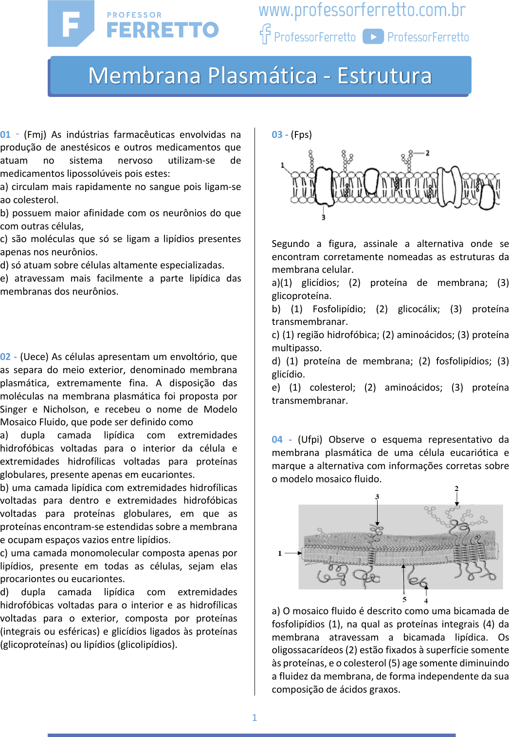 1 01 - (Fmj) As indústrias farmacêuticas envolvidas na produção de anestésicos e outros medicamentos que atuam no sistema nervoso utilizam-se de medicamentos lipossolúveis pois estes: a) circulam mais rapidamente no sangue pois ligam-se ao colesterol. b) possuem maior afinidade com os neurônios do que com outras células, c) são moléculas que só se ligam a lipídios presentes apenas nos neurônios. d) só atuam sobre células altamente especializadas. e) atravessam mais facilmente a parte lipídica das membranas dos neurônios. 02 - (Uece) As células apresentam um envoltório, que as separa do meio exterior, denominado membrana plasmática, extremamente fina. A disposição das moléculas na membrana plasmática foi proposta por Singer e Nicholson, e recebeu o nome de Modelo Mosaico Fluido, que pode ser definido como a) dupla camada lipídica com extremidades hidrofóbicas voltadas para o interior da célula e extremidades hidrofílicas voltadas para proteínas globulares, presente apenas em eucariontes. b) uma camada lipídica com extremidades hidrofílicas voltadas para dentro e extremidades hidrofóbicas voltadas para proteínas globulares, em que as proteínas encontram-se estendidas sobre a membrana e ocupam espaços vazios entre lipídios. c) uma camada monomolecular composta apenas por lipídios, presente em todas as células, sejam elas procariontes ou eucariontes. d) dupla camada lipídica com extremidades hidrofóbicas voltadas para o interior e as hidrofílicas voltadas para o exterior, composta por proteínas (integrais ou esféricas) e glicídios ligados às proteínas (glicoproteínas) ou lipídios (glicolipídios). 03 - (Fps) Segundo a figura, assinale a alternativa onde se encontram corretamente nomeadas as estruturas da membrana celular. a)(1) glicídios; (2) proteína de membrana; (3) glicoproteína. b) (1) Fosfolipídio; (2) glicocálix; (3) proteína transmembranar. c) (1) região hidrofóbica; (2) aminoácidos; (3) proteína multipasso. d) (1) proteína de membrana; (2) fosfolipídios; (3) glicídio. e) (1) colesterol; (2) aminoácidos; (3) proteína transmembranar. 04 - (Ufpi) Observe o esquema representativo da membrana plasmática de uma célula eucariótica e marque a alternativa com informações corretas sobre o modelo mosaico fluido. a) O mosaico fluido é descrito como uma bicamada de fosfolipídios (1), na qual as proteínas integrais (4) da membrana atravessam a bicamada lipídica. Os oligossacarídeos (2) estão fixados à superfície somente às proteínas, e o colesterol (5) age somente diminuindo a fluidez da membrana, de forma independente da sua composição de ácidos graxos. www.professorferretto.com.br ProfessorFerretto ProfessorFerretto Membrana Plasmática - Estrutura 2 b) As proteínas de membrana (3) estão incrustadas na dupla lâmina de colesterol, aderidas ou atravessando a membrana de lado a lado, como as proteínas transportadoras (4), que facilitam o transporte por difusão facilitada. c) Os fosfolipídios (1) e os oligossacarídeos (2) que constituem o glicocálix estão associados às proteínas. As proteínas integrais (3) têm regiões polares que penetram na bicamada fosfolipídica, ao contrário das periféricas (4) que apresentam regiões apolares. O colesterol (5) pode aumentar a fluidez da membrana, não dependendo de outros fatores como a composição de ácidos graxos. d) Os fosfolipídios (1) conferem dinamismo às membranas biológicas e os oligossacarídeos (2) que constituem o glicocálix podem estar associados aos lipídios ou às proteínas. As proteínas integrais (3) têm regiões hidrofóbicas que penetram na bicamada lipídica, ao contrário das periféricas (4), que apresentam regiões polares. O colesterol (5) pode aumentar ou diminuir a fluidez da membrana, dependendo de outros fatores, como a composição de ácidos graxos. e) As proteínas da membrana estão incrustadas na dupla lâmina de fosfolipídios, aderidas (1) ou atravessando a membrana de lado a lado, como as periféricas (4), que facilitam o transporte por difusão facilitada. O colesterol (5) não interfere na fluidez da membrana, dependendo de outros fatores, como a composição dos ácidos graxos. 05 - (Uel) A imagem a seguir representa a estrutura molecular da membrana plasmática de uma célula animal. Com base na imagem e nos conhecimentos sobre o tema, considere as afirmativas a seguir. I. Os fosfolipídios têm um comportamento peculiar em relação à água: uma parte da sua molécula é hidrofílica e a outra, hidrofóbica, favorecendo a sua organização em dupla camada. II. A fluidez atribuída às membranas celulares é decorrente da presença de fosfolipídios. III. Na bicamada lipídica da membrana, os fosfolipídios têm a sua porção hidrofílica voltada para o interior dessa bicamada e sua porção hidrofóbica voltada para o exterior. IV. Os fosfolipídios formam uma barreira ao redor das células, impedindo a passagem de moléculas e íons solúveis em água, que são transportados através das proteínas intrínsecas à membrana. Estão corretas apenas as afirmativas: a) I e II. b) I e III. c) III e IV. d) I, II e IV. e) II, III e IV. 06 - (Enem) A fluidez da membrana celular é caracterizada pela capacidade de movimento das moléculas componentes dessa estrutura. Os seres vivos mantêm essa propriedade de duas formas: controlando a temperatura e/ou alterando a composição lipídica da membrana. Neste último aspecto, o tamanho e o grau de instauração das caudas hidrocarbônicas dos fosfolipídios, conforme representados na figura, influenciam significativamente a fluidez. Isso porque quanto maior for a magnitude das interações entre os fosfolipídios, menor será a fluidez da membrana. Assim, existem bicamadas lipídicas com diferentes composições de fosfolipídios, como as mostradas de I a V. Qual das bicamadas lipídicas apresentadas possui maior fluidez? a) I. b) II. c) III. d) IV. e) V. 3 07 - (Enem) Visando 