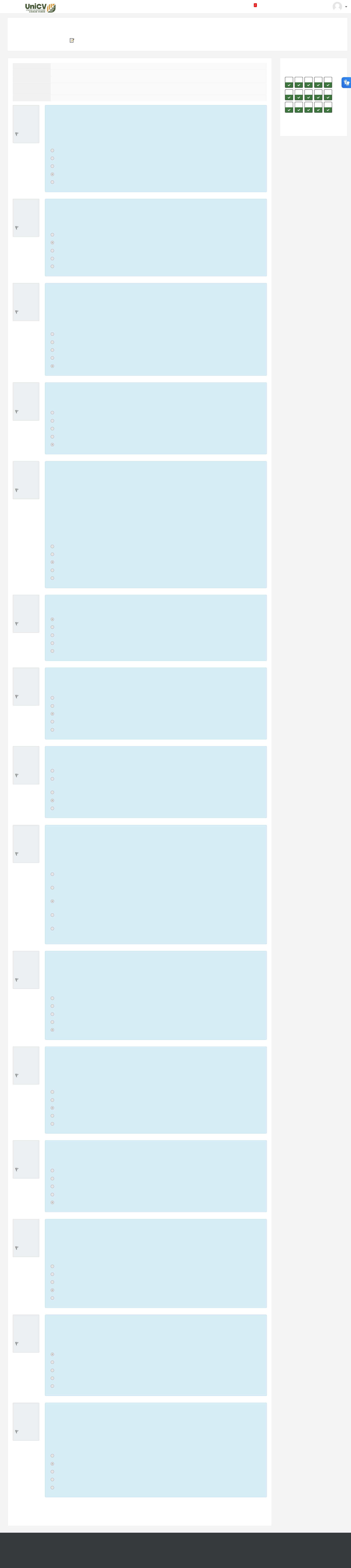 Você acessou como LEONARDO ANTÔNIO DA SILVA ALVES (Sair) TCRC Painel / Meus cursos / TCRC / 📝 AVALIAÇÕES 2024/1 / PROVA - AVP2024/1 Tipos de Conexão Questão 1 Correto Atingiu 0,40 de 0,40 Marcar questão Questão 2 Correto Atingiu 0,40 de 0,40 Marcar questão Questão 3 Correto Atingiu 0,40 de 0,40 Marcar questão Questão 4 Correto Atingiu 0,40 de 0,40 Marcar questão Questão 5 Correto Atingiu 0,40 de 0,40 Marcar questão Questão 6 Correto Atingiu 0,40 de 0,40 Marcar questão Questão 7 Correto Atingiu 0,40 de 0,40 Marcar questão Questão 8 Correto Atingiu 0,40 de 0,40 Marcar questão Questão 9 Correto Atingiu 0,40 de 0,40 Marcar questão Questão 10 Correto Atingiu 0,40 de 0,40 Marcar questão Questão 11 Correto Atingiu 0,40 de 0,40 Marcar questão Questão 12 Correto Atingiu 0,40 de 0,40 Marcar questão Questão 13 Correto Atingiu 0,40 de 0,40 Marcar questão Questão 14 Correto Atingiu 0,40 de 0,40 Marcar questão Questão 15 Correto Atingiu 0,40 de 0,40 Marcar questão Terminar revisão Iniciado em domingo, 10 mar 2024, 10:12 Estado Finalizada Concluída em domingo, 10 mar 2024, 10:28 Tempo empregado 16 minutos 25 segundos Avaliar 6,00 de um máximo de 6,00(100%) A modulação PSK, ou por chaveamento de fase de uma portadora, define os símbolos a partir de trechos de sinal da portadora com determinada fase e tem diferentes esquemas de modulação. Marque a opção referente aos esquemas de modulação PSK: Escolha uma opção: a. 16PSK, BPSK e 16QAM. b. QPSK, QAM e 8PSK. c. 16PSK, BPSK e 8QAM. d. BPSK, QPSK e 8PSK. e. BPSK, 8PSK e 8QAM. A infraestrutura de rede é um item crucial em empresas, pois uma rede mal estruturada pode causar diversos problemas. Ao longo da evolução da tecnologia, algumas medidas foram tomadas a fim de padronizar uma infraestrutura de rede. Surgiu, então, a NBR 16264. Sobre essa norma, assinale a alternativa correta. Escolha uma opção: a. A NBR 16264 apenas estipula normas para padronização de redes domésticas. b. A NBR 16264 especifica uma infraestrutura de cabeamento para três grupos de aplicações. c. A NBR 16264 é uma norma de padrões internacionais e a versão NBR é a tradução para a língua portuguesa. d. A NBR 16264 foi descontinuada e substituída pela ISO 9000. e. A NBR 16264 estipula requisitos elencados por um comitê exclusivo de tecnologia da informação. Esquemas de modulação em M-ário podem ser aproveitados para ampliar a taxa de transmissão de dados sem afetar a largura de banda necessária. Considerando a taxa de dados de 2.500bps, determine quantos bits são necessários para manter uma largura de banda menor que 1.000Hz. Escolha uma opção: a. 1. b. 5. c. 2. d. 4. e. 3. Dentre os tipos de cabos de par trançado, temos os cabos UTP e STP. Analise as alternativas e marque aquela que mostra CORRETAMENTE a diferença entre eles. Escolha uma opção: a. O cabo STP é o cabo sem blindagem, e o UTP é o cabo com blindagem b. O cabo STP possui dois pares de fios, e o cabo UTP possui quatro pares de fios. c. O cabo STP possui capa azul, e o cabo UTP possui capa verde. d. O cabo STP tem o limite de distância de 120 metros, e o cabo UTP tem limite de distância de 100 metros. e. O cabo STP é o cabo com proteção, e o UTP é o cabo sem proteção Conforme as empresas vão usando a tecnologia da internet denominada extranet para melhorar a comunicação com clientes e parceiros, vão adquirindo mais vantagem competitiva ao longo do caminho – em desenvolvimento de produtos, economia de custos, marketing, distribuição e aperfeiçoamento das parcerias. Neste contexto, as extranets são ligações de rede que utilizam tecnologia da internet para interconectar a intranet de uma empresa com as intranets de clientes, fornecedores ou outros parceiros comerciais. Analise as afirmações a seguir que tratam a respeito das extranets: I. A extranet de uma empresa pode ligar ao mesmo tempo a organização a apenas um parceiro de negócio específico. II. As tecnologias de firewall e criptografia não podem ser usadas nas extranets, pois ela extrapola o ambiente tecnológico da empresa. III. O processo on-line e interativo de desenvolvimento e marketing de produtos voltados ao cliente é facilitado pela utilização de uma extranet. Está CORRETO SOMENTE o que se afirma em: Escolha uma opção: a. II. b. I e II. c. III. d. II e III. e. I. O que ocorre quando um sistema concede a um aplicativo o uso exclusivo da rede? Escolha uma opção: a. Isso irá bloquear o uso de outros computadores por um período indeterminado de tempo. b. Aumenta a velocidade da rede. c. Derruba o firewall de uma rede. d. Prejudica as placas de rede. e. É a atribuição de uma política de prioridade. Uma rede comutada é formada por uma série de nós interligados, denominados comutadores. Tradicionalmente, existem três métodos importantes de comutação, que são: Escolha uma opção: a. Comutação de pacotes, comutação de datagramas e comutação de mensagens. b. Comutação analógica, comutação digital e comutação de sinais. c. Comutação de circuitos, comutação de pacotes e comutação de mensagens. d. Comutação de circuito analógico, comutação de pacotes e comutação de mensagens. e. Comutação por dispositivos lógicos, comutação por dispositivos físicos e comutação de dispositivos intermediários. O que é o acesso justo de pacotes? Escolha uma opção: a. A rede permite somente a transmissão de pacotes específicos. b. A rede permite o acesso exclusivo de uma aplicação, ou seja, o sistema de rede não permite o uso de outros computadores. c. Pacotes enviados a toda a rede. d. Quando a rede permite o uso de outros computadores, evitando o acesso exclusivo. e. Pacotes enviados somente ao computador de destino. O surgimento das aplicações e tecnologias de rede par a par (peer-to-peer) para internet vem sendo aclamado como o desenvolvimento de maior impacto no comércio eletrônico, nos negócios eletrônicos e na