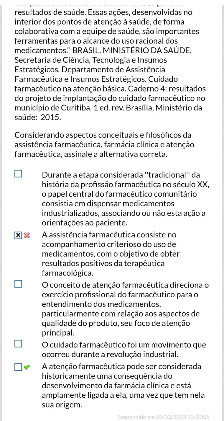 ficos da assistência farmacêutica, farmácia clínica e atenção farmacêutica, assinale a alternativa correta. Durante a etapa considerada 'tradicional' da história da profissão farmacêutica no século XX, o papel central do farmacêutico comunitário consistia em dispensar medicamentos industrializados, associando ou não esta ação a orientações ao paciente. A assistência farmacêutica consiste no acompanhamento criterioso do uso de medicamentos, com o objetivo de obter resultados positivos da terapêutica farmacológica. conceito de atenção farmacêutica direciona o exercício profissional do farmacêutico para o entendimento dos medicamentos, particularmente com relação aos aspectos de qualidade do produto, seu foco de atenção principal. cuidado farmacêutico foi um movimento que ocorreu durante a revolução industrial. A atenção farmacêutica pode ser considerada historicamente uma consequência do desenvolvimento da farmácia clínica e está amplamente ligada a ela, uma vez que tem nela sua origem. Respondido em 28/03/2023 22:30:05