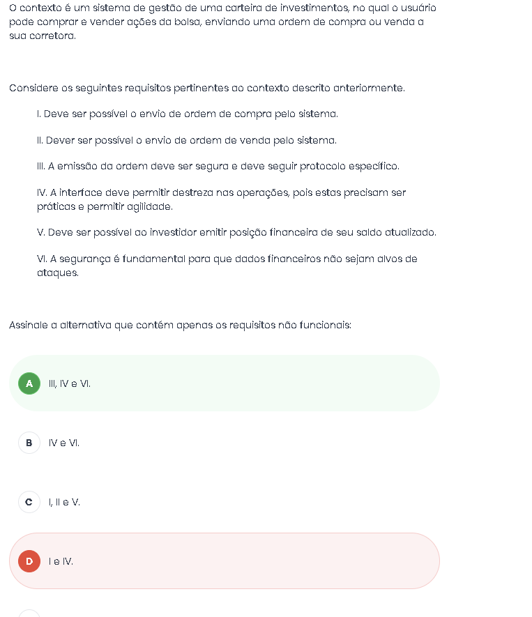 Considere os seguintes requisitos pertinentes ao contexto descrito anteriormente. I. Deve ser possível O envio de ordem de compra pelo II. Dever ser possível envio de ordem de venda pelo III. A emissão da ordem deve ser segura e deve seguir protocolo específico. IV. A interface deve permitir destreza nas operações, pois estas precisam ser práticas e permitir agilidade. V. Deve ser possível ao investidor emitir posição financeira de seu saldo atualizado. VI. A segurança é fundamental para que dados financeiros não sejam alvos de ataques. Assinale a alternativa que contém apenas os requisitos não A IV e VI. B IV e c I, e V. D IV.