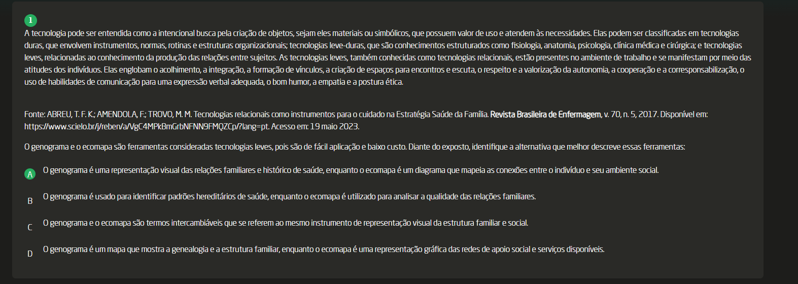 Diante do exposto, identifique a alternativa que melhor descreve essas ferramentas: A 0 genograma é uma representação visual das relações familiares e histórico de saúde, enquanto ecomapa é um diagrama que mapeia as conexões entre indivíduo e seu ambiente social. 0 genograma é usado para identificar padrões hereditários de saúde, enquanto ecomapa é utilizado para analisar a qualidade das relações familiares. 0 genograma e ecomapa são termos intercambiáveis que se referem ao mesmo instrumento de representação visual da estrutura familiar e social. D 0 genograma é um mapa que mostra a genealogia e a estrutura familiar, enquanto ecomapa é uma representação gráfica das redes de apoio social e serviços disponíveis.