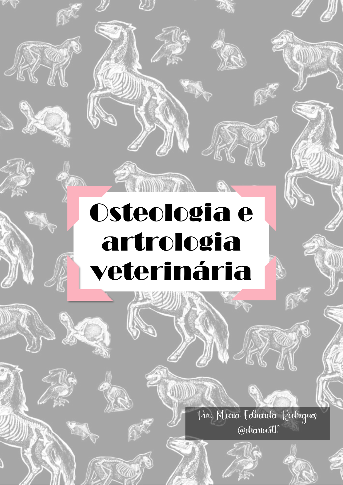 Osteologia e artrologia veterinária Por: Maria Eduarda Rodrigues @diariovett @diariovett 2 Sumário Introdução...........................................................................................................................................................03 Planos e eixos....................................................................................................................................................07 Esqueleto...............................................................................................................................................................10 Ossos da cabeça..........................................................................................................................................15 Vértebras.............................................................................................................................................................26 Costela e esterno...........................................................................................................................................31 Membro torácico...........................................................................................................................................34 Membro pélvico..............................................................................................................................................41 Artrologia.............................................................................................................................................................48 @diariovett 3 Introdução O esqueleto pode ser dividido em: Axial: composto por crânio, coluna vertebral, costela e esterno. Apendicular: composto por ossos dos membros torácico e pélvico. Visceral: composto por ossos desenvolvidos na substância de alguma das vísceras ou costas e externo. Funções dos ossos: 1. Sustentação; 2. Dar forma ao corpo do animal; 3. Suporte para músculos e outros tecidos; 4. Depósito de minerais; 5. Formação da célula sanguínea; 6. Locomoção. Classificação dos ossos: 1. Ossos longos/compridos: possuem comprimento maior que a largura. Possuem um corpo (diáfise) e duas extremidades (epífise). Esses ossos atuam como alavanca, tendo papel Axial Apendicular Visceral @diariovett 4 importante no movimento do corpo (ex: úmero, rádio, ulna, metacarpo e fêmur. 2. Ossos curtos: são ossos em que possuem comprimento, largura e espessura diferentes. Possuem a função de absorção de choques (ex: ossos do tarso e carpo). 3. Ossos alongados: são ossos longos, entretanto, são achatados e não apresentam cavidade medular (ex: costelas e fíbula). 4. Ossos irregulares: possuem formato irregular, com diversas funções. Geralmente estão situados no plano médio (ex: vértebras, mandíbula, sacro e alguns ossos cranianos). 5. Ossos planos/chatos: possuem comprimento e largura iguais em relação à espessura e tem como função a proteção de órgãos vitais (ex: escápula, alguns ossos do crânio). 6. Ossos sesamoides: são ossos inseridos em tendões ou ligamentos, fornecendo apoio extra e reduzindo a pressão sobre o restante do tecido (ex: patela e ossos sesamóideo da face palmar). 7. Ossos pneumáticos: apresentam uma ou mais cavidades de volume variável, revestidas de mucosa e contendo ar em seu interior (ex: ossos frontal, temporal, etmóide, esferoide e palatino). Camadas do osso: Periósteo: camada mais externa, composta por uma membrana fina e fibrosa que envolve o osso, exceto nas regiões de articulação (epífise). Protege o osso, servindo como ponto de fixação para músculos e tendões. Contém vasos que nutrem o osso subjacente. Osso compacto: composto por cálcio, fósforo e fibras de colágeno que dão resistência. É a parte mias rígida do osso, formada por pequenos canais onde circulam os nervos e vasos. Osso esponjoso: é uma camada menos densa do osso. Em alguns ossos apenas essa estrutura está presente e pode conter a medula óssea. Camada medular: é a cavidade onde se encontra a medula óssea, geralmente presente nos ossos longos. @diariovett 5 Medula óssea: é responsável pela produção de células sanguíneas (medula vermelha) e armazenamento de gordura (medula amarela). Contornos e acidentes ósseos: A superfície dos ossos apresenta áreas irregulares, com saliências e depressões. Os acidentes dos ossos servem, como superfície de articulação com ossos vizinhos, como ponto de inserção de tendões e ligamentos ou ainda são impressões deixadas pelo contato próximo com outros órgãos. As saliências articulares proeminentes são denominadas de côndilo, cabeça, capítulo, tróclea ou dente. Saliências ósseas que servem para a inserção de tendões ou ligamentos recebem diferentes denominações, tais como: túber, tubérculo, tuberosidade, maléolo, trocânter, processo. As saliências lineares são denominadas de: linhas, crista, espinha e promontório. Freas lisas na superfície óssea, articulares ou não, são conhecidas como: Asa, ramo ou lâmina. Depressões, articulares ou não, são denominadas: cavidades, fossas, fossetas ou fóveas. Já as Fissuras, incisura, sulco, colo, arco e canal, são denominações que indicam os vários tipos de depressões não articulares encontradas nos ossos. @diariovett 6 Um buraco no osso é denominado forame e, geralmente, ele dá passagem a um vaso sanguíneo (ex: Forame nutrício). @diariovett 7 Planos e eixos Planos: -> Cranial: refere-se a partes do corpo que estão indo em direção ao crânio do animal. -> Caudal: refere-se a partes do corpo que estão indo em direção a cauda do animal. -> Dorsal: refere-se a partes do corpo que estão indo em direção ao dorso do animal. -> Ventral: refere-se a partes do corpo que estão indo em direção ao ventre do animal. -> Distal: refere-se a partes do corpo que estão longe do centro do corpo. -> Proximal: refere-se a partes do corpo que estão próximas do cen