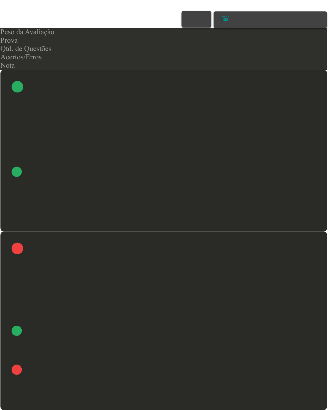 11/03/2024, 11:41 Avaliação II - Individual about:blank 1/4 Prova Impressa GABARITO | Avaliação II - Individual (Cod.:740007) Peso da Avaliação 1,50 Prova 43175670 Qtd. de Questões 10 Acertos/Erros 8/2 Nota 8,00 As bases ou hidróxidos são funções inorgânicas que apresentam altos valores na escala de pH (potencial hidrogeniônico), variando de oito a quatorze. O grupo funcional que está presente como único ânion nas bases ou hidróxidos é a hidroxila ou hidróxido (OH-). As bases ou hidróxidos podem ser classificadas em monobases, dibases, tribases ou tetrabases, quanto ao número de hidroxilas ou hidróxidos presentes em composição molecular. Com relação à classificação citada, sobre o hidróxido de sódio (NaOH), uma base conhecida como soda cáustica, muito utilizada em limpezas pesadas e desentupimentos, assinale a alternativa CORRETA: A Tetrabase. B Monobase. C Tribase. D Dibase. Os ácidos são funções inorgânicas que podem ser classificadas por diversos critérios. Um dos critérios de classificação dos ácidos é o número de elementos diferentes. Com relação à classificação dos ácidos quanto ao número de elementos diferentes, analise as sentenças a seguir: I- Quaternários são ácidos que apresentam quatro hidrogênios ionizáveis. II- Binários são ácidos que apresentam dois elementos diferentes em sua composição. III- Ácidos com três elementos diferentes são classificados como terciários. Agora, assinale a alternativa CORRETA: A As sentenças II e III estão corretas. B As sentenças I e III estão corretas. C Somente a sentença II está correta. D Somente a sentença I está correta. VOLTAR A+ Alterar modo de visualização 1 2 11/03/2024, 11:41 Avaliação II - Individual about:blank 2/4 O sulfato de hidrogênio (H2SO4) é um líquido incolor, oleoso e solúvel em água, formado da solução aquosa denominada de ácido sulfúrico. Esse ácido é muito importante em todos os setores da química e, por isso, é fabricado em grandes quantidades. Um dos indicadores do desenvolvimento econômico de um país é o consumo desse ácido. Ele é usado, por exemplo, na fabricação de fertilizantes, velas, explosivos, corantes e baterias de automóveis. Quando concentrado é um poderoso oxidante e desidratante; açúcares, algodão, papel, madeira e tecidos podem ser destruídos por sua ação desidratante. Como esse ácido é classificado com relação ao número de hidrogênios ionizáveis, quanto à presença de oxigênio e força? A Diácido, oxiácido e fraco. B Triácido, oxiácido e fraco. C Diácido, oxiácido e forte. D Triácido, oxiácido e forte. As funções inorgânicas englobam inúmeros compostos, do reino mineral, que estão presentes em nosso cotidiano. Além das propriedades físico-químicas, a composição molecular é um fator primordial para diferenciá-las. Associe os itens, utilizando o código a seguir e depois assinale a alternativa que apresenta a sequência CORRETA: A III - I - II - IV. B IV - II - III - I. C II - III - IV - I. D I - IV - III - II. A força de um ácido está relacionada com o grau de ionização, que é a relação entre o número de moléculas que se ionizaram e o número total de moléculas iniciais. Assinale a alternativa CORRETA: A Regra prática para força dos Hidrácidos: apenas o HCl (ácido clorídrico), o HBr (ácido bromídrico) e o HI (ácido iodídrico) são fracos. B Regra prática para força dos Oxiácidos: Fracos: número de Oxigênios - número de Hidrogênios = 1 ou 2. Fortes: número de Oxigênios - número de Hidrogênios = 4 ou 5. C Regra prática para força dos Hidrácidos: apenas o HF (ácido fluorídrico) é moderado. D Regra prática para força dos Oxiácidos: apenas o HSCN (ácido tiocianídrico) e o HCN (ácidos cianídro) são fortes. 3 4 5 11/03/2024, 11:41 Avaliação II - Individual about:blank 3/4 Podemos classificar os ácidos quanto ao número de hidrogênios ionizáveis, quanto ao número de elementos constituintes, e quanto à presença de oxigênio na molécula. Nesse sentido, qual dos ácidos listados pode ser considerado um diácido, ternário e oxiácido ao mesmo tempo? A HNO3. B H2S. C H2SO4. D H3PO4. As funções inorgânicas óxidos são definidas como compostos binários em que o elemento químico oxigênio é o segundo elemento e o mais eletronegativo em sua composição molecular. Sobre as funções inorgânicas óxidos, analise as sentenças a seguir: I- O CaO recebe o nome de óxido de cálcio. II- O dióxido de carbono é classificado como trióxido. III- O LiO é classificado como um monóxido. IV- O NaClO é um móxido ternário. Agora, assinale a alternativa CORRETA: A Somente a sentença I está correta. B Somente a sentença III está correta. C As sentenças I, II e IV estão corretas. D As sentenças I e III estão corretas. No que tange às funções inorgânicas, existem quatro importantes funções: Ácidos, Bases ou Hidróxidos, Sais e Óxidos. Os ácidos podem ser classificados através de alguns critérios: quanto ao número de elementos diferentes, quanto ao número de hidrogênios ionizáveis, quanto à presença de oxigênio e quanto à força. Considerando a definição de um ácido classificado como Oxiácido, assinale a alternativa CORRETA: A Ácidos que possuem oxigênio na molécula. Exemplo: H2SO4 (ácido sulfúrico). B Apresentam quatro hidroxilas em sua fórmula molecular. Exemplo: Pb(OH)4. C Apresentam duas hidroxilas em sua fórmula molecular. Exemplo: Pb(OH)4. D Ácidos que não possuem oxigênio na molécula. Exemplo: HF (ácido fluorídrico). 6 7 8 11/03/2024, 11:41 Avaliação II - Individual about:blank 4/4 Companhias que fabricam jeans usam cloro para o clareamento, seguido de lavagem. Algumas estão substituindo o cloro por substâncias ambientalmente mais seguras como peróxidos, que podem ser degradados por enzimas chamadas peroxidases. Pensando nisso, pesquisadores inseriram genes codificadores de peroxidase
