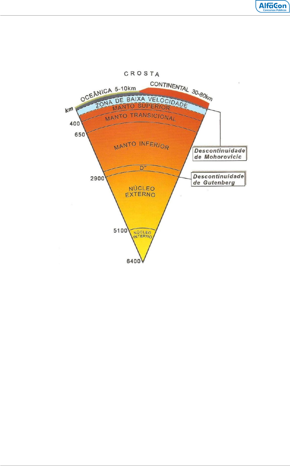 alfaconcursos.com.br MUDE SUA VIDA! 5 subdivididos em 4 camadas de construção diferentes, partindo do centro para a periferia temos um núcleo, um manto e uma crosta. A imagem mostra a estrutura interna da Terra no modelo clássico de primeira ordem, em camadas concêntricas, obtido a partir das velocidades das ondas sísmicas. Mantêm-se as divisões na devida escala, exceto para as crostas e a zona de baixa velocidade. Fonte: TEIXEIRA, Wilson; TOLEDO, M. Cristina Motta de; FAIRCHILD, Thomas Rich; TAIOLI, Fábio. Decifrando a Terra. Companhia Editora Nacional. São Paulo: 2008. O Núcleo Interno, com profundidade entre 5.100 a 6.378 Km, constitui a parte central e mais densa. Está separado do núcleo externo pela Descontinuidade de Lehmann. Por ser sólido, é chamado de “a semente da Terra”. É constituindo por níquel e ferro (NIFE) e sua temperatura atinge até 6000°C. O Núcleo Externo com profundidade de 2.900 a 5.100 Km atinge temperaturas de até 5.000°C e é composto por material pastoso com menores densidades que o material do manto. Está separado do manto pela Descontinuidade de Gutenberg-Wiechert. O Manto, com profundidade de 50 a 2.900Km atinge temperatura de até 3000°C e representa 83% do volume total do globo. É composto por material pastoso e é separado da crosta pela Descontinuidade de Mohorovicic (ou Moho). Sua parte superior, em contato com a crosta rígida é denominado de Astenosfera. Nela ocorrem as correntes de convecção, que correspondem ao movimento realizado pelo magma proveniente das camadas mais profundas do planeta em direção à crosta. Esse movimento é determinante para a movimentação das placas tectônicas, resultantes da fragmentação da crosta. A Crosta, também denominada como Litosfera, é a parte mais externa e está em contato com a atmosfera, a hidrosfera e a biosfera. Divide-se em: CROSTA CONTINENTAL: com espessura variando de 30 – 80 km, composta por rochas muito antigas e menos densas onde predominam o silício e o alumínio (SIAL) na parte superior, com temperaturas variando conforme o grau geotérmico e, na parte inferior, o predomínio dos silicatos de magnésio (SIMA), por serem de maior densidade, e com temperaturas podendo chegar aos 600°C. https://www.alfaconcursos.com.br/ alfaconcursos.com.br MUDE SUA VIDA! 6 CROSTA OCEÂNICA: com rochas densas e espessura inferior a 10 km, mais recentes e principalmente basálticas. A atividade vulcânica é bem mais intensa que na crosta continental. AS ÁREAS DE DESCONTINUIDADE Entre as diversas camadas internas do planeta, existem áreas que apresentam diferenças de densidade e de composição, dando origem às camadas de descontinuidade: locais onde há mudanças rápidas na velocidade de propagação das ondas sísmicas que se deslocam pelo interior da Terra. Foi por meio das descontinuidades que se provaram as modificações na composição mineralógica do planeta. As principais descontinuidades estabelecidas são as seguintes: Mohorovicic (entre a crosta e o manto): sua profundidade depende do local, pois a espessura da crosta varia entre 5 e 10 km (para a crosta oceânica) e entre 35 e 70 km (para a crosta continental); separa materiais silicáticos com maior participação do Al (a crosta) dos materiais também silicáticos com menor participação de Al e maior de Fe e Mg (o manto). Gutenberg (entre o manto e o núcleo externo; 2900 km de profundidade): separa materiais silicáticos do manto dos materiais metálicos (Fe e Ni) do núcleo. Lehman (entre o núcleo externo e o núcleo interno; 5100 km de profundidade): marca a mudança de estado físico dentro do núcleo; a parte externa, líquida, é composta por Fe e Ni, com participação de elementos químicos mais leves, como O, Na, Mg e S; a parte interna, sólida, é constituída por Fe e Ni. DERIVA CONTINENTAL E TECTÔNICA DE PLACAS Em 1912, o geólogo alemão Alfred Wegener apresentou a teoria da Deriva Continental na qual propunha que antes do início do Jurássico todas as terras continentais estavam reunidas em um só continente por ele denominado Pangeia, circundado por um oceano chamado Pantalassa que seria o antepassado do Pacífico. https://www.alfaconcursos.com.br/