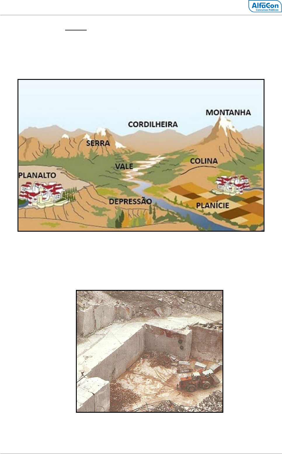 alfaconcursos.com.br MUDE SUA VIDA! 4 A denominação SERRA é usada na descrição da paisagem física de terrenos acidentados com fortes desníveis. No Brasil, elas designam, às vezes, acidentes variados, como escarpas de planaltos. As serras são às vezes divididas quanto a sua extensão em serras curtas e serras longas. GUERRA, Antonio J.T. Novo Dicionário Geológico-Geomorfológico. Rio de Janeiro: Bertrand Brasil, 2008. FORMAS DO RELEVO ROCHAS São agregados de diversos minerais cujos processos de formação ocorrem naturalmente na superfície terrestre. Existem algumas rochas que são formadas por um único mineral, como é o caso do calcário. Quanto à gênese são classificadas em magmáticas / ígneas, sedimentares e metamórficas. Jazida de mármore em Carrara, na Itália. MINERAL é uma massa inorgânica natural, de composição química definida, com um ou vários tipos de cristalização. Os minerais compõem as rochas que constituem a https://www.alfaconcursos.com.br/ alfaconcursos.com.br MUDE SUA VIDA! 5 litosfera. Pode-se, pois, definir rocha como um conjunto de minerais ou apenas como um mineral consolidado. GUERRA, Antonio J.T. Novo Dicionário Geológico-Geomorfológico. Rio de Janeiro: Bertrand Brasil, 2008.p.428. ROCHAS MAGMÁTICAS As rochas magmáticas podem se formar lentamente no interior da crosta pela solidificação do magma, sendo chamadas, nesse caso de intrusivas (plutônicas ou abissais). As rochas magmáticas chamadas de extrusivas (vulcânicas ou efusivas) se consolidam na superfície por meio de vulcões ou de fendas na litosfera e, em contato com a atmosfera, resfriam-se mais rapidamente. ROCHAS SEDIMENTARES Qualquer rocha exposta à ação do vento, da chuva, da temperatura passa a sofrer a ação do intemperismo, ou seja, do conjunto de processos mecânicos, biológicos ou químicos que provocam a desintegração das rochas. Quando as rochas perdem a coesão, seus sedimentos passam a ser transportados por diferentes agentes, como vento, a chuva e a gravidade. Esse processo é conhecido como erosão. A deposição desse material em outro ambiente é denominada sedimentação. Formadas pela desagregação e/ou decomposição de outras rochas, as rochas sedimentares são subdivididas de acordo com a sua origem em: Detríticas: originadas pela desagregação, decomposição, transporte e deposição de detritos de outras rochas. Ex.: arenito e argilito; Orgânicas: formadas pelo acúmulo de detritos orgânicos. Ex.: carvão mineral (decomposição de matéria orgânica vegetal); Químicas: originadas pela decomposição de sedimentos por processos químicos. Ex.: calcário (decomposição de corais). ROCHAS METAMÓRFICAS Todas as rochas podem ser levadas a condições geológicas diferentes daquelas nas quais se formaram. O metamorfismo é o processo por meio do qual rochas ígneas, sedimentares ou mesmo metamórficas sofrem transformação na composição mineralógica, na estrutura e textura, no estado sólido, em resposta às novas condições físico-químicas que diferem das que prevaleciam durante sua formação. As rochas que passam por este processo são denominadas rochas metamórficas. Estas novas condições sempre provocam mudanças na textura e podem ou não alterar a composição mineralógica. Pode ocorrer recristalização dos minerais preexistentes ou formação de novos minerais e deformações. Graças às condições de pressão dirigida num determinado sentido, a textura resultante mais comum é a orientada ou xistosa, caracterizada pelo arranjo de todos ou de alguns dos minerais segundo planos paralelos. As rochas que apresentam esta estrutura xistosa bem desenvolvida são denominadas xistos. https://www.alfaconcursos.com.br/