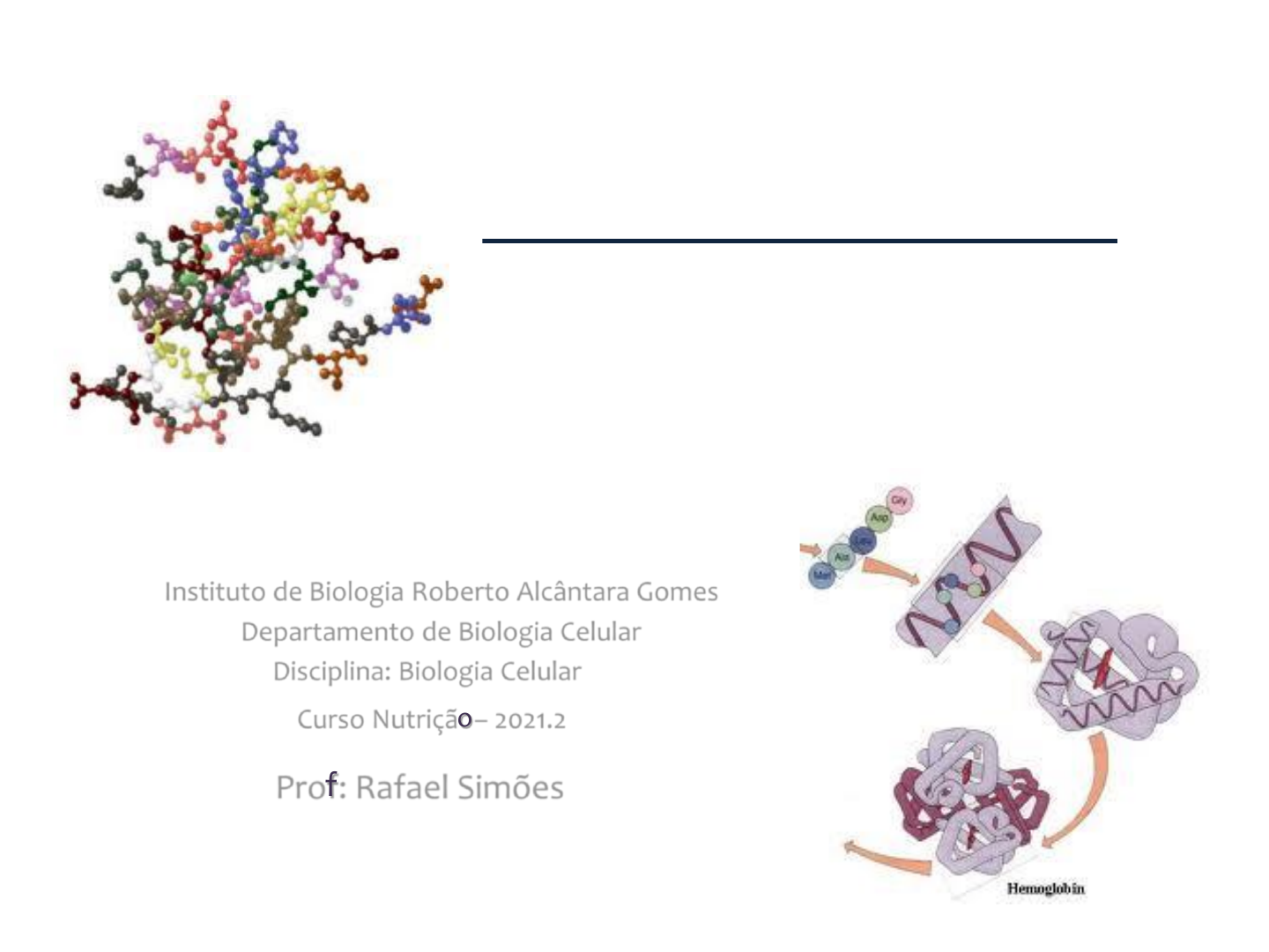 Aminoácidos e Proteínas estrutura, conformação e propriedades químicas Instituto de Biologia Roberto Alcântara Gomes Departamento de Biologia Celular Disciplina: Biologia Celular Curso Nutrição– 2021.2 Prof: Rafael Simões Uma Célula é Composta de Proteínas Lipídeos, Carboidratos e Ácidos Nucleicos Unidades estruturais básicas - células Macromoléculas (proteínas, ácidos nucléicos e polissacarídeos) Subunidades monoméricas (aa, nucleotídeos e monossacarídeos) ➢ Proteínas são as macromoléculas mais abundantes nas células vivas e constituem 50% ou mais do seu peso seco; Proteínas Proteínas Possuem Funções Diversas Proteínas são moléculas com as mais variadas funções no organismo Catalítica Enzimas Regulação gênica Histonas Contração Actina e miosina Protetora imunoglobulinas Estrutural Colágeno, elastina, queratina Transporte Albumina, hemoglobina, transferrina Hormonal Insulina Regulatória Calmodulina ➢ As proteínas são construídas com subunidades monoméricas, denominadas aminoácidos Aminoácidos (proteínas) Componentes dos ácidos nucleicos Componentes dos lipídeos Monossacarídeos (açúcares) Todas as proteínas são constituídas com o mesmo conjunto de aminoácidos, unidos covalentemente em sequências características. ➢Os aminoácidos primários receberam abreviações de três letras, ou um símbolo de uma única letra, que são usados para indicar a composição e sequência dos aminoácidos em cadeias polipeptídicas. ➢Os aminoácidos têm características estruturais comuns a todos. ➢Todos tem em comum um grupo carboxila e um grupo amino, ligados ao mesmo átomo de carbono. Glicina ➢Os aminoácidos podem ser classificados com base em seus grupos R ➢Os aminoácidos podem ser classificados com base em seus grupos R ➢Os aminoácidos estão ionizados em solução aquosa e podem agir como ácidos ou bases. Forma não ionizada Forma ionizada Pergunta!! www.menti.com Código 2739 4221 http://www.menti.com/ Se Aminoácidos podem agir como ácidos e bases, podemos concluir que eles podem agir como um bom composto... A) Desnaturante B) Tampão C) Quebra-galho Código 2739 4221 ➢Os aminoácidos estão ionizados em solução aquosa e podem agir como ácidos ou bases. Forma não ionizada Forma ionizada Um tampão é definido como um composto ou conjunto de compostos que impedem variações da concentração de [H+], ou seja do pH, do meio. Aminoácidos, peptídeos e proteínas são bons tampões ➢Relembrando.... concentração de OH- [OH-] [H+] [OH-] [H+] + H H+OH- + H20 Fontes de H+ decorrentes dos processos metabólicos Powers,S.K. e Howley, E.T., Fisiologia do Exercício, (2000), pg207 Fig11.3 H+ Ácido Fosfórico Hidrólise das fosfoproteínas e nucleoproteínas Metabolismo aeróbico da glicose Ácido Carbônico Ácido Sulfúrico Oxidação de Amino ácidos Sulfurados Metabolismo anaeróbico da glicose Ácido Lático Corpos Cetônicos Ácidos Oxidação incompleta de ácidos graxos Os aminoácidos têm curvas de titulação características - P.I – Ponto isoelétrico: pH onde a carga líquida dos aa é zero. É calculado pela média entre o Pka do grupo amino e o Pka do grupo carboxila. [OH-] H+ H+H+ [OH-] [OH-][OH-] - Aminoácidos podem perder até 2 prótons para o meio Logo... a função das proteínas depende do pH ao qual estão submetidas pKa: tendência de um grupo fornecer um próton ao meio pI = 3,22 O PI de aa com radicais ionizáveis é calculado pela média entre o pka do radical e o pka de valor mais próximo. pKr = 4,25 pK1= 2,19 ➢AA com o radical R ionizável [OH-] [OH-][OH-] pI = 7,59 pKr = 6 pK2= 9,17 Caráter ácido-básico dos aminoácidos PI < 7 - ácido PI = 7 - neutro PI > 7 - básico PI = 3,22 PI = 7,59 ➢Carga líquida do aa e o pH da solução 0 - - - - - - - - - - - - - - - - - + ++ +++ +++++ pH>pI pH=pI pH<pI ➢Os peptídeos são cadeias de aminoácidos Pergunta!! www.menti.com Código 2739 4221 http://www.menti.com/ Qual o nome dessa ligação? A) Telefônica B) Glicosídica C) Peptídica Código 2739 4221 ➢Os peptídeos são cadeias de aminoácidos Ligação peptídica ➢A estrututura protéica pode ser dividida em quatro níveis principais: 1- Estrtutura primária: sequência de aminoácidos *Folha β : as cadeias peptídicas se arranjam lado a lado e as pontes de hidrogênio formadas entre segmentos adjacentes *α-hélice – os aa se enovelam ao redor de um eixo imaginário. Os grupos R se projetam pra fora e a “torção” é dada pelas ligações de hidrogênio formadas entre os grupo s N-H e C=O 2- Estrutura secundária: + = 3- Estrutura terciária: É o arranjo tridimensional da proteína e é mantida pelas interações entre os radicais R dos aa. Pontes dissulfeto, pontes de hidrogênio, forças hidrofóbicas, interação de van der walls, atrações iônicas,... 4- Estrtutura quaternária: Ocorre em proteínas formadas por mais de duas cadeias polipeptídica distintas. Estrutura e Função ➢ A sequência primária da proteína irá determinar como ela irá se arranjar no espaço, através das interações entre seus radicais R. ➢ E. Coli – proteína de 100 resíduos em 5 seg. + + + _ _ _ _ + + + + OBS : Nem sempre as proteínas conseguem alcançar sua correta conformação, precisando pra isso ajuda de chaperonas, família de proteínas que auxiliam o correto enovelamento protéico. Ex: Heat shock proteins - HSP Chaperonas Chaperonas Chaperoninas (Hsp60) ➢ O arranjo espacial é responsável pela função da proteína Sítio ativo Enzima aa hidrofóbicos + - aa negativos aa positivos Pergunta!! www.menti.com Código 2739 4221 http://www.menti.com/ E se essa proteína perde sua estrutura? Qual o nome que damos a perda da estrutura de uma proteína? A) Desabamento B) Derretimento C) Desnaturação Desnaturação: perda da estrutura terciária da proteína - perda da função. (não há alteração da estrutura primária) Renaturação: depende da sequência de aa