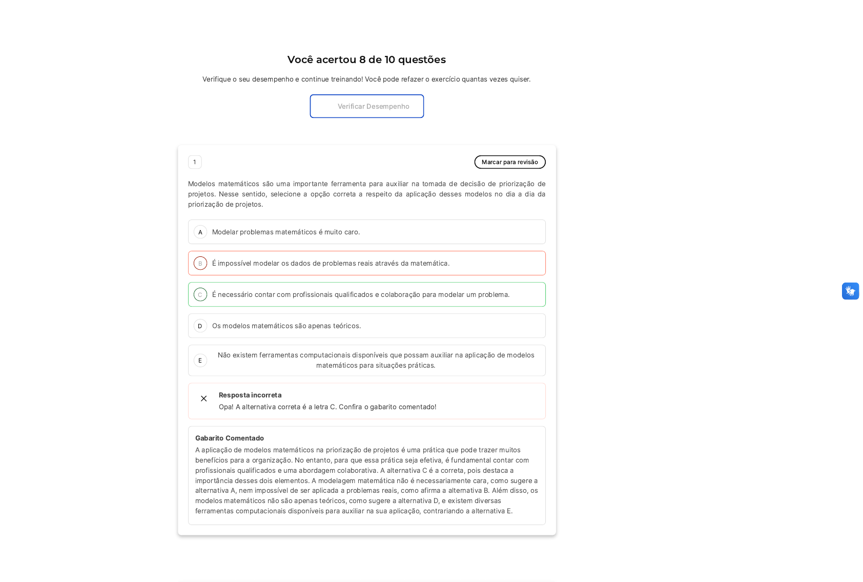 Você acertou 8 de 10 questões Verifique o seu desempenho e continue treinando! Você pode refazer o exercício quantas vezes quiser. Verificar Desempenho A B C D E 1 Marcar para revisão Modelos matemáticos são uma importante ferramenta para auxiliar na tomada de decisão de priorização de projetos. Nesse sentido, selecione a opção correta a respeito da aplicação desses modelos no dia a dia da priorização de projetos. Modelar problemas matemáticos é muito caro. É impossível modelar os dados de problemas reais através da matemática. É necessário contar com profissionais qualificados e colaboração para modelar um problema. Os modelos matemáticos são apenas teóricos. Não existem ferramentas computacionais disponíveis que possam auxiliar na aplicação de modelos matemáticos para situações práticas. Resposta incorreta Opa! A alternativa correta é a letra C. Confira o gabarito comentado! Gabarito Comentado A aplicação de modelos matemáticos na priorização de projetos é uma prática que pode trazer muitos benefícios para a organização. No entanto, para que essa prática seja efetiva, é fundamental contar com profissionais qualificados e uma abordagem colaborativa. A alternativa C é a correta, pois destaca a importância desses dois elementos. A modelagem matemática não é necessariamente cara, como sugere a alternativa A, nem impossível de ser aplicada a problemas reais, como afirma a alternativa B. Além disso, os modelos matemáticos não são apenas teóricos, como sugere a alternativa D, e existem diversas ferramentas computacionais disponíveis para auxiliar na sua aplicação, contrariando a alternativa E. A B C D E A B C 2 Desmarcar para revisão Selecione a opção correta que contenha a característica que encaixa na capacidade da organização reconhecer a necessidade de contextualizar ao plano estratégico o uso de sistemas de informação. Integrado. Consciente. Alinhado. Tático. Estratégico. Resposta correta Parabéns, você selecionou a alternativa correta. Confira o gabarito comentado! Gabarito Comentado A alternativa correta é "Consciente". Isso se deve ao fato de que, quando uma organização reconhece a necessidade de alinhar o uso de seus sistemas de informação ao seu plano estratégico, ela está demonstrando um nível de consciência estratégica. Esse alinhamento é crucial para que a organização possa atingir seus objetivos de maneira eficaz. Portanto, o termo "consciente" se refere à capacidade da organização de entender e aplicar essa necessidade de alinhamento entre os sistemas de informação e o plano estratégico. 3 Marcar para revisão Na Era da Informação, é imprescindível que conheçamos as metodologias ágeis e como a boa utilização delas pode contribuir para a melhoria contínua dos processos de uma organização. Em relação às metodologias ágeis, selecione a opção correta que se refere ao incremento de atividades de um projeto. Eficiência. Adaptabilidade. Colaboração. D E A B C D E Simplicidade. Objetividade. Resposta correta Parabéns, você selecionou a alternativa correta. Confira o gabarito comentado! Gabarito Comentado A alternativa correta é a "Adaptabilidade". Esta característica se refere à capacidade de um projeto se adaptar e incorporar novas atividades ou mudanças ao longo do seu desenvolvimento, o que é um aspecto fundamental das metodologias ágeis. Embora a eficiência, colaboração e simplicidade sejam também características importantes dessas metodologias, elas não estão diretamente relacionadas ao incremento de atividades em um projeto. Por outro lado, a objetividade não é uma característica diretamente associada às metodologias ágeis. 4 Marcar para revisão As metodologias ágeis dispõem de diversas métricas bem definidas. Selecione a opção que contenha a metodologia ágil que utiliza o conceito de sprints e backlogs. Backlog. Business Intelligence. Comunicação Ágil. Scrum. Kanban. Resposta correta Parabéns, você selecionou a alternativa correta. Confira o gabarito comentado! Gabarito Comentado A alternativa correta é a Scrum, uma metodologia ágil que emprega os conceitos de sprint e backlog para gerenciar eficientemente os itens do projeto. O sprint é um período de tempo durante o qual um trabalho específico deve ser concluído e pronto para revisão, enquanto o backlog é uma lista de tarefas que precisam ser concluídas. As outras opções apresentadas não se encaixam nesse contexto. Por exemplo, o Kanban é outra metodologia ágil, mas opera de maneira diferente. Por outro lado, backlog, Business Intelligence e Comunicação Ágil não são considerados metodologias ágeis. 5 Exercicio Introdução Aos Indicadores De Desempenho Sair A B C D E A B 5 Marcar para revisão Considere a seguinte situação: "Uma organização utiliza diversas ferramentas de TI que não são integradas" Agora, selecione a opção correta a respeito da efetividade competitiva em relação à organização da situação apresentada. O mero fato de fazer uso de ferramentas de TI já demonstra que a organização consegue manter a efetividade competitiva. A efetividade competitiva é um conceito subjetivo e, portanto, não é possível de ser medido. A efetividade competitiva é obtida por uma estratégia bem detalhada e não está relacionada ao uso de ferramentas de TI. O uso das ferramentas de TI deve ser feito de forma gradual dentro da organização para se atingir a efetividade competitiva. É necessário que o portfólio de TI esteja conectado e integrado ao plano estratégico, para que obtenha efetividade competitiva. Resposta correta Parabéns, você selecionou a alternativa correta. Confira o gabarito comentado! Gabarito Comentado A efetividade competitiva de uma organização não é garantida apenas pelo uso de ferramentas de TI, mas sim pela forma como essas ferramentas são utilizadas e integradas ao plano estratégico da organização. A alternativa E