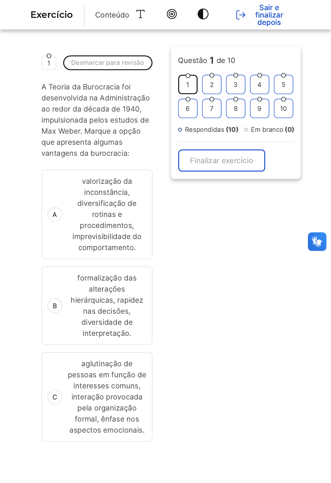 11/03/2024, 15:17 estacio.saladeavaliacoes.com.br/exercicio/65ef428f2a078bebef0ec1fd/ https://estacio.saladeavaliacoes.com.br/exercicio/65ef428f2a078bebef0ec1fd/ 1/11 A B C 1 Desmarcar para revisão A Teoria da Burocracia foi desenvolvida na Administração ao redor da década de 1940, impulsionada pelos estudos de Max Weber. Marque a opção que apresenta algumas vantagens da burocracia: valorização da inconstância, diversificação de rotinas e procedimentos, imprevisibilidade do comportamento. formalização das alterações hierárquicas, rapidez nas decisões, diversidade de interpretação. aglutinação de pessoas em função de interesses comuns, interação provocada pela organização formal, ênfase nos aspectos emocionais. Questão 1 de 10 Respondidas �10� Em branco �0� Finalizar exercício 1 2 3 4 5 6 7 8 9 10 Exercício Conteúdo Sair e finalizar depois 11/03/2024, 15:17 estacio.saladeavaliacoes.com.br/exercicio/65ef428f2a078bebef0ec1fd/ https://estacio.saladeavaliacoes.com.br/exercicio/65ef428f2a078bebef0ec1fd/ 2/11 D E A B C aumento do atrito entre as pessoas, diminuição dos dilemas organizacionais, controle adequado dos tempos e movimentos. precisão na definição do cargo e na operação, confiabilidade, continuidade da organização. 2 Desmarcar para revisão Não pode ser considerada uma característica da administração gerencial: Valorização do servidor. Centralização. Novas formas de organização para prestação de serviços. 11/03/2024, 15:17 estacio.saladeavaliacoes.com.br/exercicio/65ef428f2a078bebef0ec1fd/ https://estacio.saladeavaliacoes.com.br/exercicio/65ef428f2a078bebef0ec1fd/ 3/11 D E Controle dos resultados. Gestão direcionada ao cidadão. 3 Desmarcar para revisão A gestão pública empreendedora está voltada para os resultados, onde o foco é cidadão/cliente, baseados em parcerias, compromisso, responsabilidade, iniciativas etc., sempre respeitando os princípios da ética. Desta forma no âmbito da administração pública, o empreendedorismo pressupõe a incorporação de determinados comportamentos. Marque a resposta INCORRETA. 11/03/2024, 15:17 estacio.saladeavaliacoes.com.br/exercicio/65ef428f2a078bebef0ec1fd/ https://estacio.saladeavaliacoes.com.br/exercicio/65ef428f2a078bebef0ec1fd/ 4/11 A B C D E aumento de ganhos por meio de aplicações financeiras e ampliação da prestação de serviços remunerados. adoção de uma postura reativa, em detrimento da proativa, e elaboração de planejamento estratégico, de modo a antever problemas potenciais. criação de mecanismos de competição dentro das organizações públicas e entre organizações públicas e privadas. substituição do foco no controle dos inputs pelo controle dos outputs e seus impactos. participação dos cidadãos nos momentos de tomada de decisão. 11/03/2024, 15:17 estacio.saladeavaliacoes.com.br/exercicio/65ef428f2a078bebef0ec1fd/ https://estacio.saladeavaliacoes.com.br/exercicio/65ef428f2a078bebef0ec1fd/ 5/11 A B C D E 4 Desmarcar para revisão A Reforma Gerencial de 1995 contou com o Plano Diretor da Reforma do Aparelho do Estado (de 1995�. O Plano descreve quatro setores que fazem parte do aparelho do Estado. Assinale a alternativa incorreta: Núcleo estratégico. Poder político visando lucro. Produção de bens e serviços para o mercado. Serviços não exclusivos. Atividades exclusivas. 5 Desmarcar para revisão No modelo de Administração burocrática são adotadas medidas cujo objetivo é a defesa da coisa pública, em contraposição ao período patrimonialista antecedente, cuja característica principal é a confusão entre patrimônio 11/03/2024, 15:17 estacio.saladeavaliacoes.com.br/exercicio/65ef428f2a078bebef0ec1fd/ https://estacio.saladeavaliacoes.com.br/exercicio/65ef428f2a078bebef0ec1fd/ 6/11 A B C público, Estado, e o patrimônio particular do detentor do poder. Sobre administração patrimonialista no contexto brasileiro, marque a opção CERTA. No patrimonialismo a administração pública é totalmente voltada para o atendimento do cidadão. Intrinsecamente personalista, o modelo patrimonialista tende a desprezar a distinção entre a esfera púbica e privada. O modelo de administração patrimonialista caracteriza-se por possuir quadro de pessoal formado por servidores especialmente recrutados e treinados, que respondem de forma neutra aos políticos. 11/03/2024, 15:17 estacio.saladeavaliacoes.com.br/exercicio/65ef428f2a078bebef0ec1fd/ https://estacio.saladeavaliacoes.com.br/exercicio/65ef428f2a078bebef0ec1fd/ 7/11 D E A B C As principais características do modelo são o formalismo, o excesso de normas e a rigidez de procedimentos. A administração patrimonialista foi adotada na década de 30 para substituir a administração pública burocrática. 6 Desmarcar para revisão No Brasil, a administração burocrática teve início nos anos 30 a partir: Das metas estabelecidas pela ditadura militar. Da criação do Departamento Administrativo do Serviço Público �DASP� Da influência do governo britânico. 11/03/2024, 15:17 estacio.saladeavaliacoes.com.br/exercicio/65ef428f2a078bebef0ec1fd/ https://estacio.saladeavaliacoes.com.br/exercicio/65ef428f2a078bebef0ec1fd/ 8/11 D E A B C D E Da grande crise fiscal ocorrida nas Américas. Do Plano Diretor da Reforma do Aparelho do Estado. 7 Desmarcar para revisão A Administração Indireta não compreende: Sociedades de Economia Mista. Fundações públicas. Ministérios. Autarquias. Empresas Públicas. 8 Desmarcar para revisão De acordo as características da burocracia, marque a resposta Certa: 11/03/2024, 15:17 estacio.saladeavaliacoes.com.br/exercicio/65ef428f2a078bebef0ec1fd/ https://estacio.saladeavaliacoes.com.br/exercicio/65ef428f2a078bebef0ec1fd/ 9/11 A B C D E Divisão do trabalho, impessoalidade, informalidade. Qualificação do pessoal, meritocracia e morosidade Padronização, especialização e divisão do trabalho. Hierarquia, padronização e pessoalidade. Meritocr