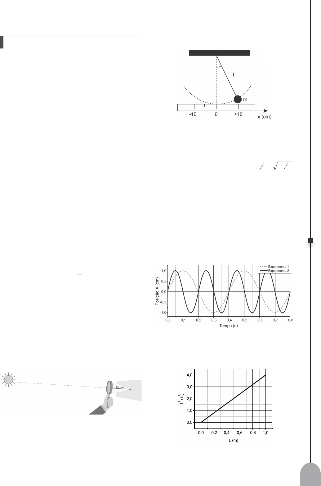 91 R.I. (Revisão Intercalada) Física 2 1. (Uel 2020) Ondas eletromagnéticas são criadas a partir da osci- lação de campos elétricos e magnéticos. Uma fonte luminosa, como o sol ou uma lâmpada, emite luz (onda eletromagnética) que oscila em várias direções. O fenômeno conhecido como polarização da luz acon- tece quando a onda eletromagnética oscila somente em uma direção. Os filtros polaroides são materiais que permitem a passagem da luz em apenas um plano de oscilação e a luz que passa por eles é chamada de luz polarizada. Com base nessas informações, responda aos itens a seguir. a) Considere que uma loja esteja com um anúncio de óculos com lentes polarizadoras, ou seja, óculos com filtros polaroides. Descreva de que forma, ali mesmo na loja, ou seja, mesmo sem recursos técnicos, seria possível compro- var se os óculos do anúncio realmente possuem filtros polaroides. Observação: um esquema pode ajudar a justificar sua resposta. b) Uma forma de determinar a intensidade luminosa de uma fonte é dividindo a sua potência pela área ilumi- nada: P I A = Considere uma lâmpada emitindo ondas eletromagnéti- cas esféricas em todas as direções, com potência total de 48 W. Determine a intensidade luminosa a uma distância de 2 m da lâmpada. Utilize π = 3. 2. (Uerj) Em função de suas características, uma lente conver- gente, ao ser exposta à luz do Sol, gera uma concentra- ção de luz a 60 cm do seu centro óptico, como ilustra a imagem. Considere que um objeto é colocado a 180 cm do centro óptico dessa lente para que sua imagem seja projetada com nitidez sobre uma tela. Calcule a distância, em centímetros, em que a tela deve ser colocada, a partir do centro óptico da lente, para obtenção dessa imagem. 3. (Ufjf-pism 3) O pêndulo simples ideal consiste em uma massa m pequena (para que o atrito com o ar possa ser despre- zado) presa a um fio de massa desprezível e compri- mento L, como mostra a figura acima. Para oscilações pequenas, o período T e a frequência angular ~ são relacionados de forma que T 2= r ~ = L g^ h onde g é a aceleração da gravidade. Com o intuito de determinar o valor da aceleração da gravidade em sua casa, um aluno montou um pêndulo simples e mediu o período de oscilação para diferentes comprimentos do fio. Ele usou uma régua graduada em centímetros e um sensor de movimento para determinar a posição horizontal x do pêndulo em função do tempo. a) O gráfico abaixo mostra a posição horizontal do pên- dulo para dois experimentos, com comprimentos de fios diferentes, em função do tempo. Com base nesses resultados, calcule a razão entre os comprimentos dos fios para os dois experimentos. b) O aluno realizou novas medidas e montou o gráfico do período do pêndulo ao quadrado em função do com- primento do fio. Com base nesses resultados, calcule o valor da gravidade encontrado pelo aluno. 92 R.I. (Revisão Intercalada) 4. (Usf) Um microscópio composto é formado por duas lentes não justapostas que recebem, respectivamente, as denominações de lentes objetiva e ocular. A figura abaixo mostra uma imagem de raios X desse aparelho. O objetivo de se usar duas lentes dispostas dessa maneira é que a lente ocular ampliará a imagem de um objeto que a lente objetiva já deixou maior, conse- guindo, assim, aumentos bem significativos. Imagine uma estrutura vegetal esférica de diâmetro 4 mm sendo colocada a 1 cm da lente objetiva. A imagem final observada tem diâmetro 0,4 m e se encontra a 0,5 m da lente ocular. Sendo a distância entre as duas lentes 30 cm determine a ampliação da imagem realizada ape- nas pela lente objetiva. 5. (Ufpr) Num experimento no laboratório de Física, uma mola de constante elástica k tem uma de suas extremidades presa a um suporte e fica dependurada em repouso na vertical. Ao suspender um objeto de massa m na sua extremidade inferior, o peso deste objeto faz com que ela sofra um alongamento igual a y Em seguida divide-se a mola ao meio e, para uma das metades prende-se uma das extremidades no suporte e na outra é suspenso o mesmo objeto. Observa-se neste caso que, ao suspender o mesmo objeto em uma das metades, a elongação é a metade da elongação produzida com a mola inteira. Quando o sistema formado pela mola e pela massa é posto a oscilar verticalmente, em cada uma das duas situações (antes da mola ser dividida e após ela ser dividida), constata-se que as frequências de oscilação são diferentes. Com base nos conceitos de oscilações e nas observações feitas no experimento: a) Obtenha a razão entre as frequências de oscilação do sistema antes de a mola ser dividida e após ela ser dividida. b) Utilizando o resultado obtido no item (a), a frequência de oscilação será maior antes da divisão da mola ou depois da sua divisão? 6. (Ufg) Em 2014, comemoram-se os 450 anos do nascimento de Galileu Galilei. Entre as inúmeras contribuições científicas de Galileu, destaca-se a utilização do teles- cópio para observações astronômicas. Um dos primei- ros telescópios empregados por Galileu, em 1609, era constituído por duas lentes esféricas delgadas conver- gentes, uma objetiva e uma ocular e, por meio desse instrumento, Galileu conseguiu observar as crateras da Lua. Considerando o exposto, determine: a) a distância focal da objetiva, considerando que o valor absoluto do fator de ampliação angular desse telescó- pio era 15 e que a distância focal da ocular era 9 cm. b) o tamanho angular, em graus, de uma cratera lunar vista por Galileu com o olho próximo da ocular, consi- derando que a distância entre a Terra e a Lua é de apro- ximadamente 384000 km e que o diâmetro da cratera é cerca de 2400 km. Utilize a aproximação tg .i i para ângulos pequenos (em radianos). 7. (Fuvest) Um estudante construiu um microscópio ótico digital usando uma webcam, da qual ele removeu a lente ori- ginal. Ele preparou um tubo adaptador e fixou uma lente c
