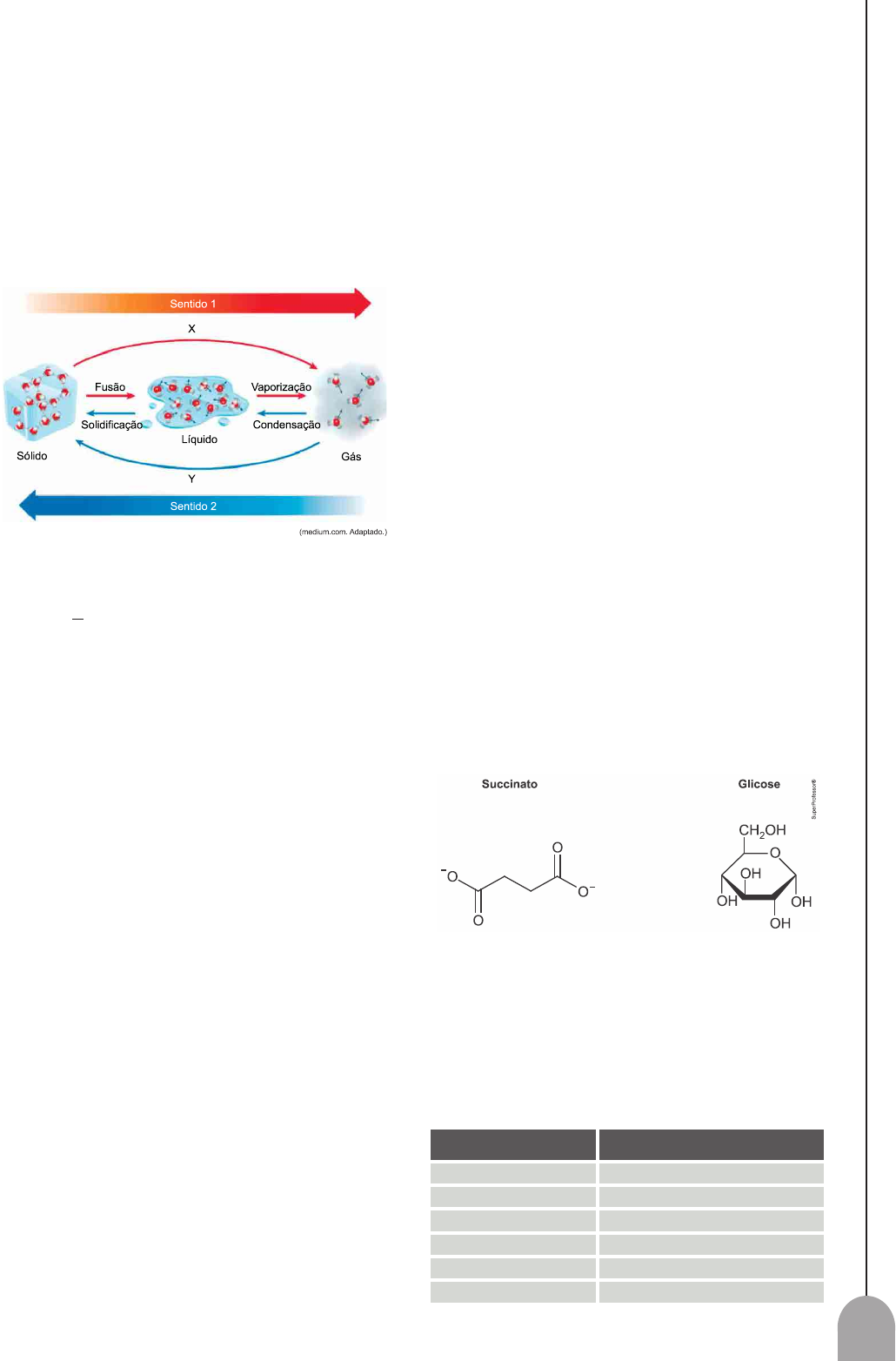 97 R.I. (Revisão Intercalada) ▮Química 3 1. (Famema 2023) O ciclo da água na natureza ocorre por meio das mudanças de estado físico dessa substância, repre- sentadas na figura. As equações a seguir representam a combustão do hidrogênio e a vaporização da água líquida. H2(g)+ 1 2 O2(g) ⟶ H2O(g) ΔH=-242,9kJ/mol H2O (ℓ)⟶H2O(g) ∆H=2,43kJ/gH2O a) Qual o nome da mudança de estado físico indicado pela letra X na figura? Em qual sentido (1 ou 2) ocorre aumento de energia do sistema? b) Determine a energia produzida, em kJ, na combus- tão de 10 g de hidrogênio. Calcule o valor da ental- pia de formação da água líquida. 2. (Unesp) Colocou-se solução concentrada de peróxido de hidrogênio num recipiente de vidro à temperatura ambiente, sem que nenhuma reação visível fosse observada. Com a adição de pequena porção de dió- xido de manganês sólido à solução, ocorreu a libera- ção rápida de grande quantidade de oxigênio gasoso. a) Que tipo de fenômeno físico-químico o dióxido de manganês promoveu? b) Que alteração energética o dióxido de manganês sólido produz no sistema? 3. (Ufjf-pism 2 2022) Em 1776, Alessandro Volta, um cientista italiano, observou que o gás CH4(g) – gás metano que saía de um pântano - podia explodir em contato com o ar sob uma faísca elétrica. Atualmente o CH4(g) é o principal componente do biogás. a) Nas CNTP, qual o volume que 32 gramas desse gás ocupam? (Dados: Pressão: 1 atm, R = 0,082 atm L K-1 mol-1, temperatura = 298 K). b) De acordo com os dados das três equações abaixo, calcule o ΔH da equação de formação do CH4(g) a partir de C(grafite) e gás hidrogênio, indicando se é um processo endotérmico ou exotérmico. I. C(grafite) + O2(g) ⟶ CO2(g) ∆H=-393 kJ II. H2(g) + 1/2 O2(g)⟶H2O(ℓ) ∆H=-285,5 kJ II. CH4(g) + 2 O2(g) ⟶ CO2(g)+ 2 H2O(ℓ) ∆H=-889,5 kJ Dados: C = 12; H = 1. 4. (Puccamp Medicina 2022) O gatilho da força muscular Um grupo de pesquisadores identificou um composto químico que serve de gatilho molecular para o ganho de força decorrente do exercício físico. O composto é o succinato, que participa do ciclo de transformação da glicose (açúcar) em energia nas células. Durante o exercício, o interior das células se torna mais ácido, permitindo a liberação de succinato para o tecido. Na vizinhança, o succinato age como men- sageiro químico e estimula a captação da glicose, o aumento de proteínas contráteis e a ramificação de neurônios que controlam o acionamento das células musculares, melhorando a eficiência do músculo. (Disponível em: https://agencia.fapesp.br, out/2020. Adaptado) A transformação da glicose em energia pode ser representada pela seguinte equação global, não balanceada: C6H12O6+O2 ⟶ CO2+H2O; ΔH=... a) Reescreva a equação completando-a corretamente com os coeficientes estequiométricos menores e inteiros. Calcule a variação de entalpia da reação com base nos valores de energia de ligação a seguir. Ligação Energia de ligação (kJ.mol-1) C – C 348 C – O 357 C – H 413 O – H 462 O = O 498 C = O 802 98 R.I. (Revisão Intercalada) b) Indique as funções orgânicas presentes na molécula de glicose. c) O íon succinato é formado a partir de uma reação de neutralização. A formação de 1,0 mg do sal succinato de sódio a partir de seu ácido consome que quantidade de hidróxido de sódio, em mol? Escreva a reação de neutralização correspondente e demonstre seus cálculos. Dados: Massas molares (g/mol) H = 1,0; C = 12,0; O = 16,0; Na = 23,0. 5. (Famema 2021) A reação de Landolt é utilizada para estudar a ciné- tica das reações químicas. Nessa reação, íons IO - 3 reagem com íons HSO-3 produzindo íons I- O I- pro- duzido reage com íons IO-3 presentes na solução, formando I2, que é novamente convertido em I - até que todo o HSO-3 seja consumido. As equações que representam as reações são apresentadas a seguir. Reação 1: IO-3 (aq)+ 3 HSO-3 (aq) ⟶ I-(aq)+3 SO 2- 4 (aq)+3H + (aq) Reação 2: IO-3 (aq)+5 I-(aq) +6 H + (aq) ⟶ 3 I2(aq)+3 H2O(ℓ) Reação 3: I2(aq)+HSO -3 (aq)+H2O(ℓ)⟶ 2 I-(aq)+SO 2- 4 (aq) +3 H + (aq) Para a realização do experimento, um técnico dis- solveu 4,28 g de KIO3 (massa molar =214 g/mol em água suficiente para preparar 2 litros de solução. Em seguida, uma alíquota de 10 mL dessa solução foi transferida para um balão de 100 mL e o volume restante foi completado com água. a) Qual o reagente limitante da reação de Landolt? Qual o agente oxidante da reação 3? b) Qual a concentração da solução inicial de KIO3 em mol/L? Considerando que a reação é de primeira ordem em relação aos íons IO-3 , determine a rela- ção entre as velocidades da reação (v1/v2) quando se utiliza a solução inicial (v1) e quando se utiliza a solução produzida pela diluição (v2), mantendo-se a concentração do íon HSO-3 constante. 6. (Fmj 2020) O iodo (I2) é uma substância sólida à temperatura ambiente que, quando aquecida, produz vapores de cor violeta característica, e, quando em solução aquosa, possui coloração marrom. O iodo é utilizado, por exemplo, na pesquisa de presença de ligações duplas em moléculas orgânicas. A figura mostra a mudança de estado representada pela equação I2(S)⟶ I2(g). Considere as energias de ligação apresentadas na tabela: Ligação Energia de ligação (kJ/mol) C-C 347 C=C 614 C-H 413 C-I 241 I-I x a) Qual o nome da mudança de estado ilustrada na figura? Qual o tipo de ligação rompida nessa mudança de estado? b) Utilizando o sistema de eixos cartesianos a seguir, esboce um gráfico que represente a variação de entalpia para a reação entre I2 e propeno (H2C=CH- -CH3), indicando a variação de entalpia ocorrida. Considerando a equação a seguir, calcule o valor da energia de ligação para o I2. H2C = CH - CH3 + I2 ⟶ H2CI - CHI - CH3 ΔH=-64kJ/mol 7. (Ufjf-pism 2 - adaptada) As balinhas de ge
