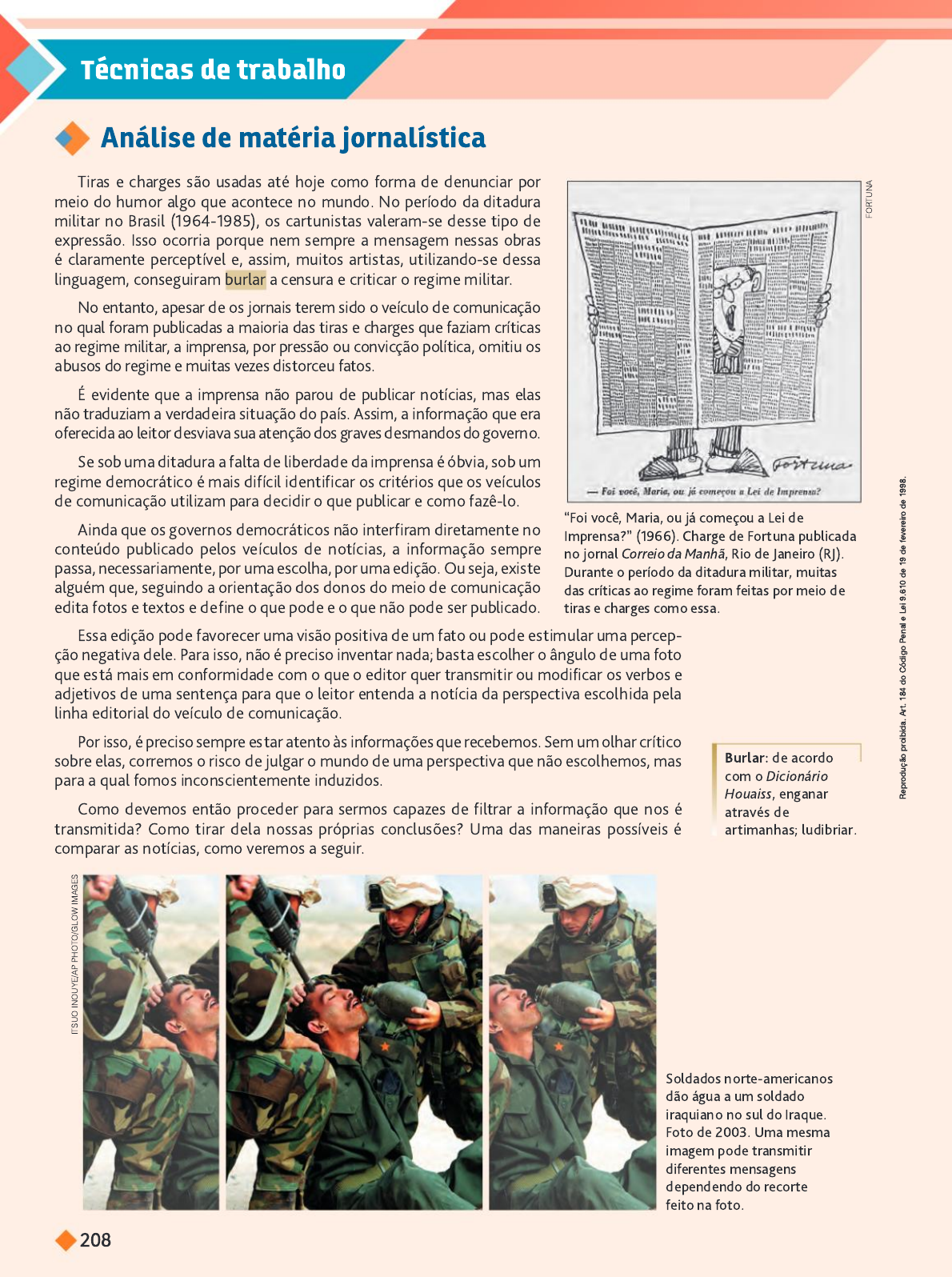 Técnicas de trabalho R e p ro d u ç ã o p ro ib id a . A rt . 1 8 4 d o C ó d ig o P e n a l e L e i 9 .6 1 0 d e 1 9 d e f e v e re ir o d e 1 9 9 8 . Análise de matéria jornalística Tiras e charges são usadas até hoje como forma de denunciar por meio do humor algo que acontece no mundo. No período da ditadura militar no Brasil (1964-1985), os cartunistas valeram-se desse tipo de expressão. Isso ocorria porque nem sempre a mensagem nessas obras é claramente perceptível e, assim, muitos artistas, utilizando-se dessa linguagem, conseguiram burlar a censura e criticar o regime militar. No entanto, apesar de os jornais terem sido o veículo de comunicação no qual foram publicadas a maioria das tiras e charges que faziam críticas ao regime militar, a imprensa, por pressão ou convicção política, omitiu os abusos do regime e muitas vezes distorceu fatos. É evidente que a imprensa não parou de publicar notícias, mas elas não traduziam a verdadeira situação do país. Assim, a informação que era oferecida ao leitor desviava sua atenção dos graves desmandos do governo. Se sob uma ditadura a falta de liberdade da imprensa é óbvia, sob um regime democrático é mais difícil identificar os critérios que os veículos de comunicação utilizam para decidir o que publicar e como fazê-lo. Ainda que os governos democráticos não interfiram diretamente no conteúdo publicado pelos veículos de notícias, a informação sempre passa, necessariamente, por uma escolha, por uma edição. Ou seja, existe alguém que, seguindo a orientação dos donos do meio de comunicação edita fotos e textos e define o que pode e o que não pode ser publicado. “Foi você, Maria, ou já começou a Lei de Imprensa?” (1966). Charge de Fortuna publicada no jornal Correio da Manhã, Rio de Janeiro (RJ). Durante o período da ditadura militar, muitas das críticas ao regime foram feitas por meio de tiras e charges como essa. Soldados norte-americanos dão água a um soldado iraquiano no sul do Iraque. Foto de 2003. Uma mesma imagem pode transmitir diferentes mensagens dependendo do recorte feito na foto. Burlar: de acordo com o Dicionário Houaiss, enganar através de artimanhas; ludibriar. Essa edição pode favorecer uma visão positiva de um fato ou pode estimular uma percep- ção negativa dele. Para isso, não é preciso inventar nada; basta escolher o ângulo de uma foto que está mais em conformidade com o que o editor quer transmitir ou modificar os verbos e adjetivos de uma sentença para que o leitor entenda a notícia da perspectiva escolhida pela linha editorial do veículo de comunicação. Por isso, é preciso sempre estar atento às informações que recebemos. Sem um olhar crítico sobre elas, corremos o risco de julgar o mundo de uma perspectiva que não escolhemos, mas para a qual fomos inconscientemente induzidos. Como devemos então proceder para sermos capazes de filtrar a informação que nos é transmitida? Como tirar dela nossas próprias conclusões? Uma das maneiras possíveis é comparar as notícias, como veremos a seguir. F o r t u n a It s u o I n o u y e /a P P h o t o /G l o w I m a G e s R e p ro d u ç ã o p ro ib id a . A rt . 1 8 4 d o C ó d ig o P e n a l e L e i 9 .6 1 0 d e 1 9 d e f e v e re ir o d e 1 9 9 8 . 208 208-224-HC1-Finais-G-BR.indd 208 3/15/16 10:30 AM R e p ro d u ç ã o p ro ib id a . A rt . 1 8 4 d o C ó d ig o P e n a l e L e i 9 .6 1 0 d e 1 9 d e f e v e re ir o d e 1 9 9 8 . 209 Objetivo Pesquisar, selecionar e fazer uma análise comparativa de publicações jornalísticas sobre um tema escolhido. Etapas • Seleção do tema. • Escolha dos veículos de comunicação. • Pesquisa de notícias e/ou reportagens sobre o tema selecionado nos veículos de comunicação escolhidos. • Análise comparativa dos textos selecionados. • Elaboração de um texto com os resultados da análise. Procedimentos • Seleção do tema. Selecione um tema que esteja rece- bendo no momento ampla cobertura da imprensa (a aprovação de leis, algum evento da política nacional, cenário socioeconômico do país etc.). • Escolhados veículos de comunicação. Escolha três veí- culos de comunicação diferentes que tenham publicado notícias ou feito reportagens sobre o tema selecionado. Podem ser jornais impressos, revistas ou portais de no- tícias da internet. Tome o cuidado de não selecionar veí- culos diferentes de uma mesma empresa de informação (por exemplo, site e jornal impresso da mesma empresa). • Pesquisa de notícias e/ou reportagens sobre o tema selecionadonosveículosde comunicaçãoescolhidos. Identifique em cada veículo de comunicação as notícias e/ou reportagens publicadas sobre o tema escolhido. De forma geral, os veículos de comunicação trabalham com vários gêneros textuais, mas aqui você precisa identificar apenas dois deles: a notícia e a reportagem. A notícia é um texto informativo, que dá ao leitor o conhecimento de um fato, colocando-o a par do que aconteceu, como, Gênero textual Relevância da notícia Manchete Fotografia Adjetivos e substantivos usados Pontos de vista registrados Posicionamento em relação aos fatos Nome do veículo 1 Nome do veículo 2 Nome do veículo 3 quando e onde, quem foram os atores envolvidos e sua repercussão. Embora a notícia não seja assinada por um jornalista, dependendo de como a informação é transmitida, pode predispor o leitor a desenvolver um entendimento positivo ou negativo do fato. Já a repor- tagem é sempre assinada pelo jornalista responsável e tem caráter mais analítico, procurando construir um entendimento amplo de um fato ou fenômeno social, político, econômico ou cultural. Assim, a reportagem busca colher diferentes pontos de vista sobre aquilo que é investigado e registrar a opinião de especialistas. • Análisecomparativadostextosselecionados. Leia aten- tamente os textos, considerando os seguintes aspectos: 1.Relevância dada ao tema: 