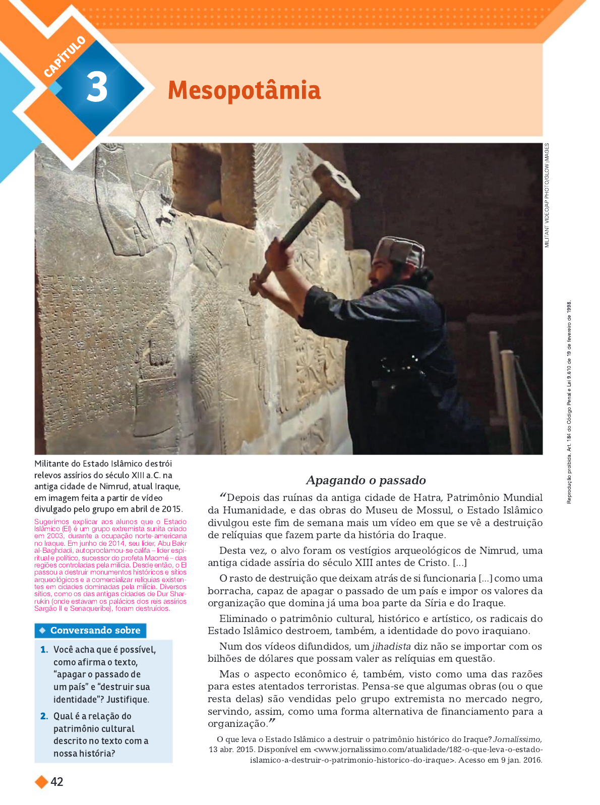 R e p ro d u ç ã o p ro ib id a . A rt . 1 8 4 d o C ó d ig o P e n a l e L e i 9 .6 1 0 d e 1 9 d e f e v e re ir o d e 1 9 9 8 . 42 Apagando o passado “Depois das ruínas da antiga cidade de Hatra, Patrimônio Mundial da Humanidade, e das obras do Museu de Mossul, o Estado Islâmico divulgou este fim de semana mais um vídeo em que se vê a destruição de relíquias que fazem parte da história do Iraque. Desta vez, o alvo foram os vestígios arqueológicos de Nimrud, uma antiga cidade assíria do século XIII antes de Cristo. [...] O rasto de destruição que deixam atrás de si funcionaria [...] como uma borracha, capaz de apagar o passado de um país e impor os valores da organização que domina já uma boa parte da Síria e do Iraque. Eliminado o patrimônio cultural, histórico e artístico, os radicais do Estado Islâmico destroem, também, a identidade do povo iraquiano. Num dos vídeos difundidos, um jihadista diz não se importar com os bilhões de dólares que possam valer as relíquias em questão. Mas o aspecto econômico é, também, visto como uma das razões para estes atentados terroristas. Pensa-se que algumas obras (ou o que resta delas) são vendidas pelo grupo extremista no mercado negro, servindo, assim, como uma forma alternativa de financiamento para a organização.” O que leva o Estado Islâmico a destruir o patrimônio histórico do Iraque? Jornalíssimo, 13 abr. 2015. Disponível em <www.jornalissimo.com/atualidade/182-o-que-leva-o-estado- islamico-a-destruir-o-patrimonio-historico-do-iraque>. Acesso em 9 jan. 2016. m il it a n t v id e o /a P P h o t o /G l o w m a G e s Militante do Estado Islâmico destrói relevos assírios do século XIII a.C. na antiga cidade de Nimrud, atual Iraque, em imagem feita a partir de vídeo divulgado pelo grupo em abril de 2015. Conversando sobre 1. Você acha que é possível, como afirma o texto, “apagar o passado de um país” e “destruir sua identidade”? Justifique. 2. Qual é a relação do patrimônio cultural descrito no texto com a nossa história? 3 Ca pí tu lo Mesopotâmia Sugerimos explicar aos alunos que o Estado Islâmico (EI) é um grupo extremista sunita criado em 2003, durante a ocupação norte-americana no Iraque. Em junho de 2014, seu líder, Abu Bakr al-Baghdadi, autoproclamou-se califa – líder espi- ritual e político, sucessor do profeta Maomé – das regiões controladas pela milícia. Desde então, o EI passou a destruir monumentos históricos e sítios arqueológicos e a comercializar relíquias existen- tes em cidades dominadas pela milícia. Diversos sítios, como os das antigas cidades de Dur Shar- rukin (onde estavam os palácios dos reis assírios Sargão II e Senaqueribe), foram destruídos. 042-055-HC1-C03-G-BR.indd 42 3/14/16 3:19 PM R e p ro d u ç ã o p ro ib id a . A rt . 1 8 4 d o C ó d ig o P e n a l e L e i 9 .6 1 0 d e 1 9 d e f e v e re ir o d e 1 9 9 8 . 43 34° N 40° L MAR MEDITERRÂNEO MAR CÁSPIO Golfo Pérsico Rio E f R o T g e IRà ARMÊNIA TURQUIA AZERBAIJÃO JORDÂNIA ARÁBIA SAUDITA EGITO IRAQUE KUWAIT SÍRIA ISRAEL LÍBANO CHIPRE Área da antiga Mesopotâmia Divisão política atual Terra entre rios A região conhecida como Mesopotâmia corresponde às áreas próximas aos rios Tigre e Eufrates, nos atuais territórios do Irã, Iraque, Síria, Turquia e Kuwait. A palavra Mesopotâmia vem do grego e significa “terra entre rios” (mesos: meio, entre; potamos: água, rio). O clima e o relevo da região não são homogêneos, ocasionando grande diversidade de paisagens compostas de áreas de pântanos, estepes, planícies férteis e planaltos com clima ameno. Ao sul, o território apresenta um clima hostil para a produção agrícola, com chuvas escassas e temperaturas altas, o que exige um intenso trabalho de irrigação para garantir as colheitas. Já ao norte, as chuvas são mais frequentes e as tempe- raturas mais amenas, permitindo que a agricultura se desenvolva mais facilmente. Além disso, o derretimento da neve nas montanhas localizadas ao norte provocava, entre os meses de abril e maio, as cheias dos rios, o que obrigava as populações mesopotâmicas a construir uma complexa rede de diques, barra- gens e canais para conter a força das águas e permitir seu aproveitamento para a irrigação das lavouras. No entanto, apesar da potencial força destrutiva, essas cheias traziam materiais orgânicos das regiões mais altas, o que tornava o solo mais fértil, favorecendo o cultivo de cereais, raízes, legumes e árvores frutíferas. Foi neste cenário que se instalaram povos das mais variadas culturas e modos de organização social, que nos legaram duas das suas mais importantes criações: o Estado, a base de nossa organização social, e a escrita, que surgiu por volta de 3300 a.C. e, de acordo com uma visão tradicional, marca a transição entre a Pré-história e a história. “Essa transição foi, e ainda é, interpretada de várias formas. Aqueles pesquisadores acadêmicos que observam prioritariamente os aspectos do assentamento urbano, chamam a transição de ‘Revolução Urbana’. Os que colocam ênfase nos aspectos sociopolíticos se referem à emergência do ‘estado arcaico’. Aqueles que privilegiam a estrutura socioeconô- mica [...] falam sobre ‘a origem da complexidade social’. E, finalmente, aqueles que levam em conta a origem da escrita [...] e a veem como um instrumento sem precedentes para nos prover de conhecimento sobre as sociedades do passado chamam de ‘o início da história’.” LIVERANI, Mario. Uruk: the first city. Londres: Equinox, 2006. p. 1. (Tradução nossa) Fontes: REDE, Marcelo. A Mesopotâmia. São Paulo: Saraiva, 1997. p. 7; DUBY, Georges. Atlas histórico mundial. Madri: Debate. p. 7. Localização da Mesopotâmia Outras importantes realizações culturais dos povos mesopotâmicos foram a invenção dos logaritmos, dos problemas matemáticos, as descri- ções anatômicas, os códigos legais, 