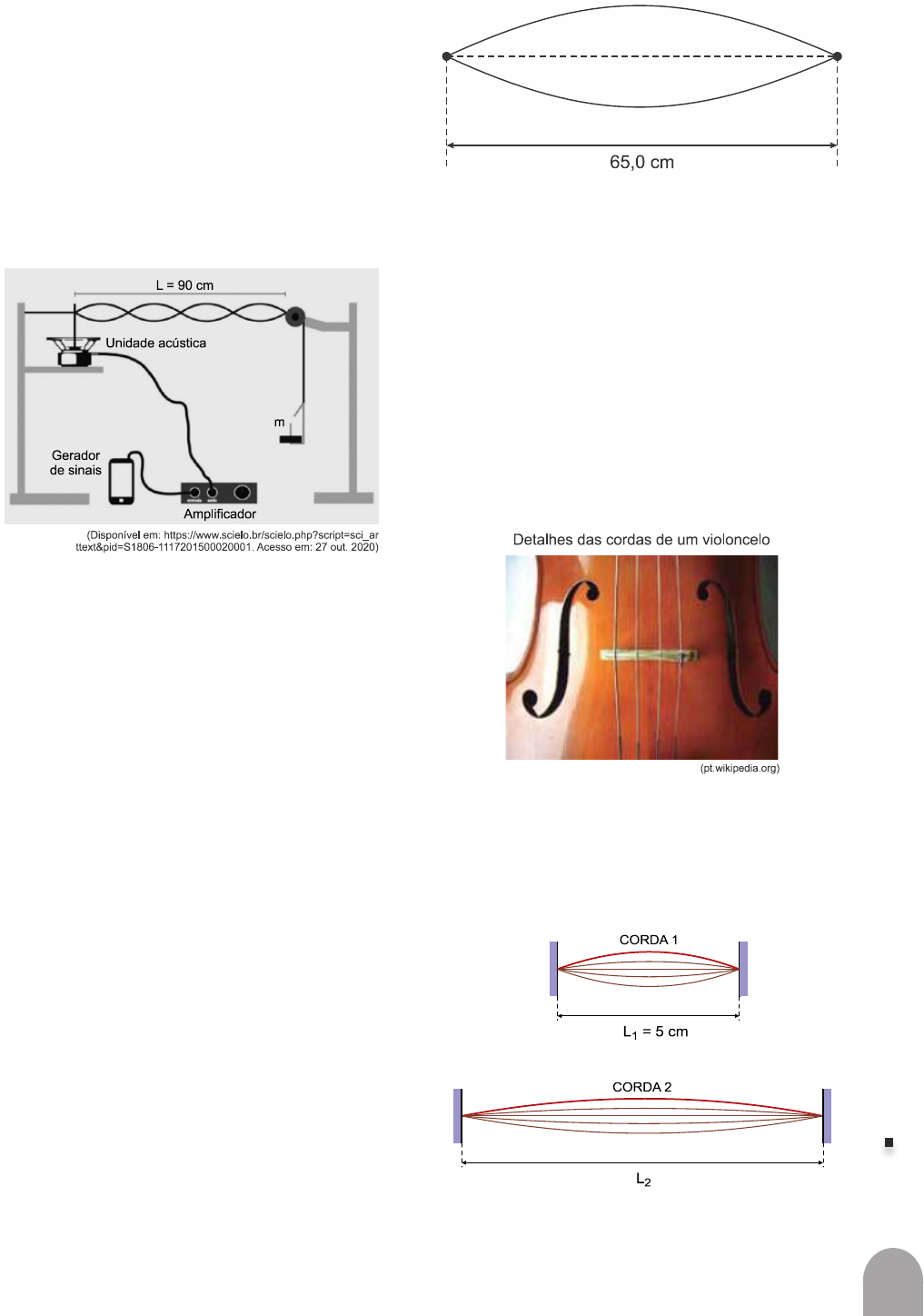 397 VO LU M E 3 C IÊ N CI AS D A N AT U RE ZA e s ua s te cn ol og ia s 6. (Unisinos 2021) Um dos experimentos mais conhecidos da teoria ondulatória é o da onda estacionária estabelecida numa corda tensionada, semelhante ao ilustrado na figura a seguir. Neste experimento, uma corda fica presa entre duas extremidades, uma conectada a uma unidade acústica, que, por sua vez, é ligada a um amplificador de sinais oscilantes emitidos por um gerador eletrônico, enquanto que a outra extre- midade fica ligada a uma massa fixa m, responsável por tensionar a referida corda. Considere as afirmações sobre ondas estacionárias e sobre o experimento representado na figura acima. I. Um dos fenômenos ondulatórios responsáveis pelo surgimento das ondas estacionárias em cordas ten- sionadas é a interferência. II. Se a onda estacionária mostrada na figura se pro- pagar na corda de 90 cm de comprimento com uma velocidade de 45 m/s, a frequência fundamental de ressonância do sistema será de 50 Hz. III. A quantidade de harmônicos formados na corda de 90 cm é independente da frequência da unidade acústica. Sobre as proposições acima, pode-se afirmar que a) apenas I está correta. b) apenas II está correta. c) I e II estão corretas. d) I e III estão corretas. e) I, II e III estão corretas. 7. (Fmp 2020) Instrumentos musicais como o violão geram som a partir da vibração de suas cordas. A Figura abaixo é o esquema de uma corda de violão, vibrando e emitindo a nota lá, de frequência 110 Hz. A velocidade de propagação, em m/s, da onda nessa corda é, aproximadamente, a) 46,5 b) 84,6 c) 169 d) 71,5 e) 143 8. (Unesp 2023) Nos instrumentos musicais de corda, as cordas apre- sentam diferentes espessuras e diferentes densida- des lineares de massa, para que aquelas que emitem sons mais graves não precisem ser muito longas, o que inviabilizaria a construção do instrumento. Para ilustrar o fato de que cordas que emitem sons mais graves precisariam ser muito longas, considere duas cordas, 1 e 2, ambas com extremidades fixas, que apresentem espessuras iguais, mesma densidade linear de massa e que estejam submetidas à mesma força de tração. 398 VO LU M E 3 C IÊ N CI AS D A N AT U RE ZA e s ua s te cn ol og ia s Quando essas cordas vibram em seus modos fundamen- tais, a frequência da onda sonora emitida pela corda 1 é 150 vezes maior do que a frequência da onda sonora emitida pela corda 2. Sabendo que a corda 1 mede L1 = 5 cm, o comprimento L2 da corda 2 deve ser de a) 7,5 m. b) 8,0 m. c) 5,0 m. d) 2,5 m. e) 1,5 m. 9. (Albert Einstein - Medicina 2023) A velocidade de propagação de uma onda em uma corda pode ser calculada pela expressão v T= n em que T é a intensidade da força com que a corda é tracionada e µ é sua densidade linear de massa. Considere que uma corda tenha massa de 120 g, 3 m de comprimento e que se pretenda estabelecer ondas estacionárias nessa corda, como representado na figura. Para que a frequência de oscilação das ondas nessa corda seja de 30 Hz, deve-se submetê-la a uma força de tração de intensidade a) 108 N. b) 144 N. c) 216 N. d) 180 N. e) 72 N. 10. (Ime 2022) Gás v [m/s] argônio 319 criptônio 221 hélio 1007 hidrogênio 1270 oxigênio 326 xenônio 178 fonte: https://pages.mtu.edu/~suits/SpeedofSoundOther.html A tabela mostra a velocidade v do som, a 20°C e 1 atm, em seis gases diferentes. Quando um tubo aberto em uma das extremidades é enchido com oxi- gênio, a frequência do primeiro harmônico do som produzido pelo tubo é 163 Hz. Quando o oxigênio é substituído por um dos cinco gases restantes, a frequência do quinto harmônico do som produzido pelo tubo é 2517,5 Hz. Isso significa que o gás esco- lhido para o segundo experimento foi o: a) argônio b) criptônio c) hélio d) hidrogênio e) xenônio 11. (Fgv 2021) A figura mostra dois recipientes cilíndricos idên- ticos, R e S, de altura 35 cm, contendo água até diferentes alturas, hR e hS. Colocando-se um alto-falante que emite um som de frequência 850 Hz sobre cada recipiente, separada- mente, verifica-se que eles funcionam como tubos sonoros fechados em uma extremidade e abertos na outra, ocorrendo ressonância em ambos. Consi- derando-se a velocidade de propagação do som no ar igual a 340 m/s, a diferença entre as alturas da água nos dois recipientes, hS - hR, é igual a a) 10 cm. b) 12 cm. c) 15 cm. d) 18 cm. e) 20 cm. 12. (Esc. Naval 2020) No esquema da figura abaixo, uma fonte coloca uma corda a vibrar, no modo fundamental, com uma frequência de 200 Hz. Considere que a corda seja inextensível e a polia ideal. Considere ainda que a massa do bloco nessa situação seja 4 kg e a distân- cia igual a 50 cm. 399 VO LU M E 3 C IÊ N CI AS D A N AT U RE ZA e s ua s te cn ol og ia s Quadruplicando a massa da bloco, qual seria a nova frequência de oscilação se a corda fosse posta a vibrar novamente no modo fundamental? (Dado: g = 10m/(s2)) a) 100 Hz b) 200 Hz c) 300 Hz d) 400 Hz e) 500 Hz 13. (Enem PPL) Em uma flauta, as notas musicais possuem frequên- cias e comprimentos de onda (m ) muito bem defi- nidos. As figuras mostram esquematicamente um tubo de comprimento L, que representa de forma simplificada uma flauta, em que estão representa- dos: em A o primeiro harmônico de uma nota musi- cal (comprimento de onda m A), em B seu segundo harmônico (comprimento de onda m B) e em C o seu terceiro harmônico (comprimento de onda m C), onde m A > m B > m C. Em função do comprimento do tubo, qual o compri- mento de onda da oscilação que forma o próximo harmônico? a) L/4 b) L/5 c) L/2 d) L/8 e) 6L/8 14. (Ita 2021) Um violão é um instrumento sonoro de seis cordas de diferentes propriedades, fixas em ambas as extremi- dades, acompanhadas de uma caixa de ressonância. Diferentes notas musicais são produzidas tangendo uma das cordas, podendo-se ou não alterar o seu comprimento efetivo, pressionando-a com os dedos em diferentes pontos do braço do violão. A res