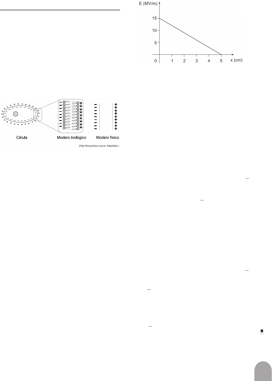 427 VO LU M E 3 C IÊ N CI AS D A N AT U RE ZA e s ua s te cn ol og ia s exercícios de sala 1. (Famerp 2020) Nas Ciências, muitas vezes, se inicia o estudo de um problema fazendo uma aproximação simplificada. Um desses casos é o estudo do comportamento da membrana celular devido à distribuição do excesso de íons positivos e negativos em torno dela. A figura mostra a visão geral de uma célula e a analogia entre o modelo biológico e o modelo físico, o qual corres- ponde a duas placas planas e paralelas, eletrizadas com cargas elétricas de tipos opostos. Com base no modelo físico, considera-se que o campo elétrico no interior da membrana celular tem sentido para a) fora da célula, com intensidade crescente de dentro para fora da célula. b) dentro da célula, com intensidade crescente de fora para dentro da célula. c) dentro da célula, com intensidade crescente de den- tro para fora da célula. d) fora da célula, com intensidade constante. e) dentro da célula, com intensidade constante. TEXTO PARA A PRÓXIMA QUESTÃO: Na(s) questão(ões), as medições são feitas por um referencial inercial. O módulo da aceleração gravi- tacional é representado por g. Onde for necessá- rio, use g = 10 m/s2 para o módulo da aceleração gravitacional. 2. (Ufpr 2022) O comportamento gráfico para o módulo do campo elétrico E numa dada região do espaço, em função da posição x dentro dessa região, é linear e está representado na figura a seguir. Considerando as informações apresentadas no enunciado e na figura, assinale a alternativa que apresenta corretamente o valor do módulo da força elétrica F produzida por esse campo sobre uma carga Q = 1,6 μC colocada na posição x = 4 cm. a) F = 8,0 N. b) F = 6,4 N. c) F = 4,8 N. d) F = 3,2 N. e) F = 1,6 N. 3. (Uerj 2020) Em uma impressora a jato de tinta, gotículas de tinta com carga elétrica q atravessam um campo elétrico uniforme EE de intensidade igual a 8 x 105 NC , sendo depositadas em uma folha de papel. Admita que cada gotícula tenha massa m = 3,2 x 10-9 g e adquira aceleração de 104 ms2 , durante a interação com o campo EE . Desprezando a ação do campo gravitacional e a resistência do ar, determine a quantidade de elé- trons em cada gotícula. 4. (Espcex (Aman) 2019) Considere uma esfera metálica de massa igual a 10-6 kg e carga positiva de 10-3 kg Ela é lançada vertical- mente para cima com velocidade inicial v0 = 50 m s , em uma região onde há um campo elétrico uniforme apontado verticalmente para baixo, de módulo E = 10-2 NC . A máxima altura que a esfera alcança, em relação ao ponto de onde foi lançada, é de Dado: considere a aceleração da gravidade igual a 10 ms2 . a) 32,5 m. b) 40,5 m. c) 62,5 m. d) 70,0 m. e) 82,7 m. 428 VO LU M E 3 C IÊ N CI AS D A N AT U RE ZA e s ua s te cn ol og ia s 5. (Ufms 2019) Uma partícula de massa 2,5 ⋅ 10-21 kg move-se 4 cm, a partir do repouso, entre duas placas metálicas carregadas que geram um campo elétrico uniforme de módulo igual a 1 ⋅ 105 NC Considerando que para percorrer essa distância a partícula gasta um tempo de 4 ⋅ 10-6 s a opção que dá corretamente o valor da carga elétrica é: a) 1,25 ⋅ 10-16 C. b) 1,75 ⋅ 10-16 C. c) 2,25 ⋅ 10-15 C. d) 1,45 ⋅ 10-15 C. e) 1,15 ⋅ 10-15 C. 6. (Fuvest) Em uma aula de laboratório de Física, para estudar propriedades de cargas elétricas, foi realizado um experimento em que pequenas esferas eletrizadas são injetadas na parte superior de uma câmara, em vácuo, onde há um campo elétrico uniforme na mesma direção e sentido da aceleração local da gravidade. Observou-se que, com campo elétrico de módulo igual a 2 x 103 V/m, uma das esferas, de massa 3,2 x 10-15 kg, permanecia com velocidade constante no interior da câmara. Essa esfera tem NOTE E ADOTE: - carga do elétron = -1,6 x 10 -19 C - carga do prótron = +1,6 x 10 -19 C - aceleração local da gravidade = 10 ms2 a) o mesmo número de elétrons e de prótons. b) 100 elétrons a mais que prótons. c) 100 elétrons a menos que prótons. d) 2000 elétrons a mais que prótons. e) 2000 elétrons a menos que prótons. 7. (Fuvest 2013) Um equipamento, como o esquematizado na figura abaixo, foi utilizado por J.J.Thomson, no final do século XIX, para o estudo de raios catódicos em vácuo. Um feixe fino de elétrons (cada elétron tem massa m e carga e) com velocidade de módulo v0, na direção horizontal x, atravessa a região entre um par de placas paralelas, horizontais, de comprimento L. Entre as placas, há um campo elétrico de módulo constante E na direção vertical y. Após saírem da região entre as placas, os elétrons descrevem uma trajetória retilínea até a tela fluorescente T. Determine a) o módulo a da aceleração dos elétrons enquanto estão entre as placas; b) o intervalo de tempo Δt que os elétrons permanecem entre as placas; c) o desvio Δy na trajetória dos elétrons, na direção vertical, ao final de seu movimento entre as placas; d) a componente vertical vy da velocidade dos elétrons ao saírem da região entre as placas. Note e adote: Ignore os efeitos de borda no campo elétrico; Ignore efeitos gravitacionais. 429 VO LU M E 3 C IÊ N CI AS D A N AT U RE ZA e s ua s te cn ol og ia s estudo indiVidualizado (e.i.) 1. (Uepg 2022) Quando uma partícula com carga elétrica é colo- cada, em repouso, em um ponto do espaço, a região ao redor dessa partícula adquire propriedades que a caracterizam, pois nessa região passa a existir um campo elétrico. Considerando essas informações, assinale o que for incorreto. a) Quando uma carga positiva é colocada numa região onde existe um campo elétrico, esta ficará sujeita à ação de uma força elétrica de mesma direção do campo, porém em sentido contrário a ele. b) O campo elétrico gerado por uma carga puntiforme positiva é chamado de campo elétrico de afasta- mento. c) A grandeza campo elétrico é vetorial e pode ser medida em V⋅m-1. d)