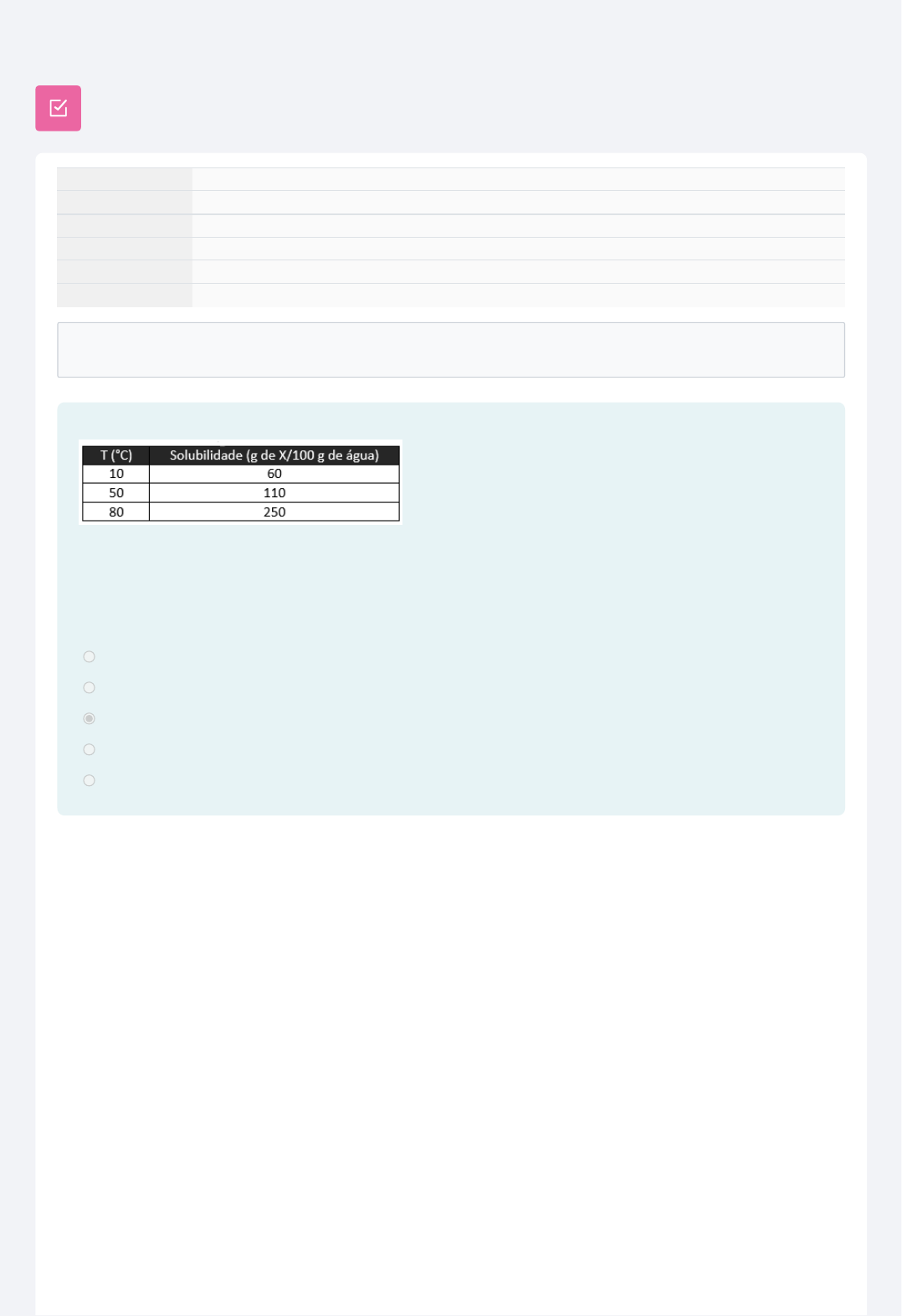 Iniciado em terça-feira, 12 mar. 2024, 06:18 Estado Finalizada Concluída em terça-feira, 12 mar. 2024, 06:19 Tempo empregado 38 segundos Avaliar 10,00 de um máximo de 10,00(100%) Comentários Parabéns, você alcançou a maior nota possível nesta avaliação! Questão 1 Completo 1) A tabela a seguir possui informações sobre a solubilidade de uma substância X. Qual a massa de X necessária para saturar 250 g de água a 50 °C, e qual massa de X que se deposita quando uma solução contendo 40 g de X em 40 g de água a 80 °C é resfriada a 10 °C? Escolha uma opção: a. 275 g; 40 g. b. 110 g; 16 g. c. 275 g; 16 g. d. 275 g; 24 g. e. 110 g; 24 g. Questão 2 Completo Validar Certi�cado Ajuda Termo de uso Política de privacidade 1) O grá�co abaixo exibe valores de solubilidade para o Ba(NO ) em diferentes temperaturas. Um químico tinha uma amostra de nitrato de bário sólido e decidiu separá-la em três partes: a parte A com 340 g, a parte B com 140 g, e a parte C com 20 g. Logo depois, em cada amostra, ele adicionou 735 mL de água e aqueceu as soluções A e B a, respectivamente, 100 °C e 55 °C, e resfriou a solução C a 8 °C. Fazendo aproximações, pode-se dizer que as partes A, B e C serão, respectivamente, Escolha uma opção: a. solução saturada, solução saturada, solução insaturada. b. solução saturada com precipitado, solução saturada, solução insaturada. c. solução saturada, solução insaturada, solução insaturada d. solução insaturada, solução saturada, solução insaturada. e. solução insaturada, solução saturada, solução saturada com precipitado. 3 2 Atividade anter ior Material de Apoio 3.4 Seguir para... Próxima at iv idade Vídeo 3.5 https://lumina.ufrgs.br/mod/simplecertificate/verify.php https://lumina.ufrgs.br/local/staticpage/view.php?page=faq https://lumina.ufrgs.br/admin/tool/policy/view.php?versionid=2 https://lumina.ufrgs.br/admin/tool/policy/view.php?versionid=1 http://www.ufrgs.br/ http://www.ufrgs.br/ http://www.ufrgs.br/sead http://www.ufrgs.br/sead http://www.ufrgs.br/napead http://www.ufrgs.br/napead http://www.ufrgs.br/cpd http://www.ufrgs.br/cpd https://creativecommons.org/licenses/by-nc-nd/4.0/deed.pt_BR https://creativecommons.org/licenses/by-nc-nd/4.0/deed.pt_BR https://lumina.ufrgs.br/mod/page/view.php?id=19375&forceview=1 https://lumina.ufrgs.br/mod/url/view.php?id=19378&forceview=1