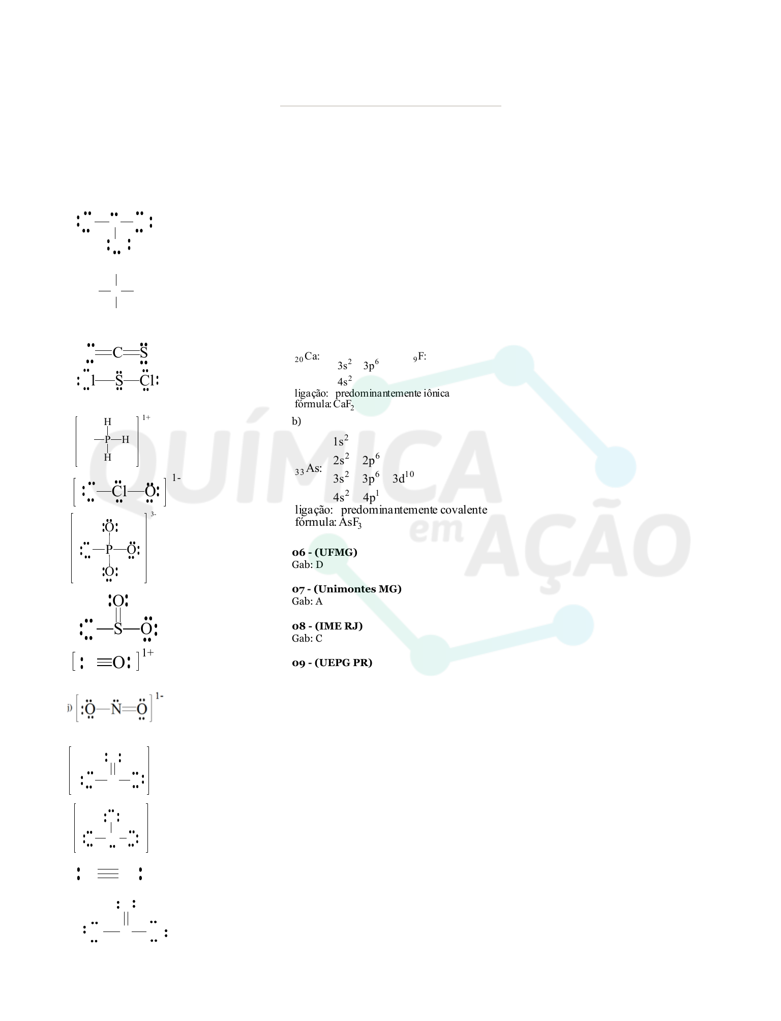 01 QemA) Gab: NCl Cl Cl CH H H H CS S a) b) c) 1+ d) e) SCl Cl PH H H H ClO O 1- f) g) PO O O O 3- h) SO O O i) N O 1+ 1- l) NO O O 1- m) BrO O O C On) CCl Cl O o) 02 - (UFLA MG) Gab: B 03 - (MACK SP) Gab: E 04 - (UDESC SC) Gab: C 05 - (UDESC SC) Gab: a) 2 52 2 9 2 62 62 2 20 CaF :fórmula iônica tementepredominan :ligação 2p2s 1s :F 4s 3p3s 2p2s 1s :Ca b) 3 12 1062 62 2 33 AsF :fórmula covalente tementepredominan :ligação 4p4s 3d3p3s 2p2s 1s :As 06 - (UFMG) Gab: D 07 - (Unimontes MG) Gab: A 08 - (IME RJ) Gab: C 09 - (UEPG PR) Gab: 17 10 - (UFPB) Gab: A GABARITO L ISTA 12 6 QUÍMICA GERAL - MÓDULO 06 01 - (IFSP) A ligação química entre dois átomos de nitrogênio (Z = 7) é representada corretamente pela fórmula estrutural a) N+N–. b) N3+N3–. c) N-N. d) N=N. e) NN. 02 - (UNIFICADO RJ) Em uma investigação química, as propriedades e transformações da matéria são parâmetros de estudos. A linguagem e os conceitos para descrever a união entre os átomos, ou seja, as ligações químicas, evoluíram de teorias muito simples para outras mais complexas, com base na mecânica ondulatória. Essas ligações podem ser classificadas em duas categorias gerais como: Ligação Iônica (Eletrovalente) e Ligação Covalente. A seguir, são listadas quatro substâncias e algumas aplicações: Al2O3 – óxido de alumínio (alumina – usado como isolante térmico, elétrico, etc.) CCl4 – tetracloreto de carbono (líquido incolor – usado como solvente) NH3 – amônia (gás incolor – usado em refrigeração) LiF – fluoreto de lítio (usado na óptica ultravioleta de termoluminescência) Os tipos de ligação química nesses compostos são, respectivamente, a) covalente – covalente – iônica – iônica b) covalente – iônica – covalente – iônica c) covalente – iônica – iônica – covalente d) iônica – iônica – covalente – covalente e) iônica – covalente – covalente – iônica 03 - (UFPE) Um composto iônico é um composto químico no qual existem íons ligados através de ligações iônicas formando uma estrutura cristalina. Os íons que entram na composição de um composto iônico podem ser simples espécies químicas, como ocorre no NaCl ou grupos mais complexos como ocorre no (carbonato de cálcio). Dentre os compostos a seguir, qual não é um composto iônico. a) LiF b) KCl c) CO d) CsCl e) NaBr 04 - (UDESC SC) Considere o elemento cloro formando compostos com, respectivamente, hidrogênio, carbono, potássio e alumínio. a) Com quais desses elementos o cloro forma compostos covalentes? Justifique sua resposta. b) Indique as fórmulas es trutura is e moleculares dos compostos covalentes do cloro. 05 - (FUVEST SP) A figura abaixo traz um modelo da estrutura microscópica de determinada substância no estado sólido, estendendo-se pelas três dimensões do espaço.Nesse modelo, cada esfera representa um átomo e cada bastão, uma ligação química entre dois átomos. A substância representada por esse modelo tridimensional pode ser a) sílica, (SiO2)n. b) diamante, C. c) cloreto de sódio, NaCl. d) zinco metálico, Zn. e) celulose, (C6H10O5)n. L ISTA COMPLEMENTAR 12 4 LIGAÇÃO COVALENTE - LIGAÇÕES MULTIPLAS - ESTRUTURAS DE LEWIS - PROPRIEDADES DOS COMPOSTOS MOLECULARES - RESSONÂNCIA - ORBI- TAIS MOLECULARES - CARÁTER COVALENTE QUÍMICA GERAL - MÓDULO 06 06 - (UFF RJ) O leite materno é um alimento rico em substâncias orgânicas, tais como proteínas, gorduras e açúcares, e substâncias minerais como, por exemplo, o fosfato de cálcio. Esses compostos orgânicos têm como característica principal as ligações covalentes na formação de suas moléculas, enquanto o mineral apresenta também ligação iônica.Assinale a alternativa que apresenta corretamente os conceitos de ligações covalente e iônica, respectivamente. a) A ligação covalente só ocorre nos compostos orgânicos. b) A ligação covalente se faz por transferência de elétrons e a ligação iônica pelo compartilhamento de elétrons com spins opostos. c) A ligação covalente se faz por atração de cargas entre átomos e a ligação iônica por separação de cargas. d) A ligação covalente se faz por união de átomos em moléculas e a ligação iônica por união de átomos em complexos químicos. e) A l i g a ç ã o c o v a l e n t e s e f a z p e l o compartilhamento de elétrons e a ligação iônica por transferência de elétrons. 07 - (PUC Camp SP) Cogumelo matador Dores, mal-estar, enjoo e problemas generalizados no fígado, rins e coração são os sintomas não de uma doença, mas do tratamento mais usado na leishmaniose. A doença, que pode infectar o fígado e levar à morte, atinge 14 a cada 100 mil brasileiros. Hoje, os medicamentos são tóxicos e a cura não é garantida: são derivados do antimônio, um semimetal que, em altas concentrações, provoca todos esses maléficos efeitos colaterais. Um novo remédio para tratar a doença está sendo pesquisado no Instituto de Ciências Biológicas da Universidade Federal de Minas Gerais e tem base em um fungo, popularmente conhecido como cogumelo do sol. Além de não apresentar efeito colateral em humanos, o cogumelo tem aprovação da ANVISA e da FDA, nos Estados Unidos. Das cerca de 100 substâncias presentes no extrato bruto do fungo, obtido após a desidratação e maceração, já se conseguiu sintetizar cinco, que provaram ser altamente eficazes contra a doença. As substâncias matam o Leishmania sem afetar o funcionamento dos macrófagos, as células do sistema imunológico humano em que eles se hospedam. (Adaptado: Revista Galileu, junho de 2011, p. 20) O arsênio é um semimetal ou metaloide que ao se ligar com o hidrogênio forma a molécula a) AsH b) AsH2 c) As3H d) AsH3 e) As2H3 08 - (UDESC SC) Em cada fórmula do cloreto de amônio (NH4Cl) estão presentes: a) 3 ligações covalentes dativas e 1 ligação iônica. b) 4 ligações iônicas e 1 ligação covalente dativa. c) 2 ligaç