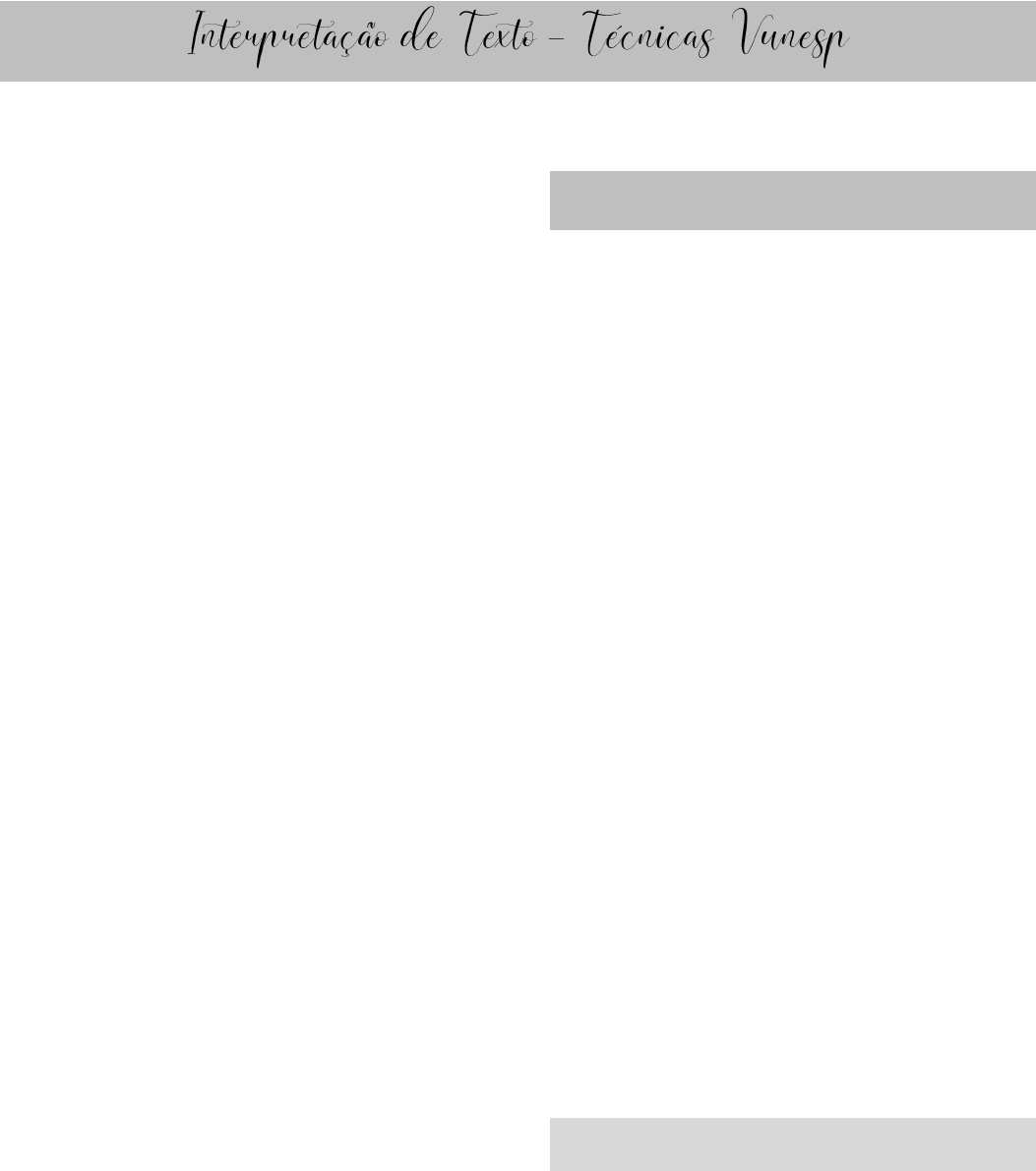 LÍNGUA PORTUGUESA Técnica do Senso Comum/ Lógica Cotidiana. Primeiro, deve-se olhar as alternativas, sem ler o texto antes, com base no senso comum. - O que você acha que o texto vai dizer se baseando nas alternativas, ou seja, quando só com o enunciado você consegue ter uma noção. Exercícios do 5 ao 11 do material: Gabarito Correto: 5- C 6- B 7- E 8- B 9- C 10- B 11- D Depois de fazer essa primeira técnica, aplicaremos a técnica da PREVISÃO, antes mesmo de ler o texto também, circulando a ideia principal. Após essas técnicas, realiza-se a leitura do texto. Interpretar X Compreender Compreensão é entender o que está escrito; Interpretar é entender o que o autor quer dizer (o que não está expressamente escrito). Tipos de Enunciados (Interpretação) Autor sustenta que, conclui-se que, permitem concluir que, está expresso em outras palavras... Tipos de Enunciados de Compreensão A ideia central do texto é (geralmente está no primeiro parágrafo); No parágrafo X o autor afirma que seria (in) correto porquê... Vai estar no texto, só que em outras palavras. Como começarmos a ler para interpretar o texto? Primeira leitura – ideia principal estará sempre no primeiro parágrafo, após vem as ideias secundárias, afirmações, explicações, fundamentações e etc.... Se houver apenas 1 parágrafo no texto, a ideia principal estará nas primeiras frases. Leitura Entonada 1- Lei todo o texto, ter a visão geral do assunto; 2- Se tiver palavras desconhecida não interrompa a leitura, vá até o fim sem parar; 3- Ler bem, ler profundamente, ler umas 2x; 4- Buscar as palavras que são sentido, mas sem riscar o texto; Segunda Leitura 1- Ler o texto analisando os detalhes, atenção no que está sendo pedido; 2- Retomar o que está antes do parágrafo pedido; 3- Sublinhar o texto; 4- Partir o texto em partes; OBS. não se deve procurar a verdade exata, mais a opção que melhor se enquadre no sentido do texto. ANOTAÇÕES ____________________________________________ ____________________________________________ ____________________________________________ ____________________________________________ ____________________________________________ ____________________________________________ REGÊNCIA VERBAL: quando verbo pede uma preposição; Verbo chegar quem chega, chega a então ele só funciona com a preposição a; Ex. eles chegaram a uma conclusão (e não poderia ser eles chegaram em uma conclusão, isso é um erro de regência); Regência Nominal: quando uma palavra rege uma outra preposição; Palavra apto não é verbo, quem está apto, está apto a ou para; Ex. ela estava apta ao (ou para o trabalho) trabalho – isso é regência nominal Os verbos são os termos reagentes, enquanto os objetos (direito e indireto) e adjuntos adverbiais são os termos regidos. Ex. sua atitude implicou muitos problemas. Implicar é um verbo transitivo direto, pois não exige preposição (implicar algo, e não implicar em algo); Na forma padrão, a oração “sua atitude implica em muitos problemas” não está correta, erro de regência verbal. REGÊNCIA VERBAL Verbos chegar/ir/assistir/visar/aspirar O verbo chegar é regido pela preposição “a” – não é regido por em; Chegamos ao restaurante muito cedo. Verbo ir O verbo ir é regido pela preposição “a”: Ex. vou à praia; Verbo Assistir – no sentido de ver/observar: a) Com o sentido de ver, exige preposição: - não assistimos ao filme. b) com o sentido de dar assistência não exige preposição – no sentido de ajudar/auxiliar: - devemos assistir pessoas mais necessitadas; Verbo Visar a) Com o sentido de ter objetivo exige preposição: - Visamos ao cargo de gerente; b) com o sentido de mirar não exige preposição: - o atirador visou o alvo a distância. Verbo aspirar a) Com o sentido de respirar ou absorver não exige preposição - aspiramos o ar poluído das grandes cidades; b) com o sentido de pretender exige preposição: - aspiramos ao cargo de gerente; Verbo Ansiar (ansiar rege o por) O verbo ansiar pode ser transitivo direto, ou transitivo indireto exigindo a preposição por: Anseia respostas objetivas – verbo transitivo direto Anseia por respostas objetivas – verbo transitivo indireto. Verbo obedecer É um verbo transitivo indireto e só funciona com a preposição A: - Obedecia ao meu patrão; - Obedecia à lei; Verbo Esquecer O verbo esquecer é transitivo direto, logo não exige preposição: Ex. Esqueci meu caderno em casa; No entanto, na forma pronominal, deve ser usado com preposição: Esqueci-me do meu caderno em casa – esquecer-se precisa do DE. Verbo Implicar A) com o sentido de acarretar, resulta, ter consequência, o verbo implicar é transitivo direto, logo não exige preposição: - o sem empenho implicará um bom resultado b) com o sentido de embirrar, antipatizar, é transitivo indireto, logo exige preposição: - implicou com todas as pessoas na festa! Verbo informar/avisar Os verbos são transitivos diretos e indiretos, assim eles exigem um complemento/objeto sem e outro com preposição: - informei o acontecimento aos professores/ informei os professores do acontecimento; O verbo informar e avisar tem duas regências: Informei algo à alguém, aos professores ou informei os professores DO acontecimento; Verbo preferir É transitivo direito e indireto rege a preposição “A”, assim: - prefiro futebol a vôlei; - prefiro o futebol ao vôlei; - ele prefere o português à matemática Verbo referir-se/ opor-se/ aludir/ aderir/ ater-se – rege a preposição “a” – tudo é “a”. A pesquisa não se refere ao homem... preposição a+o= ao A pesquisa não se refere à mulher... preposição a+a=à Elas não se opuseram ao acordo proposto. Elas não se opuseram à proposta... O professor aludiu aos trabalhos dos alunos... O professor aludiu às obras dos alunos... Aderimos aos novos modelos de criação... Vocês não se ativeram aos problemas... Se ater a esses verbos,