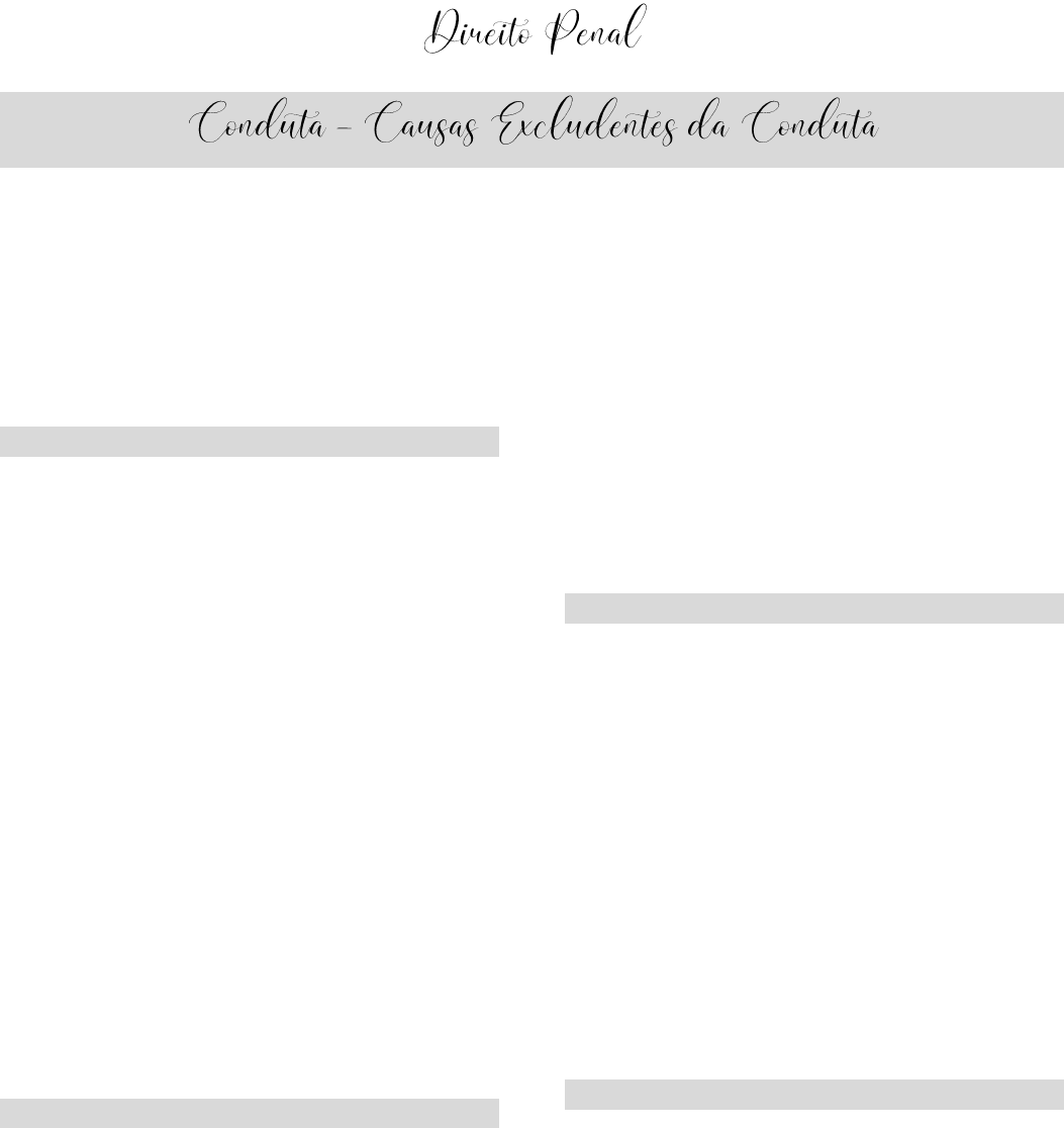 A conduta consiste no movimento humano voluntário e possui basicamente dois elementos: a) Comportamento voluntário (dirigido a um fim, ninguém a forçou); b) Exteriorização da vontade (mecanismos mecânicos); As causas que excluem a conduta Caso Fortuito ou de Força Maior: Caso fortuito: tem origem em causa desconhecida Ex. cabo elétrico aéreo que sem saber o motivo se rompe e cai sobre fio telefônicos causando incêndio e explosão de caldeira de usina); - o que deu causa a morte não é a conduta da pessoa; Força maior: trata-se de um fato da natureza, e portanto, pode-se conhecer o motivo ou a causa que deu origem ao acontecimento Ex. reio que provoca incêndio, forte chuva que causa alagamento, etc. - não tive conduta mecânica nem comportamento voluntário; Involuntaridade Trata-se da ausência de capacidade por parte do agente, de dirigir sua conduta conforme uma finalidade predeterminadas. São casos de involuntariedade: a) Estado de inocência completa: como o sonambulismo e a hipnose, não pratica o crime por falta de conduta, porque estava no estado completo de involuntariedade; b) Movimentos reflexo: apesar de ter movimento mecânico do corpo não há voluntariedade, porque o movimento foi causado por algum estimulo externo. Ex. estou na fila do banco, alguém chega atrás de mim e me dá um susto, ao levar o susto acabo dando um tapa na mulher que estava atrás de mim, causando lesão corporal; Não responderei por lesão corporal, pois não houve voluntariedade, por mais que houve a ação mecânica; - Não confundir com ação em curto circuitos (crime praticado por ímpeto de fúria e em fração de segundos); Coação Física Irresistível Aqui exclui a parte física, a exteriorização física do comportamento, os movimentos mecânicos do comportamento; Ex. menina termina o namoro e já arruma outro, o ex-namorado descobre e fica furioso, vai até a casa dela, encontra ela com o namorado novo, pega a mão dela segurando ela, e faz ela apartar o gatilho e matar o novo namorado, neste caso não foi ela quem matou, ela não pode responder por homicídio; -somente coação física deve ser irresistível, a moral não!! Anotações ____________________________________ ____________________________________ ____________________________________ ____________________________________ ____________________________________ ____________________________________ ____________________________________ ____________________________________ Crimes Comissivos: crime praticado por ação, por um fazer. O crime comissivo nada mais é do que a realização (ação) de uma conduta desvaliosa proibida pelo tipo penal incriminador. Viola um tipo penal proibitivo. Exemplos: homicídio, furto, roubou, falsificação de documento público etc. Viola o tipo penal proibitivo: cuidado com essa frase, pois artigo é diferente de norma (tipo), o artigo é o texto descrito na lei, ex. art. 121 – matar alguém, meu comportamento se encaixou ao artigo (tipicidade formal), a norma ou tipo é o espirito proibitivo, pois a norma fala não matar; Crimes omissivos: é a não realização (não fazer) de determinada conduta valiosa (comportamento ideal) a que o agente estava juridicamente obrigado e que lhe era possível concretizar. Viola um tipo mandamental. - te manda fazer algo e você não fez, ex. omissão de socorro; Divide-se em duas espécies: Crime Omissivo Próprios ou Puros/Propriamente ditos: no crime omissivo próprio ocorre o descumprimento de norma imperativa que determina a atuação do agente. Existe um dever genérico de agir que não é observado pelo destinatário da norma. Este dever, aliás, é dirigido a todos indistintamente (dever de solidariedade). Ex. Omissão de Socorro – art. 135 O próprio legislador escreve a conduta omissiva, ex. deixar de, não fazer etc... Se ninguém fizer nada todos respondem, agora se um fazer livra todos; Crime omissivo Impróprios ou Impuros/ Impropriamente ditos: chamado também de comissivos por omissão ou crime do garantidor. Nos crimes omissivos impróprios não basta a simples abstenção de comportamento. Aqui, o não fazer será penalmente relevante apenas quando o omitente possuir a obrigação de agir para impedir a ocorrência do resultado (dever jurídico). Mais do que o dever genérico de agir, aqui o omitente tem o dever jurídico de evitar a produção do evento; Tem o dever de enfrentar o perigo, de evitar a produção de um evento mais drástico; O legislador traz 3 personagens que deve de fato impedir; Decorre de cláusula geral, prevista no artigo 13, §1º do CP: a) Tenha por lei obrigação de cuidado, proteção ou vigilância, ex. policial; b) De outra forma, assumiu a responsabilidade de impedir o resultado; ex. contrato, eu contrato babá para cuidar dos meus filhos e ela fica só assistindo novela, ele cai e morre, ela responde pelo resultado; c) Com seu comportamento anterior, criou o risco da ocorrência do resultado; ex. se você coloca a vida de outras pessoas em risco, ascendo um cigarro no cinema e começa a pegar fogo, eu me torno garantidor tenho dever de salvar todo mundo; Ex. três pessoas estão na praia, sendo uma mulher, o salva vidas e um cadeirante que estava com um celular, eles avistam uma pessoa no mar pedindo socorro, mas não o ajudam, o moço morre afogado, qual será a responsabilidade de cada um? - a mulher responde por omissão de socorro; - o salva vida tinha a obrigação de salvar, então ele responderá por homicídio doloso é um crime de omissão impropria; No plano fático ele e a mulher praticaram a mesma conduta omissiva, só que ele é garantidor ele responde pelo resultado e ela pelo dever de solidariedade simples; - o cadeirante responderá por omissão de socorro, mesmo que ele não tinha a possibilidade de nadar, ele estava com o celular, então ele deveria ter chamado o resgate e ele não acionou. - a lei não exige o heroísmo de ninguém, mas se ele podia e devia fazer e não fez, 
