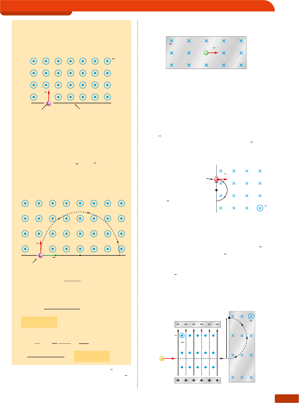 A força magnética 329 Exercícios de Aplicação 19. Uma carga elétrica puntiforme q = 2,0 μC, de massa m = 1,0 · 10−7 kg, penetra com velocidade v = 20 m/s numa região onde há campo magné- tico uniforme, de intensidade B = 4,0 T, como ilustra a figura. B v q anteparo0 a) Desenhe a trajetória descrita pela partícula. b) Sendo C o ponto onde a partícula atinge o anteparo, determine a distância OC. c) Determine o tempo gasto pela partícula para ir de O até C. Resolução: a) Sendo o ângulo θ de v com B igual a 90°, concluímos que a partícula descreve uma tra- jetória circular. Esta tem centro no anteparo, e, portanto, a trajetória é uma semicircunfe- rência de diâmetro OC. F v q centro 0 C b) A distância OC é o dobro do raio: OC = 2 · R = 2 · m · v |q| · B Sendo m = 1,0 · 10−7 kg; v = 20 m/s; q = 2,0 μC = 2,0 · 10−6 C; e B = 4,0 T, vem: OC = 2 · 1,0 · 10–7 · 20 2,0 · 10–6 · 4,0 OC = 0,50 m c) O tempo pedido é metade de um período: Δt = 1 2 T = 1 2 2π m |q|B = π m |q|B = = (3,14) (10–7) (2,0 · 10–6)(4,0) ⇒ Δt ≅ 0,039 s 20. Um elétron é lançado com velocidade v numa região onde há campo magnético uniforme B, como ilustra a figura. Sendo m a massa do elé- tron e q sua carga, são dados: m = 9,1 · 10–31 kg; |q| = 1,6 · 10–19 C; v = 3,2 · 106 m/s; B = 0,20 T. B v Supondo que a trajetória do elétron esteja total- mente contida na região onde há o campo: a) represente a trajetória do elétron; b) calcule o raio da trajetória; c) calcule o período do movimento; d) calcule a frequência do movimento. 21. Uma partícula cuja carga q tem módulo 3,0 μC e cuja massa é 6,0 · 10−8 kg penetra com velocida- de v , cujo módulo é 1,0 · 102 m/s, numa região onde há um campo magnético uniforme B (veja a figura) através de um orifício O existente num anteparo e descreve a semicircunferência indi- cada na figura. Sendo OC = 2,0 m, determine: a) o sinal de q; b) a intensidade de B; c) o intervalo de tempo gasto pela partícula para ir de O até C. 22. Na figura representamos um seletor de velocida- des associado a um espectrógrafo de massa. Uma partícula de massa m e carga q é lançada numa região onde há um campo elétrico uniforme E e um campo magnético uniforme B 1 (seletor de velo- cidades). A seguir, a partícula penetra no espec- trógrafo de massa, onde há um campo magnético uniforme B 2 e não há campo elétrico. A partícula descreve uma trajetória curva e atinge o antepa- ro num ponto P. São dados: q = 4,8 · 10−19 C; B 1 = 2,0 · 10−2 T; D = 1,60 m; E = 2,0 · 104 V/m; B 2 = 0,26 T. Calcule a massa da partícula. B 1 E espectrógrafo seletor m D q > 0 + + + + + + – – – – – – B2 P B v 0 q C Il U ST r A ç õ eS : ZA PT Capítulo 17330 Exercícios de Reforço 25. (Uneb-BA) Considere uma partícula eletrizada e um campo magnético uniforme. A partícula é lan- çada na direção e no sentido das linhas de força do campo magnético. Considerando-se apenas o campo magnético, o movimento da partícula será: a) retilíneo e uniforme. b) retilíneo e acelerado. c) retilíneo e retardado. d) circular e uniforme. e) helicoidal e uniforme. 26. (U. F. Uberlândia-MG) Uma partícula carregada se move no vácuo com uma velocidade constante. Quando se aplica um campo magnético uniforme e de direção perpendicular à do movimento da partícula, ocorre o seguinte: a) a partícula segue com velocidade constante. b) a partícula passa a descrever um movimento circular uniforme. c) a partícula passa a se mover na direção do campo magnético. d) a partícula passa a descrever um movimento retilíneo uniformemente acelerado. e) a partícula tem uma trajetória parabólica. 27. (Unifor-CE) Uma partícula eletrizada com carga q é lançada com velocidade v numa região onde existe um campo magnético uniforme de indução B. Considerando somente as interações magnéti- cas, é correto afirmar que, necessariamente: a) o módulo da velocidade v é alterado pelo campo de indução B. b) a partícula descreve um movimento retilíneo uniforme se v for perpendicular a B. c) a intensidade da força resultante sobre a par- tícula é nula se v for paralela a B. d) a direção da velocidade v é alterada pelo campo de indução B. e) a partícula descreve um movimento circular uniforme na região do campo de indução B. 28. (UF-AL) Uma partícula de massa 2,0 · 10−8 kg e carga elétrica −2,0 · 10−6 C penetra em uma região R onde existe um campo magnético uni- forme de intensidade 1,0 · 10−2 T, com velocidade v de módulo 1,0 · 102 m/s, perpendicularmente ao campo, como mostra a figura. v RB Entre as sentenças a seguir verifique quais são as verdadeiras: I. A partícula atravessará a região R sem sofrer desvio. 23. A partícula α é um núcleo de hélio e é formada por dois prótons e dois nêutrons. Uma partícula α e um próton penetram com a mesma velocida- de v numa região onde há um campo magnético uniforme B, como ilustra a figura. As partículas descrevem as trajetórias I e II. B v y (II) (I) x Lembrando que a massa do próton é aproximada- mente igual à massa do nêutron, responda: a) Qual a trajetória do próton? b) Qual o valor da razão y x ? 24. Um elétron com velocidade v = 4,0 · 106 m/s penetra numa região onde há um campo magné- tico uniforme, de intensidade B = 4,0 · 10−4 T, de modo que sua velocidade v forma um ângulo de 64° com o campo. B v 64¼ A trajetória do elétron será uma hélice. Sabendo que sen 64° ≅ 0,90 e cos 64° ≅ 0,44, calcule os valores aproximados: a) do raio da hélice; b) do passo da hélice. Il U ST r A ç õ eS : ZA PT A força magnética 331 II. Ao penetrar na região R, a partícula será des- viada para a direita. III. Na região R a partícula ficará sujeita a uma força magnética de intensidade 2,0 · 10−6 N. IV. No interior de R o módulo da velocidade da partícula aumentará à razão de 100 m/s em cada seg