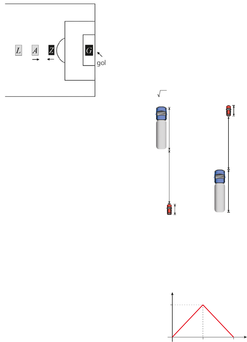 125TÓPICO 3 | MOVIMENTO UNIFORMEMENTE VARIADO impedimento, deve haver ao menos dois jogadores adversários a sua frente, G e Z, no exato instante em que o jogador L lança a bola para A (ver figura). Considere que somente os jogadores G e Z estejam à frente de A e que somente A e Z se deslocam nas situações descritas a seguir. a) Suponha que a distância entre A e Z seja de 12 m. Se A parte do repouso em direção ao gol com aceleração de 3,0 m/s2 e Z também parte do repouso com a mesma aceleração no sen- tido oposto, quanto tempo o jogador L tem para lançar a bola depois da partida de A antes que A encontre Z? b) O árbitro demora 0,1 s entre o momento em que vê o lançamento de L e o momento em que de- termina as posições dos jogadores A e Z. Con- sidere agora que A e Z movem-se a velocidades constantes de 6,0 m/s, como indica a figura. Qual a distância mínima entre A e Z no momen- to do lançamento para que o árbitro decida de forma inequívoca que A não está impedido? 62. (Uepa) Uma das causas de acidentes de trânsito é a imprudência de certos motoristas, que realizam manobras arriscadas ou inapropriadas. Por exem- plo, em uma manobra realizada em um trecho retilíneo de uma rodovia, o motorista de um auto- móvel de passeio de comprimento igual a 3,0 m resolveu ultrapassar, de uma só vez, uma fileira de veículos medindo 17,0 m de comprimento. Para realizar a manobra, o automóvel, que se deslo- cava inicialmente a 90 km/h, acelerou uniformemen- te, ultrapassando a fileira de veículos em um inter- valo de tempo de 4,0 s. Supondo-se que a fileira se tenha mantido em movimento retilíneo uniforme, a uma velocidade escalar de 90,0 km/h, afirma-se que a velocidade escalar do automóvel, no instante em que a sua traseira ultrapassou completamente a fi- leira de veículos, era, em m/s, igual a: a) 25,0 b) 30,0 c) 35,0 d) 40,0 e) 45,0 63. (Olimpíada Peruana de Física) Um carro e um caminhão se deslocam ao longo de uma mesma estrada retilínea. No instante t 5 0, ambos têm a mesma velocidade escalar de 20,0 m/s e a par- te dianteira do carro está 25,0 m atrás da parte traseira do caminhão. O comprimento do carro é de 5,0 m e do caminhão é de 20,0 m. O cami- nhão se mantém em movimento uniforme. Para ultrapassar o caminhão, o carro acelera com aceleração escalar constante de 0,60 m/s2, que é mantida até que, no instante t 5 T, a parte traseira do carro está 25,0 m à frente da parte dianteira do caminhão. Dado: 10 3,2.> 20,0 m 20,0 m 25,0 m t 5 0 t 5 T 25,0 m 5,0 m 5,0 m O valor de T é mais próximo de: a) 5,0 s b) 7,0 s c) 8,0 s d) 10,0 s e) 16,0 s 64. (AFA-SP) A maior aceleração (ou retardamento) tolerada pelos passageiros de um trem urbano tem módulo igual a 1,5 m/s2. É dado o gráfico da velocidade escalar do trem em função do tempo entre duas estações. t (s) v (m/s) 0 2TT v m‡x R e p ro d u ç ã o /A rq u iv o d a e d it o ra R e p ro d u ç ã o /A rq u iv o d a e d it o ra R e p ro d u ç ã o /U n ic a m p , 2 0 1 0 1CONECTEFIS_MERC18Sa_U1_Top3_p087a129.indd 125 8/9/18 8:50 AM 126 UNIDADE 1 | CINEMÁTICA A trajetória do trem é suposta retilínea. O módu- lo da velocidade máxima que pode ser atingida pelo trem, que parte de uma estação rumo à ou- tra, distante 600 m da primeira, em m/s, vale: a) 30 b) 42 c) 54 d) 68 e) 72 65. (Ceperj) Um trem A viajava com uma velocidade escalar de 40 m/s quando seu maquinista percebeu que, nos mesmos trilhos à sua frente, encontra- va-se outro trem, B, em repouso. Imediatamente, ele aplica os freios, imprimindo ao trem A uma aceleração retardadora constante. Nesse mesmo instante, o trem B parte uniformemente acelerado. Felizmente, por isso, foi evitada a colisão. A figura abaixo representa os gráficos velocidade escalar- -tempo dos dois trens, sendo t 5 0 o instante em que, simultaneamente, o trem A começou a frear, e o trem B partiu acelerado. t (s) v (m/s) 0 1,0 2,0 A B 3,0 4,0 5,0 6,0 7,0 8,0 9,0 10,0 8,0 16,0 24,0 32,0 40,0 Sabendo-se que nesse instante t 5 0 a distância entre ele era de 162,0 m, pede-se determinar a menor distância entre a dianteira do trem A e a traseira do trem B. 66. (FMTM-MG) Nas planícies africanas, o jogo entre predador e presa encontra um limite delicado. A gazela, sempre atenta, vive em grupos. É rápi- da e seu corpo suporta uma aceleração de 0 m/s a 14 m/s em 3,0 s. O guepardo, com sua cabeça pequena e mandí- bulas curtas projetadas para um abate preciso por estrangulamento, está bem camuflado e, com seu corpo flexível, amplia sua passada, sobrevoan- do o solo na maior parte de sua corrida. Mais ágil que a gazela vai de 0 m/s a 20,0 m/s em 3,0 s. O esforço, no entanto, eleva sua temperatura a níveis perigosos de sobrevivência e, em virtude disto, as perseguições não podem superar 20,0 s. Um guepardo aproxima-se a 27,0 m de uma gaze- la. Parados, gazela e guepardo fitam-se simulta- neamente, quando, de repente, começa a caçada. Supondo-se que ambos corram em uma trajetória retilínea comum e, considerando-se o gráfico dado a seguir, que traduz o desempenho de cada animal, qual a duração da caçada? t (s) v (m/s) 0 1,0 2,0 guepardo gazela 3,0 4,0 5,0 6,0 7,0 8,0 9,0 10,0 14,0 20,0 67. (FCMSCSP) Um motorista dirigia seu automóvel por uma estrada reta. Ao passar pela placa 1, com velocidade de 25 m/s, iniciou a frenagem de seu veículo mantendo uma desaceleração constante até passar pela lombada. Em seu trajeto, passou pela placa 2, com velocidade de 15 m/s. O intervalo de tempo decorrido entre a passagem do veículo pela placa 1 e a passagem pela lom- bada foi de a) 30 s. b) 20 s. c) 25 s. d) 10 s. e) 15 s. 68. Considere um carrinho de brinquedo que vai par- tir do repouso de um ponto A de uma pista reta e horizontal no instante t0 5 0. Esse veículo vai des- crever um MUV de modo a passar por um ponto B, distante 4,0 m de A, com velocidade escalar vB, e por um ponto C, distante 12,0 m de B, com ve- locidade escalar vC, depois de