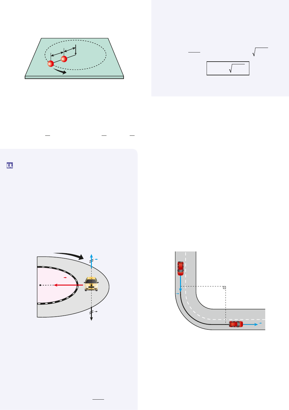 314 UNIDADE 2 | DINÂMICA 29. Um carro percorre uma pista circular de raio R, contida em um plano horizontal. O coeficiente de atrito estático entre seus pneus e o asfalto vale m e, no local, a aceleração da gravidade tem módulo g. Despreze a influência do ar. a) Com que velocidade linear máxima o carro deve deslocar-se ao longo da pista, com a condição de não derrapar? b) A velocidade calculada no item anterior depende da massa do carro? Resolução: MCU P C F n F at a) Na figura, estão representadas as forças que agem no carro. A reação normal da pista (F &n) equilibra o peso do carro (P &): Fn 5 P ⇒ Fn 5 mg (I) Já a força de atrito (F &at) é a resultante cen- trípeta que mantém o carro em movimen- to circular e uniforme (MCU): Fat 5 Fcp ⇒ Fat 5 mv R 2 (II) E.R. Como não há derrapagem, o atrito entre os pneus do carro e o solo é do tipo estático. Assim: Fat < Fatd ⇒ Fat < mFn (III) Substituindo (I) e (II) em (III), vem: mv R 2 < mmg ⇒ v < mgR vmáx 5 mgR b) A velocidade calculada independe da mas- sa do carro. 28. A figura representa duas esferas iguais, E 1 e E 2 , que, ligadas a fios inextensíveis e de massas des- prezíveis, descrevem movimento circular e uniforme sobre uma mesa horizontal perfeitamente lisa: Desprezando o efeito do ar e supondo que E 1 e E 2 se mantenham sempre alinhadas com o centro, aponte a alternativa que traz o valor correto da relação T1/T2, respectivamente, das forças de tra- ção nos fios (1) e (2): a) 2 b) 3 2 c) 1 d) 2 3 e) 1 2 L L (1) (2) E 1 E 2 30. Um carro deverá fazer uma curva circular, contida em um plano horizontal, com velocidade de intensi- dade constante igual a 108 km/h. Se o raio da curva é R 5 300 m e g 5 10 m/s2, o coeficiente de atrito estático entre os pneus do carro e a pista (m) que permite que o veículo faça a curva sem derrapar: a) é m > 0,35. b) é m > 0,30. c) é m > 0,25. d) é m > 0,20. e) está indeterminado, pois não foi dada a massa do carro. 31. Um estudante, indo para a faculdade em seu carro, desloca-se num plano horizontal, no qual descreve uma trajetória curvilínea de 48 m de raio, com ve- locidade constante, em módulo. Entre os pneus e a pista, o coeficiente de atrito estático é de 0,30. v 2 d ir e çã o i n ic ia l direção �nal B A O v 1 Considerando-se a figura, a aceleração da gravida- de no local, com módulo de 10 m/s2, e a massa do carro de 1,2 t, faça o que se pede: a) Caso o estudante resolva imprimir uma velo- cidade de módulo 60 km/h ao carro, ele con- seguirá fazer a curva? Justifique. b) A velocidade escalar máxima possível, para que o carro possa fazer a curva, sem derrapar, irá se alterar se diminuirmos sua massa? Explique. B a n c o d e i m a g e n s / A rq u iv o d a e d it o ra B a n c o d e i m a g e n s / A rq u iv o d a e d it o ra B a n c o d e i m a g e n s / A rq u iv o d a e d it o ra 1CONECTEFIS_MERC18Sa_U2_Top3_p297a328.indd 314 8/9/18 8:53 AM 315TÓPICO 3 | RESULTANTES TANGENCIAL E CENTRÍPETA 32. Na figura seguinte, um carrinho de massa 1,0 kg descreve movimento circular e unifor- me ao longo de um trilho envergado em forma de circunferência de 2,0 m de raio: B A 2,0 m O g A velocidade escalar do carrinho vale 8,0 m/s, sua trajetória pertence a um plano vertical e adota-se |g &| 5 10 m/s 2. Supondo que os pon- tos A e B sejam, respectivamente, o mais alto e o mais baixo do trilho, determine a intensi- dade da força que o trilho exerce no carrinho: a) no ponto A; b) no ponto B. Resolução: Como o carrinho executa movimento circular e uniforme, em cada ponto da trajetória a re- sultante das forças que nele agem deve ser centrípeta. Calculemos a intensidade cons- tante dessa resultante: Fcp 5 mv R 2 Fcp 5 1,0 (?0 (8,0) 2,0 2 [ Fcp 5 32 N O peso do carrinho vale: P 5 mg 5 1,0 ? 10 [ P 5 10 N a) No ponto A, o esquema das forças que agem no carrinho está dado abaixo: A O F n A P F &nA 5 força que o trilho exerce no carrinho em A. A resultante de F &nA e P & deve ser centrípeta, isto é: F &cpA 5 F &nA 1 P& E.R. Em módulo: FcpA 5 FnA 1 P Calculemos FnA: FnA 5 FcpA 2 P ⇒ FnA 5 32 2 10 FnA 5 22 N b) No ponto B, o esquema das forças que agem no carrinho está dado a seguir: O B F n B P F &nB 5 força que o trilho exerce no carrinho em B. A resultante de F &nB e P & deve ser centrípeta, isto é: F &cpB 5 F &nB 1 P& Em módulo: FcpB 5 FnB – P Calculemos FnB: FnB 5 FcpB 1 P ⇒ FnB 5 32 1 10 FnB 5 42 N 33. (Fuvest-SP) Nina e José estão sentados em cadei- ras, diametralmente opostas, de uma roda-gigan- te que gira com velocidade angular constante. Num certo momento, Nina se encontra no ponto mais alto do percurso e José, no mais baixo; após 15 s, antes de a roda completar uma volta, suas posições estão invertidas. A roda-gigante tem raio R 5 20 m e as massas de Nina e José são, res- pectivamente, MN 5 60 kg e MJ 5 70 kg. Calcule a) o módulo V da velocidade linear das cadeiras da roda-gigante; b) o módulo aR da aceleração radial de Nina e de José; c) os módulos NN e NJ das forças normais que as cadeiras exercem, respectivamente, sobre Nina e sobre José no instante em que Nina se en- contra no ponto mais alto do percurso e José, no mais baixo. B a n c o d e i m a g e n s /A rq u iv o d a e d it o ra B a n c o d e i m a g e n s /A rq u iv o d a e d it o ra B a n c o d e i m a g e n s /A rq u iv o d a e d it o ra Note e adote: π 5 3 Módulo da aceleração da gravidade g 5 10m/s2 1CONECTEFIS_MERC18Sa_U2_Top3_p297a328.indd 315 8/9/18 8:53 AM 316 UNIDADE 2 | DINÂMICA 34. (Unicamp-SP) A figura adiante descreve a traje- tória ABMCD de um avião em um voo em um pla- no vertical. Os trechos AB e CD são retilíneos. O trecho BMC é um arco de 90° de uma circunfe- rência de 2,5 km de raio. O avião mantém veloci- dade de módulo constante igual a 900 km/h. O piloto tem massa de 80 kg e está sentado sobre uma balança (de mola) neste voo experimental. Adotando-se g 5 10 m/s² e π ≅ 3, pergunta-se: a) Quanto tempo o 