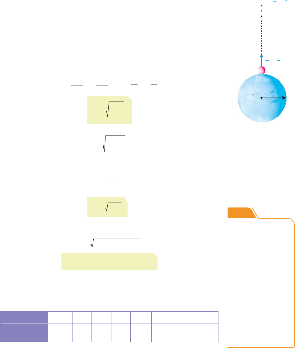 491TÓPICO 7 | ENERGIA MECÂNICA E SUA CONSERVAÇÃO Velocidade de escape Admita que uma partícula de massa m seja lançada sucessivas vezes para cima, a partir da superfície de um astro esférico e homogêneo, de massa M e raio R, isolado e estacionário no espaço. Despreze as influências atmosféricas. Os lançamentos são verticais (radiais ao astro) e realizados com velocidades de intensidades crescentes. Inicialmente, a partícula sobe, atinge velocidade nula no ponto de altura má- xima e volta ao solo, atraída gravitacionalmente pelo astro. Entretanto, haverá um lançamento em que a partícula subirá tanto que chegará ao “fim” do campo gravitacional (infinito). Ao chegar a esse ponto, ela apresentará velocidade nula e permanecerá em repouso, não mais retornando ao solo. Diremos, então, que a partícula escapou da gravidade do astro e, nesse caso, chamaremos a velocidade de lançamento de velocidade de escape (v e ). Para calcularmos ve, consideremos os elementos da figura ao lado. O sistema é conservativo, permitindo-nos aplicar o Princípio de Conservação da Energia Mecânica. EmA 5 EmB mv 2 G Mm R 0e 2 2 5 ⇒ 5 v 2 G M R e 2 ` M R A m B v B 5 0 v A 5 v e v 2GM Re 5 5v 2g Re 0 ve ≅ 11,2 ? 10 3 m/s 5 11,2 km/s Multiplicando e dividindo a fração contida no radical acima por R, teremos: v 2 GM R Re 25 (I) Na Gravitação, vimos que a intensidade da aceleração da gravidade na super- fície do astro (g0) pode ser expressa por: g GM R 0 2 5 (II) Substituindo (II) em (I), obtemos: Se o astro for a Terra, teremos g0 ≅ 9,81 m/s 2 e R ≅ 6,38 ? 106 m. Calculemos, então, ve para a Terra: ve ≅ 2 9,81 6,38 10 6 ? ? ? É claro que a partícula, se for lançada com velocidade maior que a de escape, chegará ao “fim” do campo gravitacional ainda em movimento e prosseguirá com velocidade constante, por inércia, livre da atração do astro de onde partiu, até entrar em zona de influência (campo gravitacional) de um outro astro. Planeta Mercúrio Vênus Terra Marte Júpiter Saturno Urano Netuno Velocidade de escape (km/s) 4,3 10,4 11,2 5,0 59,5 35,5 21,3 23,5 NOTAS! • A velocidade de escape de um buraco negro (estágio final de uma grande estrela que es- gotou seu combustível nuclear) é maior que a velocidade da luz no vácuo (≅ 3,0 ? 105 km/s), o que justifica o fato de nem mesmo a luz con- seguir escapar de sua excepcional influência gravitacional. • A velocidade de escape da Lua é de 2,4 km/s e a do Sol é estimada em 617,5 km/s. B a n c o d e i m a g e n s /A rq u iv o d a e d it o ra Fonte:<https://nssds.gsfc.nasa.gov/planetary/factsheet>. Acesso em: 3 ago. 2018. 1CONECTEFIS_MERC18Sa_U2_Top7_p455a492.indd 491 8/9/18 9:02 AM 492 UNIDADE 2 | DINÂMICA 90. Um corpo, lançado verticalmente da superfície da Terra (massa M e raio R), atinge uma altura máxima igual ao triplo do raio terrestre. Supon- do a Terra estacionária no espaço, calcule a in- tensidade da velocidade de lançamento do corpo. Considere conhecida a Constante da Gravitação G e admita que, durante o movimento, a única força que age no corpo seja a gravitacional exer- cida pela Terra. Exercícios 89. Um artefato espacial sem propulsão, lançado verticalmente da superfície de um planeta de massa M e raio R, atinge uma altura máxima igual a R. Supondo que o planeta seja isolado, estacionário e sem atmosfera, calcule a in- tensidade da velocidade de lançamento do artefato. Considere conhecida a Constante da Gravitação G. Resolução: Sistema conservativo: M R A d = 2R B v B = 0 v A = v 0 EmA 5 EmB mv 2 G Mm R G Mm 2R 0 2 2 52 v 2 G M R G M 2R 0 2 5 2 Logo: v GM R0 5 E.R. 91. (PUCC-SP) Calcular o módulo da velocidade que adquiriria um corpo se, partindo do repouso de um ponto B, infinitamente afastado, caísse livre- mente na superfície da Terra, num ponto A. Despreze todos os movimentos da Terra (raio igual a 6,4 ? 106 m), a influência do ar e adote a aceleração da gravidade na superfície do planeta igual a 10 m/s2. 92. (UFG-GO) Um satélite, lançado da superfície da Terra, é destinado a permanecer em órbita ter- restre a uma altura R. Supondo que a energia mecânica do satélite seja conservada, que R seja o raio da Terra e g a aceleração da gravidade em sua superfície, podemos afirmar que o módulo da velocidade de lançamento é: a) 3 2 Rg 1 2 b) [2gR] 1 2 c) 2 3 gR 1 2 d) [3gR] 1 2 e) 1 2 gR 1 2 93. Na figura, dois corpos celestes de massas iguais a M, com centros de massa separados por uma distância D, descrevem movimento circular e uniforme em torno do centro de massa (CM) do sistema. As únicas forças a serem consideradas são as de atração gravitacional trocadas entre os dois corpos. M D M CM Sendo G a Constante da Gravitação, calcule: a) a energia cinética de um dos corpos em relação ao centro de massa do sistema; b) a energia de ligação entre os dois corpos. Con- sidere nula a energia potencial gravitacional no caso de a distância entre os dois corpos ser infinita. B a n c o d e i m a g e n s /A rq u iv o d a e d it o ra B a n c o d e i m a g e n s /A rq u iv o d a e d it o ra 1CONECTEFIS_MERC18Sa_U2_Top7_p455a492.indd 492 8/9/18 9:02 AM 493TÓPICO 8 | QUANTIDADE DE MOVIMENTO E SUA CONSERVAÇÃO T î P I C O Quantidade de movimento e sua conservação 8 Diariamente vivenciamos situações que envolvem a interação com outros corpos, desde um simples empurrão que impulsiona um objeto até colisões que podem representar perigo a nossa integridade física. Neste tópico, apresentaremos os conceitos de impulso de uma força e de quantidade de movimento (ou momento linear). Salientamos desde já o caráter vetorial dessas duas grandezas. Veremos o Teorema do Impulso, que estabele‑ ce uma correlação entre impulso e variação de quantidade de movimento, e, em seguida, abordaremos os sistemas isolados de forças externas, em que se con‑ serva a quantidade de movimento total. Por último, trataremos, de forma espe‑ cífica, das colisõ