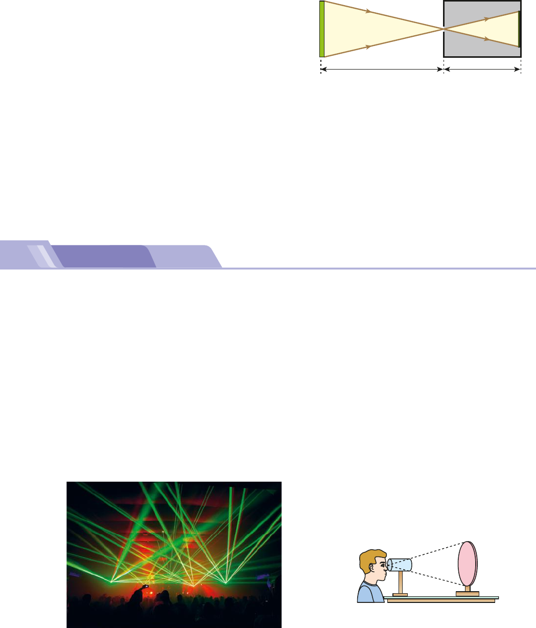 418 UNIDADE 3 | ÓPTICA GEOMÉTRICA 16. (UFG-GO) Um feixe luminoso, partindo de uma fonte puntiforme, incide sobre um disco opaco de 10 cm de diâmetro. Sabendo-se que a distância da fonte ao disco corresponde a um terço da dis- tância deste ao anteparo e que os planos da fonte, do disco e do anteparo são paralelos, pode-se afirmar que o raio da sombra do disco, projetada sobre o anteparo, é de: a) 15 cm. b) 20 cm. c) 25 cm. d) 35 cm. e) 40 cm. 17. O esquema representa o corte de uma câmara escura de orifício, diante da qual existe um corpo luminoso AB de 40 cm de comprimento: A B A' B' a b O Considerando a 5 100 cm e b 5 20 cm, calcule o comprimento da figura A'B' projetada na parede do fundo da câmara. 18. Num eclipse da Lua, a posição relativa dos três astros, Sol, Lua e Terra, é a seguinte: a) O Sol entre a Lua e a Terra. b) A Lua entre o Sol e a Terra. c) A Terra entre o Sol e a Lua. d) A Terra e a Lua à esquerda do Sol. e) É impossível a ocorrência de um eclipse da Lua. Exercícios Nível 2 19. Na foto abaixo, aparece o palco de um show mu- sical em que diversos pincéis luminosos de laser provenientes de um sofisticado sistema de ilu- minação se cruzam, mas seguem se propagando mesmo depois desses cruzamentos. O ambiente está um tanto esfumaçado pela presença de go- tículas de água colocadas em suspensão por moléculas de CO2 gasoso logo após sublimação dessa substância (gelo seco – CO2 sólido – a tem- peraturas muito baixas sublima-se ao ser colo- cado em contato com água em temperatura ambiente). Isso realça sobremaneira a presença dos pincéis laser, permitindo sua visualização de qualquer ponto da plateia. a) Nessa imagem, podem ser comprovados dois princípios em que se baseia o estudo da Óptica Geométrica. Quais são eles? Enuncie esses princípios. b) Por que o ambiente esfumaçado favorece a visualização dos pincéis luminosos de laser de qualquer ponto da plateia? 20. Um grupo de escoteiros deseja construir um acampamento em torno de uma árvore. Por se- gurança, eles devem colocar as barracas a uma distância tal da base da árvore que, se cair, ela não venha a atingi-los. Aproveitando o dia ensolarado, eles mediram, ao mesmo tempo, os comprimen- tos das sombras da árvore e de um deles, que tem 1,5 m de altura; os valores encontrados foram 6,0 m e 1,8 m, respectivamente. Qual deve ser a menor distância das barracas à base da árvore? 21. Considere o esquema abaixo, em que o obser- vador olha através de um canudo cilíndrico, de eixo horizontal, de 20 cm de diâmetro e 80 cm de comprimento. canudo disco O rapaz observa que um disco, de centro contido na reta do eixo do canudo, distante 8,0 m do seu olho, parece encaixar-se perfeitamente na boca do canudo. Supondo desprezível a distância do olho do rapaz ao canudo, calcule o raio do disco, admitindo que seja circular. Banco de imagens/ Arquivo da editora C J T /Z a p t/ A rq u iv o d a e d it o ra zh y k o v a /S h u tt e rs to ck 2CONECTEFis_MERC18Sa_U3_Top1_p400a438.indd 418 7/7/18 2:26 PM 419TÓPICO 1 | FUNDAMENTOS DA ÓPTICA GEOMÉTRICA 22. (FCC-SP) O orifício de uma câmara escura está voltado para o céu, numa noite estrelada. A pa- rede oposta ao orifício é feita de papel vegetal translúcido. Um observador que está atrás da câmara, se olhasse diretamente para o céu, ve- ria o Cruzeiro do Sul conforme o esquema I. Olhando a imagem no papel vegetal, por trás da câmara, o observador vê o Cruzeiro conforme o esquema: esquema I esquema II esquema IV esquema V esquema III a) I. b) II. c) III. d) IV. e) V. Logo: 5 ? P d o 5 100 o 1 ⇒ P1 5 20d (I) 2o Caso: i2 5 50% ? o ⇒ i 50 100 o2 5 ? Logo: 5 ? P d o 50 100 o 2 ⇒ P2 5 2d (II) De (I) e (II), temos: 5 P P 2d 20d 2 1 ⇒ P P 102 1 5 23. (Uerj) A altura da imagem de um objeto, po- sicionado a uma distância P1 do orifício de uma câmara escura, corresponde a 5% da altura desse objeto. A altura da imagem desse mesmo objeto, posicionado a uma distância P2 do orifício da câmara escura, corresponde a 50% de sua altura. Calcule P2 em função de P1. Resolução: dP o i orif’cio Pela semelhança de triângulos, temos: 5 P d o i 1o Caso: i1 5 5% ? o ⇒ i 5 100 o15 ? E.R. 24. (Ufscar-SP) A 1 metro da parte frontal de uma câmara escura de orifício, uma vela de compri- mento 20 cm projeta na parede oposta da câmara uma imagem de 4 cm de altura. A câmara permite que a parede onde é projetada a imagem seja movida, aproximando-se ou afas- tando-se do orifício. Se o mesmo objeto for co- locado a 50 cm do orifício, para que a imagem obtida no fundo da câmara tenha o mesmo ta- manho da anterior, 4 cm, a distância que deve ser deslocado o fundo da câmara, relativamente à sua posição original, em cm, é de a) 50 b) 40 c) 20 d) 10 e) 5 25. (UEL-PR) A figura a seguir representa uma fonte extensa de luz L e um anteparo opaco A dispostos paralelamente ao solo (S): S 2,0 m h A L 80 cm 60 cm O valor mínimo de h, em metros, para que sobre o solo não haja formação de sombra é: a) 2,0. b) 1,5. c) 0,80. d) 0,60. e) 0,30. R e p ro d u ç ã o /A rq u iv o d a e d it o ra R e p ro d u ç ã o /A rq u iv o d a e d it o ra R e p ro d u ç ã o /A rq u iv o d a e d it o ra R e p ro d u ç ã o /A rq u iv o d a e d it o ra 2CONECTEFis_MERC18Sa_U3_Top1_p400a438.indd 419 7/7/18 2:27 PM 420 UNIDADE 3 | ÓPTICA GEOMÉTRICA 26. (Vunesp) Lampiões a gás utilizam uma tela em forma de casulo, conhecida popularmente por camisinha, que veste o tubo por onde sai o gás. O gás expelido pelo tubo passa rapidamente pelos furos da tela e, quando é inflamado, o faz longe o suficiente da camisinha para que ela não se queime. Como consequência da queima do gás, a camisinha passa a emitir luz, tal qual uma fonte extensa. vidro protetor camisinha reservatório de gás Associando-se a luz do lampião com a luz emiti- da pelo Sol, um professor decide demonstrar como ocorre um eclipse solar. Para isso, usa uma moeda de tamanho menor q