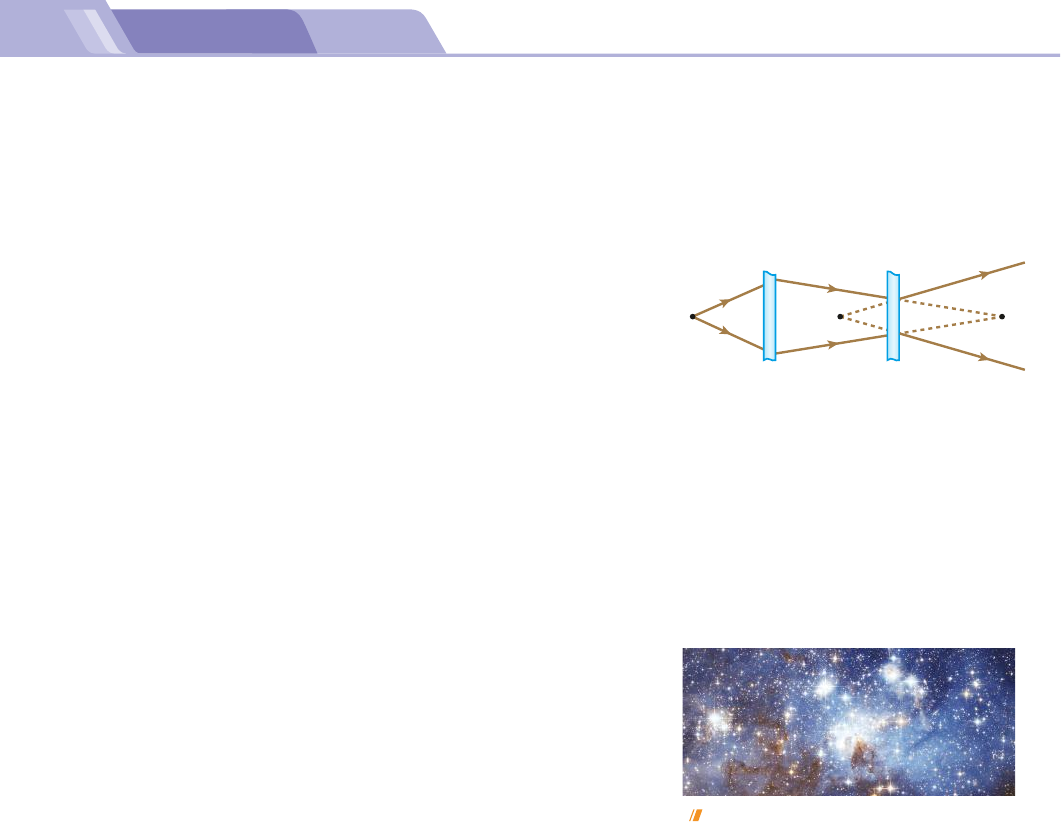 433TÓPICO 1 | FUNDAMENTOS DA ÓPTICA GEOMÉTRICA 34. A luz incidente recebida por L 1 provém de um: a) POR. b) POV. c) POI. d) PIR. e) PII. 35. Em relação a L 1 , o ponto P 1 é: a) POR. b) POV. c) PIR. d) PIV. e) PII. 36. Em relação a L 2 , o ponto P 1 é: a) POR. b) POV. c) PIR. d) PIV. e) PII. 37. Em relação a L 2 , o ponto P 2 é: a) POR. b) POV. c) PIR. d) PIV. e) PII. 38. Em relação a E, o ponto P 2 comporta-se como: a) POR. b) POV. c) PIR. d) PIV. e) PII. 39. Em relação a E, o ponto P 3 é: a) POR. b) POV. c) PIR. d) PIV. e) PII. Exercícios Nível 2 40. A janela de um quarto escuro dá para a rua, inten- samente iluminada pelo Sol. Abrindo uma estreita fresta na janela, um observador que está dentro do quarto percebe a entrada de um feixe de luz, que, além de poder ser visto de diversos locais do quarto, ilumina uma área do seu piso. A respeito dessa situação, analise as proposições seguintes: I. Ao passar da rua para o interior do quarto, a luz sofre refração. II. Ao incidir no piso do quarto, a luz sofre reflexão regular. III. O feixe de luz pode ser visto de diversos locais do quarto devido à difusão da luz por partícu- las suspensas no ar. O que você concluiu? a) Todas são corretas. b) Todas são erradas. c) Apenas I e II são corretas. d) Apenas I e III são corretas. e) Apenas III é correta. 41. (PUCC–SP) Num quarto absolutamente escuro, existem: 1. uma fonte de luz intensa, cujo feixe tem seção constante de 5 mm de diâmetro; 2. um espelho plano; 3. um anteparo branco não polido; 4. uma bola de futebol usada. Ao se acender a fonte, a maneira de obter uma visão da superfície da bola (superfície essa de maior área) é dirigir o feixe de luz colimado: a) para o anteparo e iluminar a bola com a luz difundida. b) para o espelho em incidência rasante e iluminar a bola com a luz refletida. c) para o espelho sob ângulo de 608 e iluminar a bola com a luz refletida. d) para o espelho sob ângulo de incidência de 308 e iluminar a bola com a luz refletida. e) diretamente para a bola. 42. Na figura seguinte, S 1 e S 2 são sistemas ópticos e P 1 é uma fonte puntiforme de luz: Com base nessa situação, responda: P 2 P 3 P 1 S 1 S 2 a) O que representa P 1 em relação a S 1 ? b) O que representa P 2 em relação a S 1 ? E em relação a S 2 ? c) O que representa P 3 em relação a S 2 ? 43. (UFF-RJ) O telescópio refletor Hubble foi coloca- do em órbita terrestre, de modo que, livre das distorções provocadas pela atmosfera, tem obtido imagens espetaculares do universo. O Hubble é constituído por dois espelhos esféricos. Imagem obtida pelo telescópio Hubble. O espelho primário é côncavo e coleta os raios lumi- nosos oriundos de objetos muito distantes, refletindo-os em direção a um espelho secundário, convexo, bem menor que o primeiro. O espelho secundário, então, reflete a luz na direção do espelho principal, de modo que esta, passando por um orifício em seu centro, é focalizada em uma pequena região onde se encontram os detectores de imagem. B a n c o d e i m a g e n s / A rq u iv o d a e d it o ra P h o to R e s e a rc h e rs / N A S A /D io m e d ia 2CONECTEFis_MERC18Sa_U3_Top1_p400a438.indd 433 7/7/18 2:28 PM 434 UNIDADE 3 | ÓPTICA GEOMÉTRICA 46. O outono em alguns países, especialmente no hemisfério norte, é marcado pela natureza de forma pronunciada e bela. Árvores de diversas espécies têm suas folhas modificadas, adqui- rindo tons avermelhados que vão do ocre ao lilás. Isso significa que essas folhas se tornam ricas em pigmentos carotenoides que superam em quantidade os pigmentos clorofila. No diagrama abaixo, aparecem curvas que associam para as clorofilas e os carotenoides porcentagens de absorção de luz, em orde- nadas, em função de comprimentos de onda de radiação visível, em abscissas. comprimento de onda (nm) porcentagem absorvida 10 0 20 30 40 50 60 70 80 90 100 400 450 500 550 600 650 700 clorofilas carotenoides Com base no diagrama, responda: a) Qual a coloração predominante manifes- tada por folhas ricas em pigmentos cloro- fila quando iluminadas pela luz do Sol? b) Folhas ricas em pigmentos carotenoides difundem mais intensamente, sob a luz do Sol, que comprimentos de onda? E.R. quadriculadas com as cores da bandeira italiana, ou seja, pequenos quadrados com as cores Vermelho, Verde e Branco. Um proprietário quis dar maiores efeitos visuais e iluminou o ambiente exclusivamen- te com luz Magenta. As cores dos quadriculados das toalhas, Vermelho, Verde e Branco, sob essa ilumi- nação são vistas respectivamente: a) Preto, Verde e Branco. b) Vermelho, Preto e Magenta. c) Vermelho, Verde e Magenta. d) Magenta, Verde e Branco. detector de imagem plano focal espelho primário espelho secundário luz Com relação a esse sistema óptico, pode-se afir- mar que a imagem que seria formada pelo espelho primário é: a) virtual e funciona como objeto virtual para o espelho secundário, já que a imagem final tem de ser virtual. b) real e funciona como objeto real para o espelho secundário, já que a imagem final tem de ser virtual. c) virtual e funciona como objeto virtual para o espelho secundário, já que a imagem final tem de ser real. d) real e funciona como objeto virtual para o es- pelho secundário, já que a imagem final tem de ser real. e) real e funciona como objeto real para o espelho secundário, já que a imagem final tem de ser real. 44. Considere as proposições seguintes: I. Uma imagem real pode ser projetada em um anteparo. II. Uma imagem virtual pode ser projetada em um anteparo. III. Qualquer ponto que se comporta como imagem real pode ser projetado em um anteparo. IV. Para que uma imagem real seja visada por um observador, ela deve estar necessariamente, pro- jetada em um anteparo. É (são) correta(s): a) todas. b) somente I. c) somente II. d) somente I e III. e) somente I, III e IV. 45. (SBF) As cores-luz primárias são Vermelho, Verde e Azul. As combinações de pares de