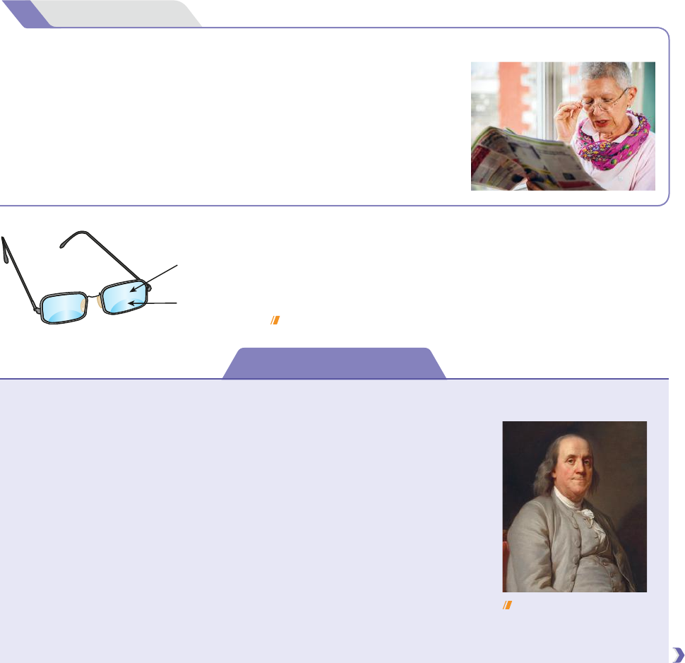 610 UNIDADE 3 | ÓPTICA GEOMÉTRICA É importante observar que: • As lentes convergentes corretivas da hipermetropia são “positivas”, isto é: f . 0 e V . 0. • No dimensionamento da distância focal (e da vergência) apresentado na página anterior, foi desprezada a distância entre a lente corretiva e a lente ocular. • Na aplicação da Equação de Gauss, fizemos p' , 0, porque a imagem conjugada pela lente corretiva é virtual. Presbiopia (ou vista cansada) A presbiopia é um defeito que consiste no enrijecimento dos músculos ciliares ou da própria lente natural do olho, o que ocorre com o evoluir da idade. A presbiopia é uma ametropia (defeito visual) comum às pessoas com idade superior a 40 anos, que, com a limitação de sua capacidade de acomodação visual, têm dificuldades em “ver de longe” e também “de perto”. Lentes para melhorar a visão “de perto” No que diz respeito à visualização de objetos próximos, um portador de presbiopia apresenta dificuldades visuais semelhantes às de um portador de hipermetropia. Por isso, para a visão “de perto”, a correção também é feita com lentes convergentes, a exemplo do que ocorre na hipermetropia. Essas lentes colocam as imagens de objetos situados no ponto próximo normal no ponto próximo do olho defeituoso e, com isso, a leitura de um texto, por exemplo, pode ser feita à distância de 25 cm, aproximadamente. JÁ PENSOU NISTO? lente para a visão de longe lente para a visão de perto Ilustração de óculos com lentes bifocais. A correção da presbiopia é feita mediante o uso de lentes bifocais (ou multifocais), que têm uma região destinada à visão de objetos longínquos e outra destinada à visão de objetos próximos. Um indivíduo eclético Benjamin Franklin (1706-1790), notável figura dos Estados Unidos, se revelou em diversas frentes. Foi jornalista, editor, filantropo, abolicionista, político, me- teorologista, cientista, inventor e até hábil enxadrista. No campo da ciência, Franklin se destacou por seus estudos em eletricidade estática que culminaram na proposição do para-raios. Tratou também dos pro- cessos de eletrização, especialmente da eletrização por atrito, de onde derivaram os rudimentos do Princípio da Conservação da Carga Elétrica, já que se estabe- lecia que a carga elétrica adquirida por um dos corpos atritados era de mesmo valor absoluto, mas de sinal contrário, que a manifestada pelo outro corpo. A Benjamin Franklin também é atribuída a invenção das lentes bifocais, em 1784, apropriadas à visão de perto e de longe. Em geral, a região inferior dessas lentes se presta à visão de objetos próximos, enquanto a região superior é apro- priada à visão de objetos distantes. Retrato de Benjamin Franklin – óleo sobre tela do pintor francês Joseph- -Siffred Duplessis. Ampliando o olhar B a n c o d e i m a g e n s / A rq u iv o d a e d it o ra Te o d o rL a za re v /S h u tt e rs to ck R e p ro d u ç ã o /G a le ri a N a c io n a l d e R e tr a to s , W a s h in g to n D .C , E U A 2CONECTEFiS_MERC18Sa_U3_Top5_p592a618.indd 610 7/7/18 2:32 PM 611TÓPICO 5 | INSTRUMENTOS ÓPTICOS E ÓPTICA DA VISÃO Franklin utilizando sua própria invenção. Representação de lentes cilíndricas. Réplica dos óculos bifocais de Franklin Com o avanço das tecnologias para fabricação de lentes corretivas da visão, porém, as lentes bifocais são agora fundidas em peça única, não mais apresentando a nítida separação que havia entre as regiões para visão de perto e de longe. Produzem-se também lentes multifocais, adequadas à correção de defeitos visuais múltiplos, como miopia, hipermetropia e presbiopia, respectivamente associadas ao astigmatismo. Essas lentes, no en- tanto, requerem do usuário certo tempo para a devida adaptação. Astigmatismo Este defeito consiste em imperfeições na simetria de revolução do sistema óptico ocular em torno de seu eixo óptico. Em geral, o astigmatismo deve-se a irregularidades na curvatura da córnea, eventualmente abrangendo também as paredes da lente natural do olho. A correção é feita mediante o uso de lentes cilíndricas, que têm o objetivo de compensar a assimetria do sistema óptico ocular. Estrabismo O estrabismo é um defeito que consiste na inca- pacidade de dirigir simultaneamente as retas visuais dos dois olhos para o ponto visado. A correção pode ser feita com o uso de lentes pris- máticas, exercícios da musculatura de sustentação do bulbo do olho ou, em casos mais graves, cirurgia. lente plano-côncava lente plano-convexa Representação de uma lente prismática. Os primeiros óculos Os primeiros óculos de que se tem notícia foram inventados justamente para os presbíopes, que já não conseguiam enxergar de perto. Na Grécia antiga, filósofos usavam vidros e fragmentos de âmbar de faces arredondadas para ler melhor. No século XIII, cristaleiros italianos criaram os primeiros óculos, que originaram uma sequência surpreendente de modelos, os quais costumam variar em função de valores e costumes determinantes da moda de cada época. No afresco ao lado, de 1532, tem-se a primeira re- presentação de alguém usando óculos. Pintura de Marinus C. van Reymerswaele, do fim do século XVI. Kunsthistorisches Museum, Gemaldegalerie, Viena, Áustria. JÁ PENSOU NISTO? B an co d e im ag en s/ A rq ui vo d a ed ito ra B an co d e im ag en s/ A rq ui vo d a ed ito ra A lb um /a kg -im ag es /F ot ot ec a G ila rd i/L at in st oc k S S P L/ G et ty Im ag es R ep ro du çã o/ M us eu d e H is tó ria d a A rt e, V ie na , Á us tr ia 2CONECTEFiS_MERC18Sa_U3_Top5_p592a618.indd 611 7/7/18 2:32 PM 612 UNIDADE 3 | ÓPTICA GEOMÉTRICA 21. Ulisses, um jovem de visão perfeita (bulbos oculares emetropes), visa na altura de seus olhos um peque- no inseto de comprimento 3,0 mm pousado em uma parede a 3,0 m de distância à sua frente. Sendo a distância entre a córnea e a retina dos olhos do r