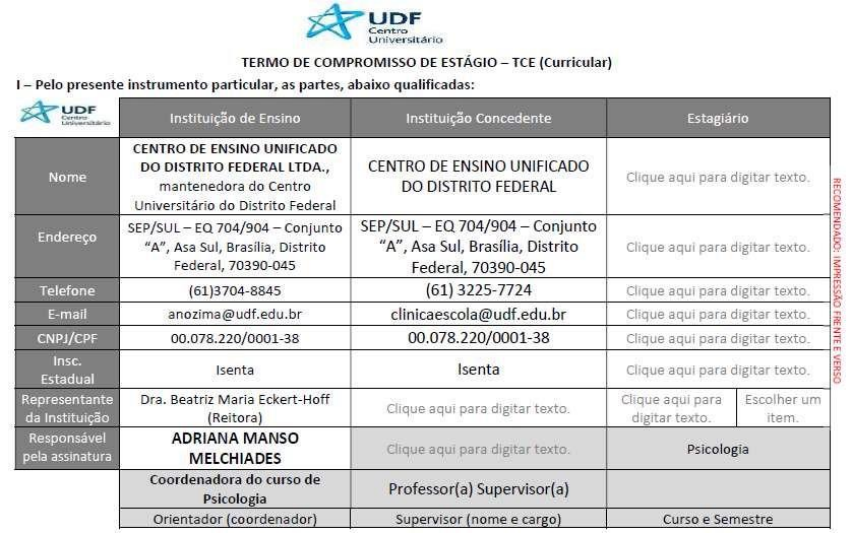 ORIENTAÇÕES PARA PREENCHIMENTO E SUBMISSÃO DO TERMO DE COMPROMISSO DE ESTÁGIO Para realizar o preenchimento e submissão de seu TCE corretamente, por favor, siga o passo-a- passo descrito a seguir: 1. O professor irá preencher os campos na coluna do meio com dados do campo, em caso externo, ou manter como está preenchendo apenas seu nome em caso de campo na Clínica Escola do UDF. O professor também deve se atentar a preencher o campo Local das Atividades na Tabela II. 2. O aluno irá preencher os campos localizados à direita do TCE com seus dados pessoais e inserir a data na última página do arquivo. Esse preenchimento deve ser realizado em computador, digitado. Favor retirar a cor vermelha dos campos após o preenchimento. Utilize somente o documento disponibilizado por seu professor-supervisor no Blackboard ou meio adequado para esse compartilhamento, evitando confusões de versões entre documentos. 3. Para assinaturas: a. Assinaturas digitais: serão aceitas apenas aquelas que possuem possibilidade de verificação eletrônica (Docusign, Clicksign, Assine Bem, Gov., entre outras); b. Assinatura física: o aluno irá imprimir e assinar o documento manualmente na linha a direita da última página. 4. O aluno deve assinar (digital ou fisicamente) na linha a direita da última página e, em seguida, coletar a assinatura e carimbo do professor (que também pode ser digital desde que possua verificação eletrônica), o qual assinará na linha central da última página. 5. Após coletar as assinaturas, o aluno irá escanear o documento e enviá-lo via Área do Aluno para assinatura da coordenação e avaliação da Central de Estágios. O caminho para envio na Área do Aluno é: Área do Aluno > CAA Online > Faça sua Solicitação > Acadêmico > Termo de Estágio > Termo de Estágio – Obrigatório (curricular).