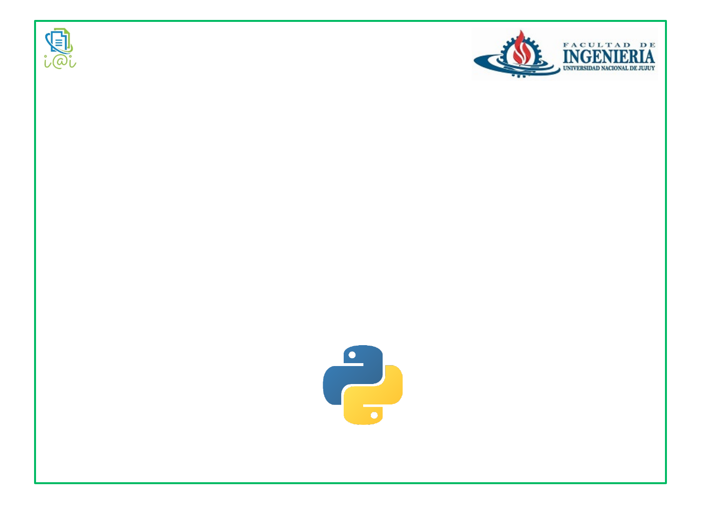 Universidad Nacional de Jujuy Facultad de ingeniería Introducción a la informática Samuel Franco – José Zapana Clase 03 • Lenguaje Python – Características – Ventajas – Frameworks más usados – Entorno de desarrollo – Programas básicos Contenido • A principios de los 90 • Desarrollado por Guido Van Rossum Inicios de Python «Hace seis años, en diciembre de 1989, estaba buscando un proyecto de programación como hobby que me mantuviera ocupado durante las semanas de Navidad. Mi oficina estaría cerrada y no tendría más que mi ordenador de casa a mano. Decidí escribir un intérprete para el nuevo lenguaje de scripting que había estado ideando recientemente: un descendiente de ABC que gustaría a los hackers de Unix/c. Elegí el nombre de Python para el proyecto, encontrándome en un estado de ánimo ligeramente irreverente (y siendo un gran fan de la serie Monty Python's Flying Circus)». • Es un lenguaje de programación versátil multiplataforma y multiparadigma • Código legible y limpio • Cuenta con una licencia de código abierto • Muy usado en la actualidad (por ej. Google, Facebook o Youtube). • Ideal para trabajar con grandes volúmenes de datos Características • Simplificado y rápido: ideal para scripting • Elegante y flexible: fácilmente legible e interpretable. • Programación sana y productiva: fácil para comenzar a programar y fomenta la productividad. • Ordenado y limpio: es muy legible y sus módulos están bien organizados. • Portable: es posible usarlo en prácticamente cualquier sistema de la actualidad. • Comunidad: cuenta con una gran comunidad muy activa. Ventajas • Cuenta con un gran número de frameworks disponibles entre los que se destacan: – Pyramid. Facilita la escritura de aplicaciones Web y fue uno de los primeros compatibles con Python 3. – Bottle. Microframework muy simple que proporciona un mínimo de herramientas al desarrollador (enrutamiento, plantillas y una pequeña abstracción sobre WSGI) y es ideal para crear API web. – Django. Uno de los más populares para el desarrollo de aplicaciones web, implementa el patrón de diseño MVC. Frameworks de Python • Existen muchas alternativas – Utilizando un IDE • PyCharm • Atomo • Visual Studio Code • Otros… – PyDroid 3: para Android https:// play.google.com/store/apps/details? id=ru.iiec.pydroid3&hl=es_AR&gl=US – Compiladores Online • https://www.programiz.com/python-programming/ online-compiler/ Entorno de programación • Pasos para la instalación y configuración 1. Instalar Python a) https://www.python.org/downloads/ b) Si tiene Windows 7 descargar versión 3.7 2. Instalar VSC a) https://code.visualstudio.com/download b) Instalar complementos sugeridos Entorno con VSC • variables y funciones: Camel Case • constantes: Snake Case • Ejemplos – Variables: • fecha, fechaIngreso, item, costoUnitario – Funciones • factorial(), calcularPromedio(), – Constantes • IVA, INTERES_MAXIMO, PLAZO_MINIMO Estilos de programación Un tipo de dato establece qué valores puede tomar una variable y qué operaciones se pueden realizar sobre la misma. Tipos de datos simples Entero Flotante Lógico Cadena int 0, 1, 23, 3493 binario, octal, hexadecimal float 0., 0.0, .0 1.0, 1.e0, 1.0e0 2.99e-23 1.496e11 Números complejos bol False, True str ‘1’, “23”, “1.0”, ’UNJu’, “UBA” Operaciones aritméticas y relacionales Operaciones aritméticas y relacionales Operaciones relacionales Operaciones relacionales y concatenación • Capítulo 2.1.1 Operadores aritméticos vicia Nota adhesiva falta la divicion // que te devuelve la parte entera del cociente • Ejemplos § 2 + 3 ** 2 * 5 § 2 + 3 ** (2 * 5) Expresiones aritméticas Capítulo 2.3 Operadores relacionales Ejemplos (3 == 3) True (‘A’ > ‘a’) False (‘UNJu’ > ‘UNSa’) False (0.33==1/3) False (True > False) True Asignación (Variable =Expresión) str(): Devuelve la representación en cadena de caracteres (string) del objeto que se pasa como parámetro. int(): Devuelve un int a partir de un número o un string. float(): Devuelve un float a partir de un número o un string Conversión de tipos Petición de información al usuario Petición y conversión de tipos Petición y conversión de tipos • Sentencia condicional if ( Sección 4.1.2) • Sintaxis • Condición: expresión lógica • No utiliza bloques para indicar las acciones, basta con los espacios a la izquierda Estructuras de control condicional … if condición: Acción(es) else: Acción(es) … … if condición: Acción(es) … Ejemplo: condicional simple Ejemplo: condicional doble Ejemplo: condicional anidado • Libro: Introducción a la Programación con Python. Unidades – 2.1.1: Operadores aritméticos – 2.2: – 2.3 – 2.4 – 3.3 – 4.1 • https://docs.python.org/es/3/ Bibliografía