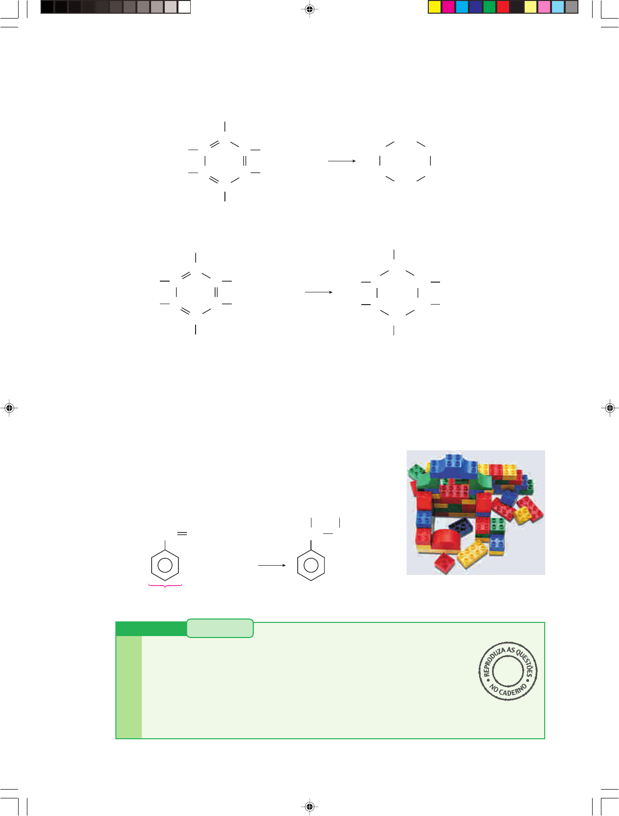 R ep ro du çã o pr oi bi da .A rt .1 84 do C ód ig o P en al e Le i 9 .6 10 de 19 de fe ve re iro de 19 98 . 227Capítulo 9 • REAÇÕES DE ADIÇÃO 2.4. As adições ao núcleo benzênico As ligações duplas existentes no anel benzênico nos dão a primeira impressão de que deve- riam ser fáceis as reações de adição, tal como acontece com os alcenos. Exemplos: Isso, porém, não é verdade, porque: • a primeira reação só ocorre com catalisadores (Ni ou Pt) e em condições drásticas (300 °C e 200 atm de pressão); • a segunda reação só ocorre com auxílio de luz ultravioleta e calor. Tudo isso indica que o anel benzênico é muito estável e resiste às reações de quebra de suas duplas ligações (ver página 159). Em hidrocarbonetos aromáticos ramificados, as ramificações se- guem os padrões normais de reatividade. Assim, por exemplo, no estireno, a ligação dupla da ramificação sofre adições semelhantes às dos alcenos: C C CC H C C H H " H H H 3 H2 H2C Benzeno Ciclo-hexano CH2 CH2 CH2 CH2H2C Ou então: C C CC H C C H H " H H H 3 Cl2 Cl Cl CH Cl CH CH CH Cl CH CH Cl Cl Benzeno Hexacloreto de benzeno ou BHC (inseticida) Muitos brinquedos são feitos à base de poliestireno. " Cl2 Cl CH CH2 CH Cl CH2 Estireno JA V IE R JA IM E /C ID a) Quando e onde ocorrem as reações de adição em uma molécula? b) Quais são as adições mais comuns às ligações duplas? c) O que estabelece a regra de Markownikoff na adição a uma ligação dupla assimétrica? d) Como se verifica a adição anti-Markownikoff nas adições a uma ligação dupla assimétrica? e) As adições ao anel benzênico são fáceis ou difíceis de ocorrer? Como devem ser a temperatura e a pressão nessas relações? REVISÃO Responda emseu caderno Capitulo 09A-QF3-PNLEM 11/6/05, 15:19227 R ep ro du çã o pr oi bi da .A rt .1 84 do C ód ig o P en al e Le i9 .6 10 de 19 de fe ve re iro de 19 98 . 228 1 Copie no caderno as seguintes equações envolvendo rea- ções de alceno e complete-as: a) CH2 CH CH3 " Br2 b) CCH2 CH3 CH3 HCl" c) CCH3 CH CH3 CH3 H2O H2SO4 " 2 (UF-CE) São apresentados, abaixo, quatro compostos pertencentes a várias funções orgânicas: CH3OH CH3NH2 CH2 CH2 Qual a alternativa que corresponde a dois compostos ca- pazes de sofrer reação de adição? a) Metanol e metilamina. b) Metilamina e eteno. c) Ciclo-hexeno e metilamina. d) Ciclo-hexeno e metanol. e) Eteno e ciclo-hexeno. 3 (Fuvest-SP) Hidrocarbonetos que apresentam ligação dupla podem sofrer reação de adição. Quando a reação é feita com um haleto de hidrogênio, o átomo de halogênio se adiciona ao carbono insaturado que tiver menor número de hidrogênios, conforme observou Markownikoff. Usando essa regra, dê a fórmula e o nome do produto que se forma na adição de: a) HI a CH3CH CH2 b) HCl a CH3 4 (PUC-MG) Na reação do metilpropeno com HCl, há for- mação de: a) 1-buteno. b) isobutano. c) 2-cloro-metilpropano. d) 1-cloro-metilpropano. e) 1-cloro-metilpropeno. 5 (UFRN) A adição de brometo de hidrogênio a 3,4-dimetil- penteno-2 produz o seguinte composto: a) 2-bromo-3,4-dimetil-pentano. b) 2-bromo-3,4-metil-penteno-2. c) 2,3-dibromo-3,4-dimetil-pentano. d) 3-bromo-2,3-dimetil-pentano. e) 4-bromo-3,4-dimetil-penteno-2. 6 (UFRGS-RS) Uma reação típica dos alcenos é a adição de halogênios à ligação dupla, formando compostos di- halogenados vicinais, conforme exemplificado abaixo: Em relação a essa equação, podemos afirmar que: a) o composto II apresenta dois carbonos assimétricos. b) o nome do produto formado é 2,3-dibromo-3-metil- butano. c) o nome do composto I é 2-metil-buteno-2. d) o alceno pode apresentar isomeria geométrica. e) o nome do produto formado é 2,3-dibromo-2-metil- propano. 7 (Cesgranrio-RJ) Dois alcenos de fórmula molecular C5H10 sofrem reações de hidratação em meio ácido. Os produ- tos principais gerados, respectivamente, são: 3-metil-2- butanol e 2-metil-2-butanol. O tipo de isomeria existente entre os alcenos reagentes e o tipo de isomeria encontra- do entre os produtos acima citados são, respectivamente: a) cadeia e posição. d) posição e posição. b) cadeia e cadeia. e) função e posição. c) cadeia e função. 8 (UFSM-RS) O eugenol tem a fór- mula estrutural ao lado. Com relação a esse composto, não é correto afirmar que: CHH3C CH3 Br2C " CH3 I H3C C CH3C Br H CH3 Br II a) descora a solução de bromo em CCl4. b) é uma substância insaturada. c) apresenta função fenol. d) apresenta função éter. e) apresenta função álcool. 9 (Unifor-CE) A cloração do benzeno, por adição, produz: a) C6Cl12 c) C6H5CH2Cl e) C6H6Cl6 b) C6CH3Cl5 d) C6H10Cl2 CH CH2CH2 OH OCH3 10 (Mackenzie-SP) Propeno " H2O X 11 (FMIt-MG) O produto resultante da reação do metil- buteno-2 com ácido clorídrico é: a) 2-cloro-3-metil-butano b) 1-cloro-2-metil-butano c) 3-cloro-2-metil-butano d) 2-cloro-2-metil-butano e) 2-cloro-metil-buteno-2 Na equação acima, X corresponde a: a) propano b) 1-propanol c) 2-propanol d) propanal e) propanona H" Catalisador EXERCÍCIOS Registre as respostasem seu caderno EXERCÍCIOS COMPLEMENTARES Registre as respostasem seu caderno Capitulo 09A-QF3-PNLEM 11/6/05, 15:19228 R ep ro du çã o pr oi bi da .A rt .1 84 do C ód ig o P en al e Le i 9 .6 10 de 19 de fe ve re iro de 19 98 . 229Capítulo 9 • REAÇÕES DE ADIÇÃO 3 ADIÇÕES A LIGAÇÕES DUPLAS CONJUGADAS Ligações duplas são chamadas de conjugadas quando estão separadas por apenas uma ligação simples, como acontece no composto CH2 CH CH CH2 (buta-1,3-dieno). Havendo reagente em excesso, esses alcadienos ou dienos darão reações em dobro, quando comparados com os alcenos. Por exemplo: 12 (UFMS) Dois compostos A e B, quando submetidos a uma reação com HBr na presença de luz e peróxido orgânico, dão origem a 2-bromo-3-metil-pentano e 1-bromo-2- metil-propano, respectivamente. Identifique a(s) alternativa(s) que indique(m) quais são os compostos de partida, A e