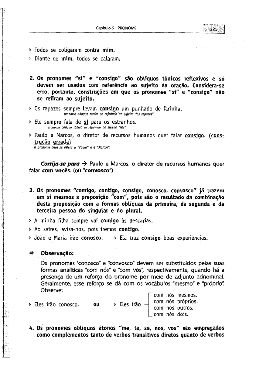 Capítulo 6 -PRONOME > Todos se coligaram contra mim. > Diante de mim, todos se calaram. 2. Os pronomes "s i" e "consigo" são oblíquos tônicos reflexivos e só devem ser usados com referência ao sujeito da oração. Considera-se erro, portanto, construções em que os pronomes "s i" e "consigo" não se refiram ao sujeito. i> Os rapazes sempre levam consigo um punhado de farinha. pronome oblíquo tônito se referindo ao sujeito "os rapazes” > Ele sempre fala de si para os estranhos. pronome oblíquo tônico se referindo ao sujeito “ele" > Paulo e Marcos, o diretor de recursos humanos quer falar consigo, (cons- txuçlo errada) 0 pronome deve se referir a “Pauto" e a "A(orcas" Corríja-se para Pauio e Marcos, o diretor de recursos humanos quer falar com vocês, (ou "convosco") 3. Os pronomes "comigo, contigo, consigo, conosco, convosco" jã trazem em si mesmos a preposição "com", pois são o resultado da combinação desta preposição com a formas obliquas da primeira, da segunda e da terceira pessoa do singular e do plural. > A minha filha sempre vai comigo às pescarias. s> Ao saíres, avisa-nos, pois iremos contigo. João e Maria irão conosco. > Ela traz consigo boas experiências. Observação: Os pronomes "conosco" e "convosco" devem ser substituídos pelas suas formas analíticas "com nós" e "com vós" respectivamente, quando há a presença de um reforço do pronome por meio de adjunto adnomínal. Geralmente, esse reforço se dá com os vocábulos "mesmo" e "próprio". Observe: com nós mesmos. > Eles irão conosco. ou > Eles irão com nos própnos. com nós outros, com nós dois. 4. Os pronomes oblíquos átonos "me, te, se, nos, vos" são empregados como complementos tanto de verbos transitivos diretos quanto de verbos NOVA GRAMÁTICA DA LÍNGUA PORTUGUESA PARA CONCURSOS - MORFOLOGiA transitivos indiretos. Podem, portanto, funcionar como objeto direto (caso acusativo em latim) ou objeto indireto (caso dativo em latim), a depender da regência verbal. i> Sempre nos disse o que fazer nas horas difíceis. objeto indireto > Informaram-nos sobre o problema. objeto direto > Eles se viram, mas não se cumprimentaram. objeto direto objeto direto > Parece que vão me dizer a verdade. objeto indireto > Eu vos louvo pela atitude salvadora que tivestes. objeto direto > Essa notícia te deu ânimo para continuar? objeto indireto 5. Oá os oblíquos "o, a, os, as" são usados como complementos para verbos transitivos diretos e verbos transitivos diretos e indiretos em sua parte direta. Funcionam, pois, como objetos diretos. São, por isso, denomi nados de pronomes acusativos, já que em latim a função acusativa diz respeito ao objeto direto. Tais pronomes eqüivalem aos oblíquos tônicos preposidonados "a ele, a ela, a eles, a elas". > Os jornalistas o fotografaram quando descia a serra. (- fotografaram a ele) > Todos as aplaudiam com entusiasmo. (= aplaudiam a elas) Observação: Os pronomes "o, a, os, as", quando estão enclíticos a verbos terminados em "-r, -s, -z", assumem as formas "Io, Ia, los, Ias" e a forma verbal perde aquelas consoantes. Quando enclíticos a verbos terminados em ditongo násal, assumem as formas "no, na, nos, nas" Veja: > Encontraram o homem deitado. ■= Encontraram-no deitado. i> Pegou dinheiro para comprar dois livros. = Pegou dinheiro para comprá-los. 6. Os pronomes oblíquos "lhe, lhes" substituem termos que exigem prepo sição. Quando completam, verbos, funcionam como objetos indiretos de verbos transitivos indiretos e de verbos transitivos diretos e indiretos em sua parte indireta. Referem-se, portanto, ao caso dativo do latim. Estes pronomes também eqüivalem aos oblíquos tônicos preposidonados "a ele, a ela, a eles, a elas". s Capítulo 6- PRONOME ' . 2 2 7 > Todos lhe fizeram grandes elogios. (= fizeram grandes elogios a.ela / a ele.) > Pediram-lhes que se mantivessem calados. (= pediram a eles / a elas que se...). 7. Os pronomes "me, te, lhe, nos, vos" podem fazer a vez de legítimos pronomes possessivos* Eqüivalem, respectivamente, a "meu / minha, teu / tua, seu / sua, dele / dela, nosso / nossa, vosso / vossa e plurais" Observe: i> Ao ver o sumo pontífice, beijou-lhe uma das mãos. Isto é: ... beijou uma de suas mãos. > A velocidade do vento despenteava-nos os cabelos. Isto é: ... despenteava os nossos cabelos. 6.3.2 PRONOMES DE TRATAMENTO Uma divisão interessante dos pronomes pessoais é a dos pronomes de tratamento. São assim denominados porque se usam tais pronomes em re ferência a certas pessoas consideradas autoridades ou em certos contextos comunicativos quando a formalidade os exige. Principais pronomes de tratamento e seus respectivos empregos: - Prònomede ■. . tratamento Abreviatura _ Emprego ' você, vocês v. tratamento familiar, informal senhor, senhores Sr. Sr.“ tratamento respeitoso senhorita, senhoritas Sr.*3, Sr.tas para mulheres solteiras senhora, senhoras Sr.a, Sr.as tratamento respeitoso Vossa Senhoria, Vossas Senhorias V.S.a, V. S.as para pessoas que exercem cargos importantes Vossa Excelência, Vossas Excelências V, Ex.a, V. Ex.as para autoridades superiores (presidentes, juizes, deputados, senadores, governadores etc.) Vossa Eminência, Vossas Eminências V. Em.a, V. Em.as para cardeais Vossa Alteza, Vossas Altezas V.A., W.AA. para príncipes, princesas e duques