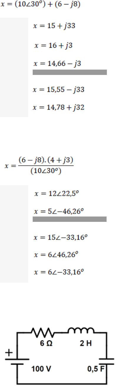Questão 1/10 - Circuitos Elétricos II Dada a operação com números complexos: Calcular o valor de x A B C Você assinalou essa alternativa (C) D E Questão 2/10 - Circuitos Elétricos II Dada a operação com números complexos: Calcular o valor de x A B Você assinalou essa alternativa (B) C D E Questão 3/10 - Circuitos Elétricos II Seja o circuito RLC abaixo: Indique qual o tipo de resposta do circuito. A Superamortecido Você assinalou essa alternativa (A) B Não amortecido C Criticamente amortecido D Pouco amortecido E Subamortecido Questão 4/10 - Circuitos Elétricos II Historicamente, os números complexos começaram a ser estudados graças à grande contribuição do matemático Girolamo Cardano (1501-1576). Existem várias operações complexos que nos ajudarão na análise de circuitos elétricos. A seguir pede-se que faça a trasnformação do modo polar para o retangular dos seguintes termos: Z1=100∠45°Z1=50∠30°Z1=40∠−20°�1=100∠45°�1=50∠30°�1=40∠−20° A Z1=70.71+j70.71,Z2=43.30+j25,Z3=37.60−j13.68�1=70.71+�70.71,�2=43.30+�25,�3=37.60−�13.68 Você assinalou essa alternativa (A) B Z1=7.71+j7.71,Z2=4.30+j5,Z3=3.60−j1.68�1=7.71+�7.71,�2=4.30+�5,�3=3.60−�1.68 C Z1=700.71+j700.71,Z2=430.30+j25,Z3=370.60−j130.68�1=700.71+�700.71,�2=430.30+�25,�3=370.60−�130.68 D Z1=0.71+j0.71,Z2=3.30+j25,Z3=37.60−j13.68�1=0.71+�0.71,�2=3.30+�25,�3=37.60−�13.68 E Z1=0.71+j0.71,Z2=3.30+j5,Z3=7.60−j3.68�1=0.71+�0.71,�2=3.30+�5,�3=7.60−�3.68 Questão 5/10 - Circuitos Elétricos II Capacitor é um componente que armazena cargas elétricas num campo elétrico, acumulando um desiquilibrio interno de carga elétrica. Calcule a capacitância equivalente vista pelos terminais a e b do circuito a seguir: A 20μF20�� Você assinalou essa alternativa (A) B 111μF111�� C 40μF40�� D 2μF2�� E 2F2� Questão 6/10 - Circuitos Elétricos II Dada a operação com números complexos: Calcular o valor de x A B C D Você assinalou essa alternativa (D) E Questão 7/10 - Circuitos Elétricos II Considere o circuito RC sem fonte a seguir: Calcule a tensão no capacitor após 8 segundos, sabendo que o capacitor carregado com 10 V foi conectado ao circuito em 0 segundos. A v(8)=0,267V�(8)=0,267� Você assinalou essa alternativa (A) B v(8)=1,4V�(8)=1,4� C v(8)=11,04V�(8)=11,04� D v(8)=3,62V�(8)=3,62� E v(8)=2,67V�(8)=2,67� Questão 8/10 - Circuitos Elétricos II Dada a operação com números complexos: Calcular o valor de x Você não pontuou essa questão A Você assinalou essa alternativa (A) B C D E Questão 9/10 - Circuitos Elétricos II Dada a operação com números complexos: Calcular o valor de x A B C D E Você assinalou essa alternativa (E) Questão 10/10 - Circuitos Elétricos II Para o circuito abaixo, sabendo que a tensão inicial do capacitor é nula, ou seja, vC(0)= 0 V, calcule: • Tempo de carga do capacitor • Resistor que deveria ser usado para que a carga do capacitor se dê em 20 s. • A 1 s; 1 kΩΩ B 2 s; 5 kΩΩ C 2 s; 15 kΩΩ D 2,5 s; 20 kΩΩ E 10 s; 20 kΩΩ Você assinalou essa alternativa (E)