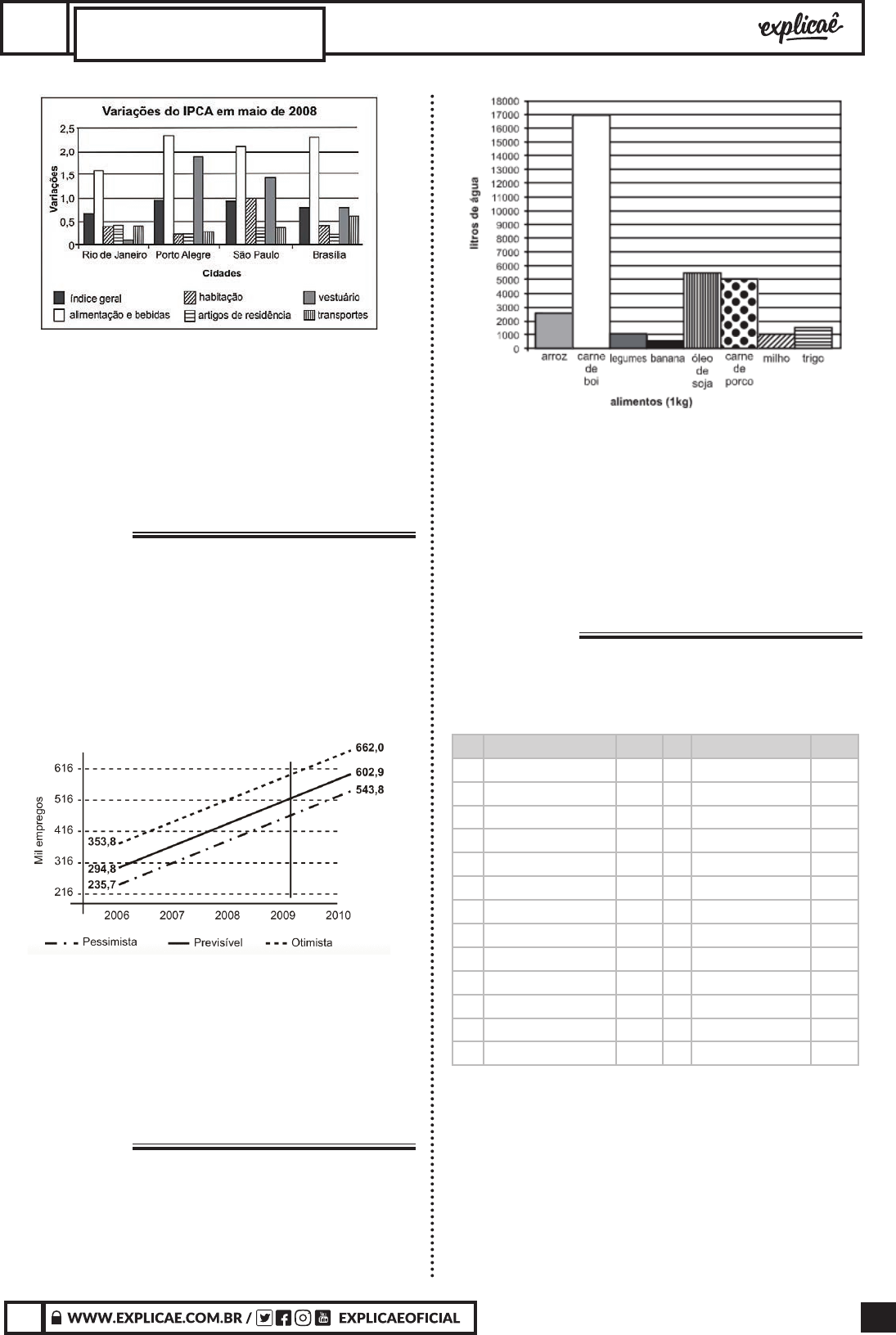 491X X MATEMÁTICA E SUAS TECNOLOGIASMATEMÁTICA http://www.ibge.gov.br. Acesso em: 05 jul. 2008 (adaptado). Com base no gráfi co, qual item foi determinante para a infl ação de maio de 2008? A. Alimentação e bebidas. B. Vestuário. C. Transportes D. Artigos de residência. E. Habitação. QUESTÃO 25 (ENEM 2009 CANCELADO) A importância do desenvolvimento da atividade turística no Brasil relaciona-se especialmente com os possíveis efeitos na redução da pobreza e das desigualdades por meio da geração de novos postos de trabalho e da contribuição para o desenvolvimento sustentável regional. No gráfi co são mostrados três cenários — pessimista, previsível, otimista — a respeito da geração de empregos pelo desenvolvimento de atividades turísticas. De acordo com o gráfi co, em 2009, o número de empregos gerados pelo turismo será superior a A. 235.700 e inferior a 353.800 no cenário pessimista. B. 602.900 no cenário previsível. C. 660.000 no cenário otimista. D. 316.000 e inferior a 416.000 no cenário previsível. E. 516.000 e inferior a 616.000 no cenário otimista. QUESTÃO 26 (ENEM 2009 CANCELADO) Nos últimos anos, o aumento da população, aliado ao crescente consumo de água, tem gerado inúmeras preocupações, incluindo o uso desta na produção de alimentos. O gráfi co mostra a quantidade de litros de água necessária para a produção de 1 kg de alguns alimentos. Com base no gráfi co, para a produção de 100 kg de milho, 100 kg de trigo, 100 kg de arroz, 100 kg de carne de porco e 600 kg de carne de boi, a quantidade média necessária de água, por quilograma de alimento produzido, é aproximadamente igual a A. 2.240.000 litros por quilograma. B. 415 litros por quilograma. C. 27.000 litros por quilograma. D. 2.700.000 litros por quilograma. E. 11.200 litros por quilograma. QUESTÃO 27 (ENEM 2009 CANCELADO) No quadro seguinte, são informados os turnos em que foram eleitos os prefeitos das capitais de todos os estados brasileiros em 2004. cidade turno cidade turno 1 Aracaju (SE) 1º 14 Manaus (AM) 2º 2 Belém (PA) 2º 15 Natal (RN) 2º 3 Belo Horizonte (MG) 1º 16 Palmas (TO) 1º 4 Boa Vista (RR) 1º 17 Porto Alegre (RS) 2º 5 Campo Grande (MS) 1º 18 Porto Velho (RO) 2º 6 Cuiabá (MT) 2º 19 Recife (PE) 1º 7 Curitiba (PR) 2º 20 Rio Branco (AC) 1º 8 Florianópolis (SC) 2º 21 Rio de Janeiro (RJ) 1º 9 Fortaleza (CE) 2º 22 Salvador (BA) 2º 10 Goiânia (GO) 2º 23 São Luís (MA) 1º 11 João Pessoa (PB) 1º 24 São Paulo (SP) 2º 12 Macapá (AP) 1º 25 Terezina (PI) 2º 13 Maceió (AL) 2º 26 Vitória (ES) 2º TSE. Almanaque ABRIL: Brasil 2005. São Paulo: Abril, 2005. Na região Norte, a frequência relativa de eleição dos prefeitos no 2ªturno foi, aproximadamente, A. 57,69%. B. 50,00%. C. 44,44%. D. 42,86%. E. 57,14%. Importante: Esse arquivo digital pertence ao CPF: 706.034.921-93. Proibida a reprodução e o compartilhamento 492 X X MATEMÁTICA E SUAS TECNOLOGIASMATEMÁTICA QUESTÃO 28 (ENEM 2009 1ª APLICAÇÃO) Suponha que a etapa final de uma gincana escolar consista em um desafio de conhecimentos. Cada equipe escolheria 10 alunos para realizar uma prova objetiva, e a pontuação da equipe seria dada pela mediana das notas obtidas pelos alunos. As provas valiam, no máximo, 10 pontos cada. Ao final, a vencedora foi a equipe Ômega, com 7,8 pontos, seguida pela equipe Delta, com 7,6 pontos. Um dos alunos da equipe Gama, a qual ficou na terceira e última colocação, não pôde comparecer, tendo recebido nota zero na prova. As notas obtidas pelos 10 alunos da equipe Gama foram 10; 6,5; 8; 10; 7; 6,5; 7; 8; 6; 0. Se o aluno da equipe Gama que faltou tivesse comparecido, essa equipe A. teria a pontuação igual a 6,5 se ele obtivesse nota 0. B. seria a segunda colocada se ele obtivesse nota 8. C. seria a vencedora se ele obtivesse nota 10. D. empataria com a equipe Ômega na primeira colocação se o aluno obtivesse nota 9. E. permaneceria na terceira posição, independentemente da nota obtida pelo aluno. QUESTÃO 29 (ENEM 2009 1ª APLICAÇÃO) Na tabela, são apresentados dados da cotação mensal do ovo extra branco vendido no atacado, em Brasília, em reais, por caixa de 30 dúzias de ovos, em alguns meses dos anos 2007 e 2008. Mês Cotação Ano Outubro R$ 83,00 2007 Novembro R$ 73,10 2007 Dezembro R$ 81,60 2007 Janeiro R$ 82,00 2008 Fevereiro R$ 85,30 2008 Março R$ 84,00 2008 Abril R$ 84,60 2008 De acordo com esses dados, o valor da mediana das cotações mensais do ovo extra branco nesse período era igual a A. R$ 82,00. B. R$ 81,50. C. R$ 73,10. D. R$ 85,30. E. R$ 83,00. QUESTÃO 30 (ENEM 2009 1ª APLICAÇÃO) A tabela mostra alguns dados da emissão de dióxido de carbono de uma fábrica, em função do número de toneladas produzidas. Produção (em toneladas) Emissão de dióxido de carbono (em partes por milhão – ppm) 1,1 2,14 1,2 2,30 1,3 2,46 1,4 2,64 1,5 2,83 1,6 3,03 1,7 3,25 1,8 3,48 1,9 3,73 2,0 4,00 Cadernos de Gestar II, Matemática TP3. www.mec.gov.br. Os dados na tabela indicam que a taxa média de variação entre a emissão de dióxido de carbono (em ppm) e a produção (em toneladas) é A. superior a 0,18 e inferior a 0,50. B. inferior a 0,18. C. superior a 0,50 e inferior a 1,50. D. superior a 2,80. E. superior a 1,50 e inferior a 2,80. QUESTÃO 31 (ENEM 2009 1ª APLICAÇÃO) A suspeita de que haveria uma relação causal entre tabagismo e câncer de pulmão foi levantada pela primeira vez a partir de observações clínicas. Para testar essa possível associação, foram conduzidos inúmeros estudos epidemiológicos. Dentre esses, houve o estudo do número de casos de câncer em relação ao número de cigarros consumidos por dia, cujos resultados são mostrados no gráfico a seguir. De acordo com as informações do gráfico, A. o consumo diário de cigarros e o número de casos de câncer de pulmão são grandezas diretamente proporcionais. B. uma pessoa não fumante certamente nunca será diagnostic