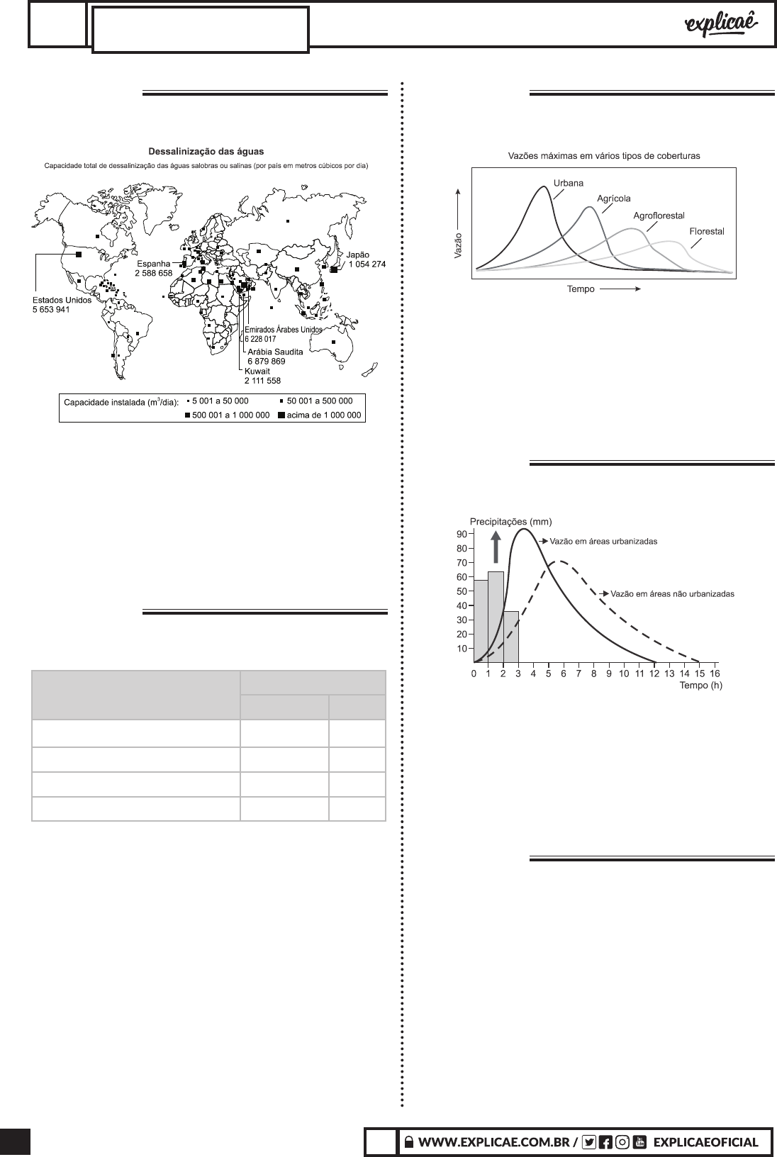 494 X X CIÊNCIAS HUMANAS E SUAS TECNOLOGIASGEOGRAFIA QUESTÃO 03 (ENEM 2016 1ª APLICAÇÃO) Conforme a análise do documento cartográfico, a área de concentração das usinas de dessalinização é explicada pelo(a) A. pioneirismo tecnológico. B. condição hidropedológica. C. escassez de água potável. D. efeito das mudanças climáticas. E. busca da sustentabilidade ambiental. QUESTÃO 04 (ENEM 2017 1ª APLICAÇÃO) Tipologia da área % de chuva retida no local escoada Bacias naturais florestas 80 a 100 0 a 20 Bacias com ocupação agrícola cultivos 40 a 60 40 a 60 Bacias com ocupação residencial 40 a 50 50 a 60 Bacias com ocupação urbana pesada 0 a 10 90 a 100 MACHADO, P. J. O.; TORRES, F. T. P. Introdução à hidrogeografia. São Paulo: Cengage Learning, 2012 (adaptado). A leitura dos dados revela que as áreas com maior cobertura vegetal têm o potencial de intensificar o processo de A. erosão laminar. B. intemperismo físico. C. enchente nas cidades. D. compactação do solo. E. recarga dos aquíferos. QUESTÃO 05 (ENEM 2017 LIBRAS) As diferenças de vazão e escoamento de água destacadas no gráfico ocorrem por influência da A. forma do relevo. B. tipologia do clima. C. intensidade da chuva. D. altitude do terreno. E. permeabilidade do solo. QUESTÃO 06 (ENEM 2018 1ª APLICAÇÃO) A dinâmica hidrológica expressa no gráfico demonstra que o processo de urbanização promove a A. redução do volume dos rios. B. expansão do lençol freático. C. diminuição do índice de chuvas. D. retração do nível dos reservatórios. E. ampliação do escoamento superficial. QUESTÃO 07 (ENEM 2019 2º APLICAÇÃO) No litoral sudeste, especialmente na região de Cabo Frio (RJ), ocorre, por vezes, um fenômeno interessante, que abaixa a temperatura da água do mar a até 14 C, nos meses de janeiro e fevereiro. Isso acontece devido ao vento, que, no verão, sopra constantemente da direção nordeste. Assim, esse vento constante empurra as águas da superfície, que haviam sofrido insolação e, portanto, estavam aquecidas (em torno de 26 C), para o oceano aberto. Origina-se, então, uma lacuna de água junto à costa, que é preenchida por águas profundas, bem mais frias, que sobem e atingem a superfície. A ascensão das águas frias é chamada de ressurgência. VIEIRA, A. C. M.; ALVES, D. S. C.; MATSCHINSKE, E. G. In uênciadas correntes oceânicas no clima do Brasil. http://portal.mec.gov.br. Acesso em: 10 out. 2015. 495X X CIÊNCIAS HUMANAS E SUAS TECNOLOGIASGEOGRAFIA Uma importância econômica do fenômeno apresentado reside no fato de que ele favorece o surgimento de A. recifes de corais, atraindo o turismo. B. áreas de cardumes, beneficiando a pesca. C. zonas de calmaria, facilitando a navegação. D. locais de águas límpidas, favorecendo o mergulho. E. campos de sedimentos orgânicos, formando o petróleo. X A U L A S 14 APOSTILAS: TEORIA + 131 QUESTÕES CAIU NO ENEM: 71 | EXERCÍCIOS ONLINE: 30 3 FÍSICA 3.7 IMPACTOS AMBIENTAIS QUESTÃO 01 (ENEM SIMULADO MEC 2009) O efeito estufa não é fenômeno recente e, muito menos, naturalmente maléfico. Alguns dos gases que o provocam funcionam como uma capa protetora que impede a dispersão total do calor e garante o equilíbrio da temperatura na Terra. Cientistas americanos da Universidade da Virgínia alegam ter descoberto um dos primeiros registros da ação humana sobre o efeito estufa. Há oito mil anos, houve uma súbita elevação da quantidade de CO 2 na atmosfera terrestre. Nesse mesmo período, agricultores da Europa e da China já dominavam o fogo e haviam domesticado cães e ovelhas. A atividade humana da época com maior impacto sobre a organização social e sobre o ambiente foi o começo do plantio de trigo, cevada, ervilha e outros vegetais. Esse plantio passou a exigir áreas de terreno livre de sua vegetação original, providenciadas pelos inúmeros grupos humanos nessas regiões com métodos elementares de preparo do solo, ainda hoje, usados e condenados, em razão dos problemas ambientais decorrentes. Aquecimento global e a nova geografia de produção no Brasil. http://www.embrapa.br/publicacoes/tecnico/aquecimentoglobal.pdf. Segundo a hipótese levantada pela pesquisa sobre as primeiras atividades humanas organizadas, o impacto ambiental mencionado foi decorrente A. da manipulação de alimentos cujo cozimento e consumo liberavam grandes quantidades de calor e gás carbônico. B. da queima ou da deterioração das árvores derrubadas para o plantio, que contribuíram para a liberação de gás carbônico e poluentes em proporções significativas. C. do início da domesticação de animais no período mencionado, a qual contribuiu para uma forte elevação das emissões de gás metano. D. da derrubada de árvores para a fabricação de casas e móveis, que representou o principal fator de liberação de gás carbônico na atmosfera naquele período. E. do incremento na fabricação de cerâmicas que, naquele período, contribuiu para a liberação de material particulado na atmosfera. QUESTÃO 02 (ENEM SIMULADO 2009) Em fevereiro de 1999, o Seminário Internacional sobre Direito Ambiental, ocorrido em Bilbao, na Espanha, propôs, na Declaração de Viscaia, a extensão dos direitos humanos ao meio ambiente, como instrumento de alcance universal. No parágrafo 3. do artigo 1. da referida declaração, fica estabelecido: “O direito ao meio ambiente deverá ser exercido de forma compatível com os demais direitos humanos, entre os quais o direito ao desenvolvimento”. No Brasil, o cumprimento desse direito configura um grande desafio. Na Região Amazônica, por exemplo, tem havido uma coincidência entre as linhas de desmatamento e as novas fronteiras de desenvolvimento do agronegócio, marcadas por focos de injustiça ambiental, com frequentes casos de escravização de trabalhadores, além de conflitos e crimes pela posse de terras, muitas vezes, impunes. http://www.unicen.com.br/universoverde. Ac
