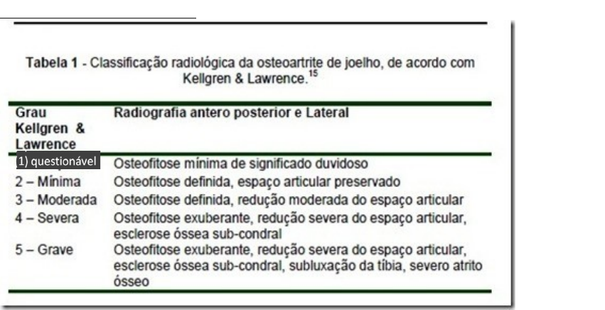 Escala de Kellgren-Lawrence A escala de Kellgren-Lawrence classifica a osteoartrite em cinco estágios, variando de 0 a 4, com base em radiografias do paciente. Cada estágio representa um nível diferente de gravidade da doença, desde a ausência de sinais radiográficos (estágio 0) até a presença de alterações ósseas graves (estágio 4). Os critérios utilizados para classificar a osteoartrite incluem a presença de osteófitos (crescimentos ósseos anormais), a diminuição do espaço articular, a presença de esclerose óssea (aumento da densidade óssea) e a formação de cistos subcondrais (cavidades cheias de líquido abaixo da cartilagem articular). No estágio 1- podem ser observados pequenos osteófitos e uma possível diminuição do espaço articular. Os sintomas nesse estágio geralmente são leves, com dor e rigidez que podem ocorrer após atividades físicas intensas. No estágio 2, os osteófitos são mais evidentes e o espaço articular continua a diminuir. A dor e a rigidez articular podem se tornar mais frequentes e afetar a qualidade de vida do paciente. No estágio 3, a osteoartrite é considerada moderada. Os osteófitos são maiores e o espaço articular está ainda mais reduzido. Nesse estágio, a dor e a rigidez articular são mais intensas e podem ocorrer mesmo em repouso. No estágio 4, a osteoartrite é considerada grave. Os osteófitos são grandes e o espaço articular está quase completamente desaparecido. Nesse estágio, a dor e a rigidez articular são constantes e podem limitar significativamente a capacidade do paciente de realizar atividades diárias. O Teste de Tinetti avalia o equilíbrio e marcha e sua velocidade, a distancia do passo, a simetria e o equilíbrio em pé, tanto o estático e dinâmico, sendo composta por 16 tarefas, onde a primeira possui 09 itens: equilíbrio sentado, levantando, tentativas de levantar, assim que levanta, equilíbrio em pé. E 7 para marcha. A contagem para cada exercício varia de 0 a 1 ou de 0 a 2; a pontuação máxima é de 12 pontos para a marcha; de 16 para o equilíbrio; total de 28 pontos. Na pontuação total do teste, se a contagem mais baixa for menor que 19 pontos, isso indica uma habilidade física mais pobre, quando há alto risco de quedas.