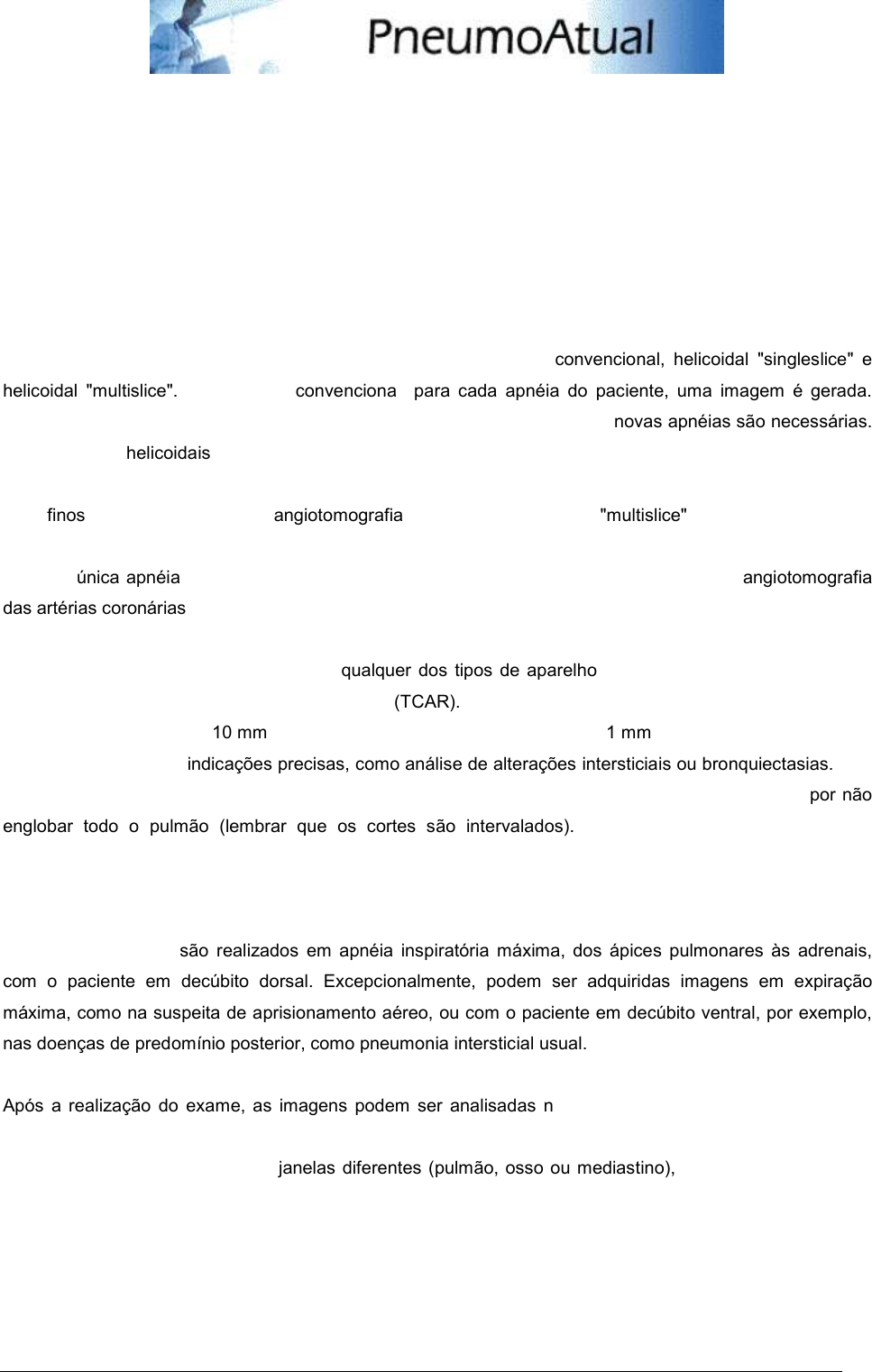 Curso PneumoAtual de Tomografia computadorizada do tórax – aula 01 1 Tomografia computadorizada do tórax: aspectos norma is Gustavo de Souza Portes Meirelles 1 1 – Doutor em Radiologia pela Escola Paulista de Me dicina – UNIFESP 1 – Introdução Há três tipos de aparelhos de tomografia computadorizada (TC): convencional, helicoidal "singleslice" e helicoidal "multislice". No aparelho convencional, para cada apnéia do paciente, uma imagem é gerada. Para a realização das próximas imagens a mesa de exames é deslocada e novas apnéias são necessárias. Nos aparelhos helicoidais, para cada apnéia do paciente, várias imagens são geradas, fazendo com que o exame seja mais rápido e as imagens tenham melhor qualidade. Com isto, é possível a realização de cortes mais finos e de técnicas como a angiotomografia. Nos aparelhos do tipo "multislice", com várias fileiras de detectores (até 64 atualmente), o exame é ainda mais rápido, sendo possível a realização de todo o tórax em uma única apnéia. Com este aparelho, novas técnicas podem ser realizadas, como a angiotomografia das artérias coronárias. Uma técnica que pode ser realizada em qualquer dos tipos de aparelho, convencional ou helicoidais, é a tomografia computadorizada de alta resolução (TCAR). As imagens são adquiridas de modo intervalado (geralmente intervalos de 10 mm entre cada imagem), com cortes finos de 1 mm e técnica de alta resolução espacial. A TCAR tem indicações precisas, como análise de alterações intersticiais ou bronquiectasias. Não deve ser utilizada rotineiramente nos demais casos (ex: nódulo solitário, pesquisa de metástases) por não englobar todo o pulmão (lembrar que os cortes são intervalados). Portanto, para a maior parte das indicações, o método é realizado com a técnica de rotina, com cortes contíguos. Para indicações precisas, como doenças intersticiais, bronquiectasias, realiza-se a TCAR. Os exames de tórax são realizados em apnéia inspiratória máxima, dos ápices pulmonares às adrenais, com o paciente em decúbito dorsal. Excepcionalmente, podem ser adquiridas imagens em expiração máxima, como na suspeita de aprisionamento aéreo, ou com o paciente em decúbito ventral, por exemplo, nas doenças de predomínio posterior, como pneumonia intersticial usual. Após a realização do exame, as imagens podem ser analisadas nos filmes ou em estações de trabalho. Este é o método ideal atual, devido ao grande número de imagens gerado pelos aparelhos mais modernos. Pode-se avaliar as imagens com janelas diferentes (pulmão, osso ou mediastino), dependendo do que se quer estudar sem a necessidade de se repetir o exame. Eric Selecionar Eric Selecionar Eric Selecionar Eric Selecionar Eric Selecionar Eric Selecionar Eric Selecionar Eric Selecionar Eric Selecionar Eric Selecionar Eric Selecionar Eric Selecionar Eric Selecionar Eric Selecionar Eric Selecionar Eric Selecionar Eric Selecionar Eric Selecionar Eric Selecionar Eric Selecionar Curso PneumoAtual de Tomografia computadorizada do tórax – aula 01 2 2 – Anatomia normal da TC de tórax As imagens a seguir ilustram os principais pontos de referência para análise da TC de tórax. São imagens contíguas, adquiridas da transição cervicotorácica ao abdome. Figura 1. Imagem com janela de mediastino da transição cervicotorácica. Figura 2. Imagem com janela de mediastino dos ramos arteriais supra-aórticos, conhecidos como "Três Marias": tronco braquiocefálico, artéria carótida comum esquerda e artéria subclávia esquerda. Eric Selecionar Eric Selecionar Curso PneumoAtual de Tomografia computadorizada do tórax – aula 01 3 Figura 3. Imagem com janela de mediastino no nível do arco da aorta. Figura 4. Imagem com janela de mediastino demonstrando a aorta ascendente e aorta descendente. O espaço entre as duas corresponde à janela aortopulmonar. Curso PneumoAtual de Tomografia computadorizada do tórax – aula 01 4 Figura 5. Imagem no nível da artéria pulmonar esquerda, com janela de mediastino. Figura 6. Artéria pulmonar direita emergindo do tronco arterial pulmonar. Curso PneumoAtual de Tomografia computadorizada do tórax – aula 01 5 Figura 7. Imagem das 4 câmaras cardíacas. Figura 8. Imagem da transição toracoabdominal demonstrando o fígado e o baço. Eric Selecionar Eric Selecionar Curso PneumoAtual de Tomografia computadorizada do tórax – aula 01 6 As próximas imagens são do mesmo exame, após alteração para janela de pulmão, demonstrando a localização dos lobos pulmonares na tomografia computadorizada. Figura 9. Imagem com janela de pulmão, no nível dos lobos superiores. Figura 10. Imagem demonstrando o lobo médio, língula e os segmentos superiores dos lobos inferiores. Eric Selecionar Eric Selecionar Eric Selecionar Eric Selecionar Curso PneumoAtual de Tomografia computadorizada do tórax – aula 01 7 Figura 11. Imagem com janela de pulmão no nível dos segmentos basais dos lobos inferiores. A próxima imagem foi realizada com a técnica de alta resolução. Reparar na qualidade da mesma, com demonstração das fissuras oblíquas. Lembrar que, pela espessura do corte, esta técnica é feita com imagens intervaladas, não se prestando para a análise de todo o pulmão, a não ser nos aparelhos mais modernos. Portanto, de modo geral, a TCAR deve ser restrita a indicações clínicas precisas, como doenças intersticiais ou bronquiectasias. Figura 12. Imagem de TCAR demonstrando as fissuras oblíquas. Eric Selecionar Eric Selecionar Eric Selecionar Eric Selecionar Eric Selecionar Eric Selecionar Curso PneumoAtual de Tomografia computadorizada do tórax – aula 01 8 Em casos em que as lesões pulmonares são predominantemente posteriores, a TCAR pode ser realizada em decúbito ventral, para evitar confusão com atelectasias passivas decorrentes do decúbito. Figura 13. TCAR em decúbito ventral. Paciente exposto ao asbesto com alterações compatíveis c