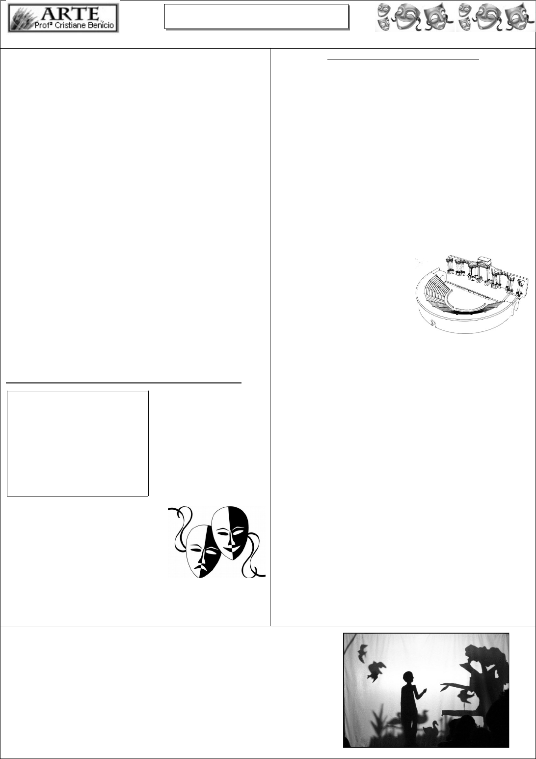 ( TEATRO ) Teatro, do grego Béarpov (théatron), significa lugar para ver. Teatro é um termo de origem grega que designa simultaneamente o conjunto de peças dramáticas para apresentação em público e o lugar onde são apresentadas essas peças é também uma forma de arte na qual um ou vários atores apresentam uma determinada história que desperta na plateia sentimentos variados. Dá-se o nome de dramaturgia à arte de escrever peças de teatro, sendo o dramaturgo a pessoa responsável pela composição dos textos. Existem muitos gêneros de teatro, dentre os quais se destacam: auto, comédia, drama, fantoche, ópera, musical, revista, tragédia, tragicomédia. A Origem do teatro remonta ao homem primitivo e a todas as suas formas de rituais (associados à caça, colheita, morte, etc.), danças, imitações de animais, culto aos deuses e práticas lúdicas. Acredita-se que a ideia de teatro tal como conhecemos hoje surgiu na Grécia Antiga, no século IV a.C. ". Notheatron eram realizadas cerimônias religiosas em honra a Dionísio, o deus grego do vinho. Na celebração da colheita de uvas (vindima) havia música, dança e apresentações do ditirambo. O ditirambo era um hino cantado e representado por um coro fantasiado. O teatro passou a ser não só o local físico para onde o público se deslocava para ver as cerimônias como as próprias representações, que aos poucos foram adquirindo a forma teatral com a introdução de histórias sobre os grandes heróis gregos. As características básicas de uma apresentação teatral são: Se faltar um dos três elementos não é teatro. Mas não se pode esquecer que eles têm que estar presentes num mesmo espaço, ao mesmo tempo. A isso chamamos de tríade essencial ou tríade teatral. ( • ATOR Aquele que "vive" ou “conta” uma história com sua voz e seu corpo. • O TEXTO Aquilo que é "contado" ou "vivido" pelo ator. • O PÚBLICO Aquele que assiste ao que é contado. )O texto para teatro ou texto dramático surge da criatividade de um artista-escritor chamado dramaturgo ou teatrólogo, que conta uma história de forma muito especial. O texto é à base do teatro. Elementos de uma montagem teatral: Iluminação - Luzes especiais para um tipo de cena. Cenário - Elementos e objetos que compõem um ambiente cênico. Sonoplastia - Som que transmite emoção a determinada cena. Tipos de palco e espaços de representação teatral • Teatro de Arena - O teatro possui forma circular ou semicircular (anfi teatro), onde os espectadores assistem à peça sentada em uma arquibancada e os atores atuam em um palco rebaixado e central. • Teatro Mambembe - O teatro è itinerante. Muito comum na Idade Média. Os atores, também eram conhecidos como saltimbancos, às trupes transportavam todas suas parafernálias em carroças viajando de cidade em cidade. • Palco Italiano - O teatro de conhecemos hoje em dia. Surgiu no Renascimento com a Commedia dell'arte italiana. Consiste em uma casa de espetáculo onde em uma das paredes se localiza o palco separado da plateia através de cortinas. • Teatro de Rua - A apresentação teatral é realizada em ruas, praças e calçadas de cidades. Existem apresentações em grupos trupes e também performances individuais. • Teatro Elisabetano - O palco é central e possui forma octogonal e os espectadores ficam em torno dele. Marca do período clássico inglês de Willian Shakespere. Havia limitações no emprego dos cenários, pois atrapalhava a visão do público. • Teatro de Bonecos - Teatro onde as grandes estrelas são bonecos manipulados: Marionetes, Fantoches, Bonecos de vara, etc. No nordeste brasileiro os bonecos são chamados de mamulengos. • Teatro de Sombras - Forma de teatro realizado através da projeção de sombras em uma sala escura. Pode ser feita com a sombra das mãos, de bonecos, objetos ou recortes de papel. No Brasil, o teatro surgiu no século XVI através das composições teatrais escritas pelos padres Jesuítas nas ações de divulgação da fé religiosa entre os índios. Foi só a partir do século XIX com a chegada da corte portuguesa no Brasil que a arte de representar começou a se desenvolver de forma mais intensa. RESPONDA: 1-O que é teatro? 2- O que é dramaturgia? 3- Quais são os gêneros teatrais? 4- Qual é a origem do teatro? 5- Como surgiu a ideia de teatro tal como conhecemos hoje? 6- Quem é o deus do teatro? 7-O que é o ditirambo? 8- Como surgiu o teatro no Brasil? 9- Quando o teatro se desenvolveu de forma mais intensa no Brasil?