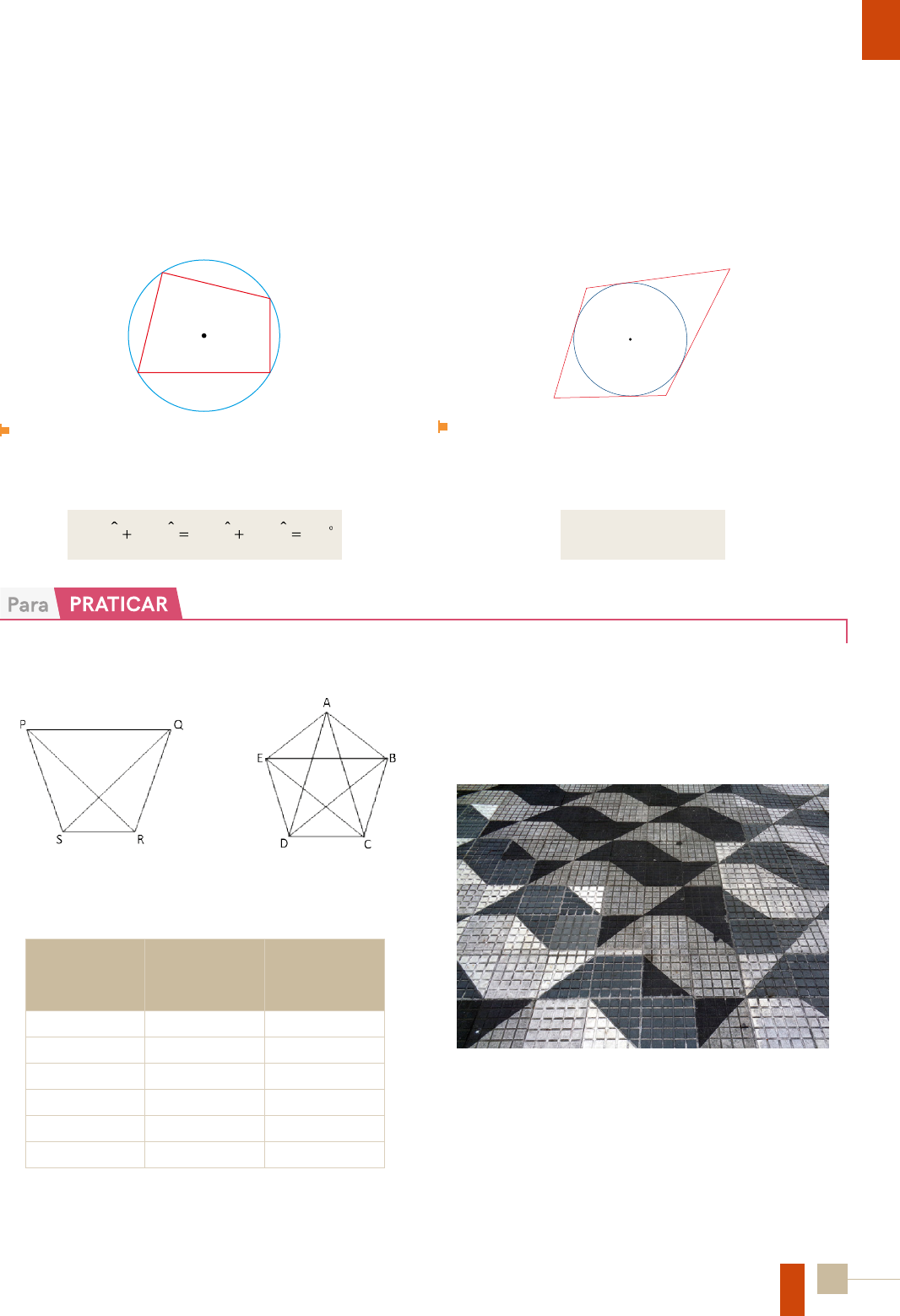 Esses números estabelecem a principal nomenclatura dos polígonos, a qual pode ser vista na tabela a seguir. Nomenclatura dos polígonos Número de vértices Nome do polígono n = 3 Triângulo n = 4 Quadrilátero n = 5 Pentágono n = 6 Hexágono n = 7 Heptágono n = 8 Octógono n = 9 Eneágono n = 10 Decágono n = 11 Undecágono n = 12 Dodecágono n = 13 Tridecágono n = 14 Tetradecágono n = 15 Pentadecágono n = 20 Icoságono Qualquer segmento de reta que une dois vértices de um polígono e que não é um de seus lados é chamado de diagonal do polígono. Observe, nas figuras anteriores, que o triângulo ABC não possui diagonal, que o quadrilátero ABCD tem duas diagonais AC eBD� � e que o pentágono ABCDE apre- senta cinco diagonais AC AD BD BE e CE, , ,� �. De maneira geral, podemos destacar a seguinte relação entre o número de vérti- ces e o número de diagonais que parte de cada vértice: Como cada diagonal possui duas extremidades em vérti- ces distintos do polígono, o princípio multiplicativo da conta- gem permite afirmarmos que o produto n ⋅ (n – 3) equivale ao dobro do número de diagonais de um polígono com n vér- tices. Assim, sendo d o número de diagonais de um polígono de n vértices, temos: d n n 3 2 Cada um dos n vértices de um polígono é extremidade de exatamente (n – 3) diagonais. Exercício resolvido 1 Quantos são os lados de um polígono que possui exata- mente 35 diagonais? Resolução: Como d = 35, sendo n o número de lados desse polígono, temos: n n n n n n ⋅ −( ) = ⋅ −( ) = − − = 3 2 35 3 70 3 70 02 Calculando o discriminante da equação, obtemos: ∆ ∆ ∆ = −( ) − ⋅ ⋅ −( ) = + = 3 4 1 70 9 280 289 2 Logo: n n n = − −( ) ± ⋅ = ± = − = 3 289 2 1 3 17 2 7 10 ↗ ↘ Como n é positivo, concluímos que o polígono tem 10 lados. Se um polígono tiver pelo menos uma diagonal situada em sua região exterior, ele será denominado côncavo, e as regiões onde as diagonais exteriores ficam situadas são cha- madas concavidades do polígono. O pentágono ABCDE apresentado no exemplo anterior é côncavo, pois sua diagonal AD passa pela região exterior a ele. Se um polígono não possuir concavidade, receberá o nome de convexo. Assim, todos os triângulos são convexos, pois não têm diagonais. Além disso, o quadrilátero ABCD apresentado no exem- plo anterior é convexo, visto que suas diagonais AC e BD estão contidas na região interior desse polígono. De modo geral, se um polígono é convexo, então: • todas as diagonais estão situadas em sua região interior; • todos os ângulos internos têm medida inferior a 180° (0° < i < 180°); • os ângulos internos e externos que possuem o mesmo vértice são suplementares. Chamamos de polígono regular um polígono convexo que possui todos os lados congruentes e todos os ângulos internos também congruentes. MATEMÁTICA – FRENTE 3378 ATIVIDADES 7 E 8 Relações métricas em polígonos 2020_OCTA+_V1_MAT_F3.INDD / 22-10-2019 (09:54) / ANDERSON.OLIVEIRA / PDF GRAFICA 2020_OCTA+_V1_MAT_F3.INDD / 22-10-2019 (09:54) / ANDERSON.OLIVEIRA / PDF GRAFICA � Quadriláteros inscritíveis Um quadrilátero é chamado inscritível ou cíclico quando seus quatro vértices estão sobre uma mesma circunferência. Apresentamos a seguir uma condição necessária e suficiente para que um quadrilátero seja inscritível: “Um quadrilátero convexo é inscritível se, e somente se, seus ângulos internos opostos são suplementares.” A B O CD Quadrilátero inscritível ABCD. Assim, um quadrilátero ABCD é inscritível se, e somen- te se: med A med C medB medD 180 1 Nas figuras abaixo, estão representados dois polígonos convexos e suas respectivas diagonais: O quadrilátero PQRS possui 2 diagonais e o pentágono ABCDE possui 5 diagonais. a) Observe a tabela e preencha a última linha. Quantidade de vértices do polígono Quantidade de diagonais que partem de cada vértice Quantidade total de diagonais 3 0 0 4 1 2 5 2 5 6 3 9 7 4 14 n b) Quantos vértices possui um polígono convexo que tem 252 diagonais? 2 A imagem a seguir é de uma calçada da Avenida Paulis- ta, na cidade de São Paulo. O mosaico presente nessa calça- da, que imita o formato do estado paulista, pode ser obtido usando-se peças de cerâmica quadradas que são completa- mente brancas ou completamente pretas ou, ainda, metade brancas e metade pretas. andreaantunes1/iStockphoto.com a) Como pode ser classificado o polígono que representa o formato do estado de São Paulo na calçada? b) Sabendo que os lados das peças quadradas de cerâmica que compõem esse mosaico medem 20 cm cada, deter- mine o perímetro aproximado desse polígono que repre- senta o formato do estado de São Paulo. � Quadriláteros circunscritíveis Um quadrilátero é denominado circunscritível quando existe uma circunferência que tangencia seus quatro lados. O teorema de Pitot nos fornece as condições necessárias e suficientes para que um quadrilátero seja circunscritível: “Um quadrilátero ABCD é circunscritível se, e somente se, as somas das medidas dos lados opostos são iguais.” A D C O B Quadrilátero circunscritível ABCD. Assim, um quadrilátero ABCD é circunscritível se, e so- mente se: AB + CD = BC + AD MATEMÁTICA – FRENTE 3 379 ATIVIDADES 7 E 8 Relações métricas em polígonos 2020_OCTA+_V1_MAT_F3.INDD / 22-10-2019 (09:54) / ANDERSON.OLIVEIRA / PDF GRAFICA 2020_OCTA+_V1_MAT_F3.INDD / 22-10-2019 (09:54) / ANDERSON.OLIVEIRA / PDF GRAFICA 3 Um ciclista deu 100 voltas em uma pista que tinha a forma de um hexágono regular. Cada lado do hexágono media 15 m. Quantos quilômetros ele percorreu? A 9 B 90 C 900 D 9000 4 Quantos são os lados de um polígono que possui exata- mente 77 diagonais? A 7 B 10 C 12 D 14 E 17 5 Um polígono regular com exatamente 35 diagonais tem A 6 lados. B 9 lados. C 10 lados. D 12 lados. E 20 lados. 6 Quantas diagonais possui um octógono regular? A 4 B 8 C 16 D 20 E 