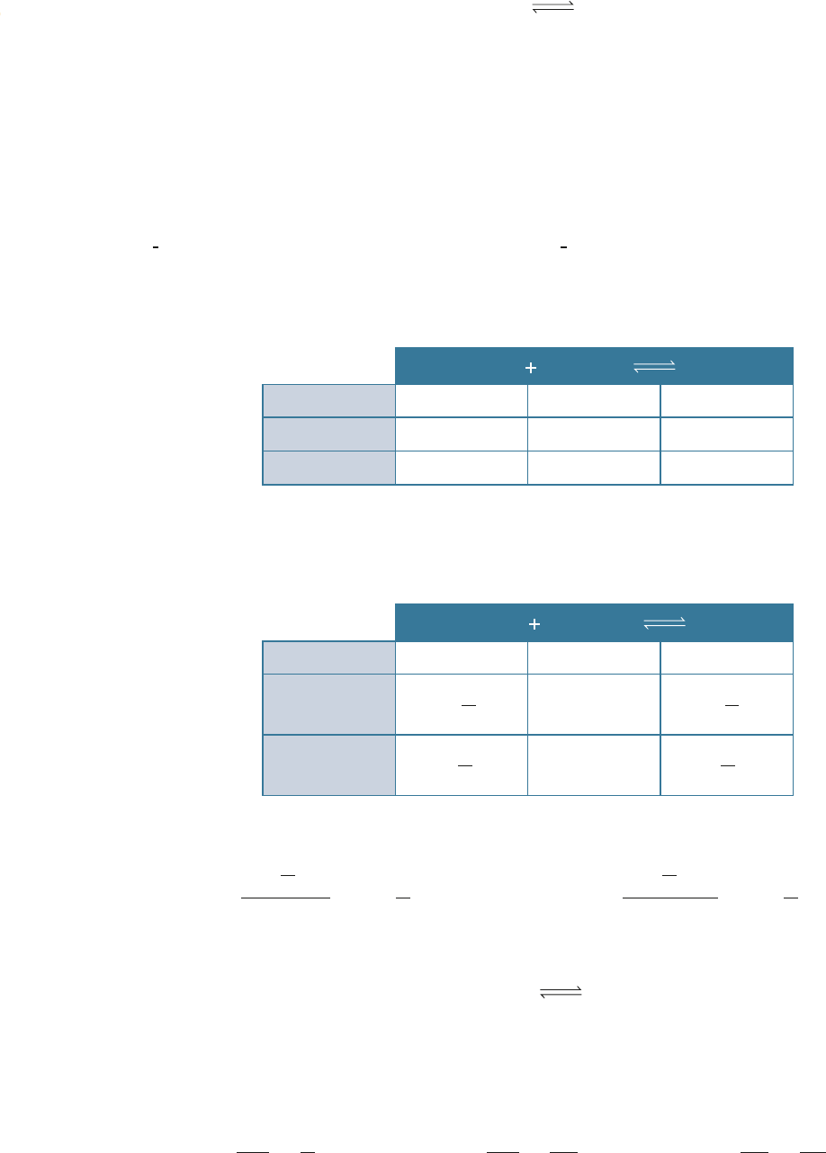 509CAPÍTULO 27 | PROCESSOS REVERSêVEIS 2. (Fuvest-SP) A produção industrial de metanol envolve o equilíbrio representado por: CO (g) 1 2 H 2 (g) CH 3 OH (g) Numa experiência de laboratório, colocaram-se 2 mol de CO e 2 mol de CH 3 OH num recipiente vazio de 1 L. Em condições semelhantes às do processo industrial foi alcançado o equilíbrio. Quando a concentração de equilíbrio de H 2 for x mol/L, quais serão as concentrações de equilíbrio do CO e do CH 3 OH? Solução São conhecidos: • no de mol no início 5 5 5 CO 2 mol; CH OH 2 mol; H zero. 3 2 • no de mol no equilíbrio ⇒ H 2 5 x mol; [H 2 ] 5 x mol/L. Para determinar as concentrações em mol/L no equilíbrio, devemos construir uma tabela: CO (g) 2 H 2 (g) CH 3 OH (g) Início 2 mol 0 2 mol Proporção Equilíbrio x mol Note que no início não ocorrerá a reação direta, pois não existe H 2 (zero mol). Logo, devemos considerar que o CH 3 OH (g) é que deve ser consumido para formar o CO (g) e o H 2 (g). Assim, a tabela será: CO (g) 2 H 2 (g) CH 3 OH (g) Início 2 mol 0 2 mol Proporção forma x 2 mol forma x mol gasta x 2 mol Equilíbrio 2 x 2 1 mol x mol 2 x 2 2 mol E as concentrações em mol/L serão: 5 1 5 1 ? 2[CO] 2 x 2 mol 1 L 2 x z mol L 1 5 2 5 2 ? 2[C OH] 2 x 2 mol 1 L 2 x 2 mol L3 1 3. (Faap-SP) Um recipiente fechado contém o sistema gasoso representado pela equação: 2 SO 2 (g) 1 O 2 (g) 2 SO 3 (g) sob pressão de 6,0 atm e constituído por 0,4 mol de SO 2 , 1,6 mol de O 2 e 2,0 mol de SO 3 . Determine o valor da constante de equilíbrio do sistema em termos de pressões parciais. Solução Uma das maneiras para se resolver este exercício é determinando as frações molares (X): 5 S 5 5X n n 2 4 0,5SO SO 3 3 5 S 5 5X n n 0,4 4 0,1SO SO 2 2 5 S 5 5X n n 1,6 4 0,4O O 2 2 2CONECTEQuim_MERC18Sa_U7_Cap27_p491a518.indd 509 8/2/18 12:43 PM 510 UNIDADE 7 | EQUILÍBRIOS QUÍMICOS MOLECULARES Sabendo que P A 5 X A ? P e que: • P A 5 pressão parcial de A; • X A 5 fração molar de A; • P 5 pressão total; temos: ⇒ ⇒ ⇒ ⇒ 5 ? 5 ? ? ? ? 5 ? ? ? ? 5 ? ? 5 5 K (P ) (P ) (P ) K (X P) (X P) (X P) K (0,5 6) (0,1 6) (0,4 6) K 5 5 0,4 6 K 25 2,4 K 10,4 p SO 2 SO 2 O p SO 2 SO 2 O p 2 2 p p p 3 2 2 3 2 2 4. Para o equilíbrio, N 2 (g) 1 O 2 (g) 2 NO (g) foram realizados, nas mesmas condições, dois experimentos: Estabelecido o equilíbrio no frasco I, constata-se a existência de 8 mol de N 2 . Determine as concentrações (mol ? L21) de N 2 , O 2 e NO no fras- co II, ao ser estabelecido o equilíbrio. Frasco I 10 mol de N 2 10 mol de O 2 1,0 L Frasco II 20 mol de NO 1,0 L Solução Vamos calcular os números de mol de cada participante do equilíbrio no frasco I: N 2 O 2 2 NO Início 10 mol 10 mol 0 Proporção gasta 2 mol gasta 2 mol forma 4 mol Equilíbrio 8 mol 8 mol 4 mol Se a reação do frasco I fosse irreversível, a quantidade de NO obtida no final seria 20 mol, o que equivale ao início do experimento do frasco II. Portanto, os experimentos I e II atingiram a mesma posição de equi- líbrio com iguais quantidades de N 2 , O 2 e NO. Assim, no equilíbrio, as concentrações no frasco I serão: [N 2 ] 5 [O 2 ] 5 8 mol ? L21 e [NO] 5 4 mol ? L21 Isso pode ser demonstrado matematicamente, determinando-se o valor da K c : frasco I: K [NO] [N ][O ] (4 mol/L) (8 mol/L)(8 mol/L) 1 4c 2 2 2 2 5 5 5 frasco II: por se tratar do mesmo equilíbrio, o valor da K c é o mesmo do frasco I. N 2 O 2 2 NO Início 0 mol 0 mol 20 mol Proporção forma x forma x gasta 2x Equilíbrio x mol x mol (20 2 2x) ⇒ ⇒ ⇒ 5 5 2 5 2 5 2 5 K [NO] [N ][O ] 1 4 (20 2x) (x)(x) 1 4 (20 2x) x 1 2 20 2x x x 8 mol c 2 2 2 2 2 2 Assim, nesse equilíbrio, temos: [N 2 ] 5 [O 2 ] 5 x 5 8 mol/L e [NO] 5 20 2 2x 5 20 2 16 5 4 mol/L 2CONECTEQuim_MERC18Sa_U7_Cap27_p491a518.indd 510 8/2/18 12:43 PM 511CAPÍTULO 27 | PROCESSOS REVERSêVEIS Para responder às questões 1 a 6, considere que cada representação de molécula corresponda a 1 mol da substância. Examine as ilustrações abaixo, referentes a três equilíbrios gasosos, a mesma temperatura, cada um deles em um frasco de 1,0 litro. Fundamentando seus conhecimentos 1. Escreva a expressão da constante do equilíbrio I. 2. Determine o valor da K c do equilíbrio I. 3. Determine o valor da K c do equilíbrio II. 4. Determine o valor da K c do equilíbrio III. 5. Indique a ordem crescente da K c para os três equi- líbrios. 6. Qual das três reações — cloração, bromação ou iodação — tem maior extensão? Para o equilíbrio H 2 (g) 1 I 2 (g) 2 HI (g), foram obtidos os seguintes resultados, a 445 8C em um volume de 1,0 L. H 2 (g) I 2 (g) 2 HI (g) Início 0,50 mol 0,50 mol 0 Proporção gasta x gasta x forma 2x Equilíbrio 0,11 mol y z Responda às questões 7 e 8. 7. Determine os valores de x, y e z. 8. Calcule o valor de K c . Em um frasco de 2,0 litros foi colocado 1,50 mol de N 2 O 4 , e se estabelece o seguinte equilíbrio: N 2 O 4 (g) 2 NO 2 (g) Sabendo que no equilíbrio existe 0,12 mol de NO 2 e utilizando a tabela, responda às questões 9 e 10. N 2 O 4 (g) 2 NO 2 (g) Início 1,50 mol x Proporção y 2y Equilíbrio z 0,12 9. Determine os valores de x, y e z. 10. Determine o valor de K c . O gráfico a seguir deve ser utilizado para respon- der às questões 11 e 12, referentes ao equilíbrio: 2 CO 2 (g) 2 CO (g) 1 O 2 (g) B a n c o d e i m a g e n s /A rq u iv o d a e d it o ra[ ] mol ? L21 0,5 1,0 Tempo CORES FANTASIA AUSÊNCIA DE PROPORÇÃO C 2 H 4 1 I 2 C 2 H 4 I 2 III C 2 H 4 1 Br 2 C 2 H 4 Br 2 II C 2 H 4 1 C, 2 C 2 H 4 C, 2 I B a n c o d e i m a g e n s /A rq u iv o d a e d it o ra B a n c o d e i m a g e n s /A rq u iv o d a e d it o ra B a n c o d e i m a g e n s /A rq u iv o d a e d it o ra 2CONECTEQuim_MERC18Sa_U7_Cap27_p491a518.indd 511 8/2/18 12:43 PM