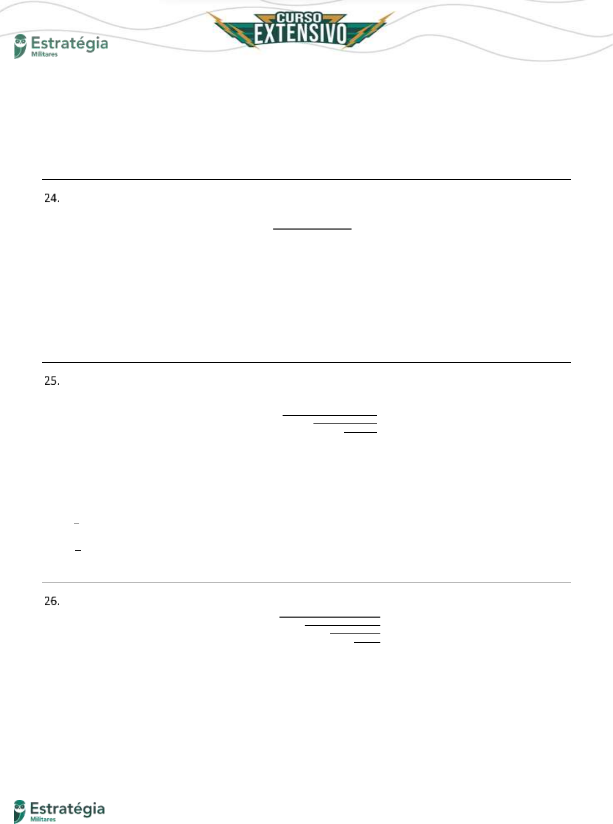58 Prof. Ismael Santos AULA 01 – POTENCIAÇÃO, RADICIAÇÃO, PRODUTOS NOTÁVEIS E FATORAÇÃO b) 121 c) 1331 d) 14641 (Estratégia Militares - 2020 - Inédita - Prof. Ismael Santos) Calcule o valor da expressão abaixo: 𝟏𝟑𝒙+𝟐 + 𝟏𝟑𝒙+𝟏 𝟏𝟑𝒙−𝟏 a) 𝟏𝟑𝒙 b) 𝟏𝟑 c) 𝟏𝟒 d) 𝟑𝟗 (Estratégia Militares - 2020 - Inédita - Prof. Ismael Santos) Determine o valor de 𝑿, na expressão abaixo, sabendo que 𝑿 > 𝟎: 𝑿 = √𝟐 + √𝟐 + √𝟐 +⋯ a) 2 b) 1 c) 𝟏 𝟐 d) 𝟏 𝟒 (Estratégia Militares - 2020 - Inédita - Prof. Ismael Santos) Calcule o valor de 𝒀, na expressão abaixo: 𝒀 = √𝟖𝟏√𝟖𝟏√𝟖𝟏√𝟖𝟏… 𝟑𝟑 𝟑𝟑 a) 3 b) 9 c) 27 d) 81 59 Prof. Ismael Santos AULA 01 – POTENCIAÇÃO, RADICIAÇÃO, PRODUTOS NOTÁVEIS E FATORAÇÃO (Estratégia Militares - 2020 - Inédita - Prof. Ismael Santos) Encontre o valor de x na equação, sabendo que 𝒙 ∈ 𝑵∗: √𝟏𝟐 + √𝟏𝟐 +⋯ . √𝒙 ( 𝟑 √𝒙 ) = √𝟏𝟒𝟒√𝟏𝟒𝟒√𝟏𝟒𝟒√𝟏𝟒𝟒… 𝟑𝟑 𝟑𝟑 a) 3 b) 6 c) 9 d) 12 (Estratégia Militares - 2020 - Inédita - Prof. Ismael Santos) Se 𝑨 = √𝟐√𝟑√𝟐… e 𝑩 = √𝟑√𝟐√𝟑… , determine 𝑨.𝑩 a) 3 b) 6 c) 12 d) 15 (Estratégia Militares - 2020 - Inédita - Prof. Ismael Santos) Se √𝒂√𝒃 = 𝟏 𝟐 e √𝟐𝒂 𝒃 = 𝟐, determine o valor de 𝒂𝟑 + 𝒃𝟑: a) 𝟏/𝟐 b) 𝟏/𝟒 c) 𝟏/𝟔 d) 𝟏/𝟖 (Estratégia Militares - 2020 - Inédita - Prof. Ismael Santos) Se 𝑨 = √𝟑.√ 𝟏𝟏 𝟔 − √𝟐.√√𝟑 + √𝟑 − √𝟐.√√𝟑 − √𝟑 − √𝟐, então, pode-se dizer que: 60 Prof. Ismael Santos AULA 01 – POTENCIAÇÃO, RADICIAÇÃO, PRODUTOS NOTÁVEIS E FATORAÇÃO a) 𝟑 − √𝟐 b) 𝟏𝟏 𝟔 − √𝟐 c) 𝟑 + √𝟐 d) √𝟑 7.1 – Gabarito 1. D 2. C 3. B 4. A 5. B 6. A 7. D 8. A 9. D 10. A 11. B 12. A 13. C 14. A 15. D 16. B 17. C 18. B 19. D 20. A 21. A 22. C 23. C 24. C 25. A 26. B 27. C 28. B 29. D 30. A