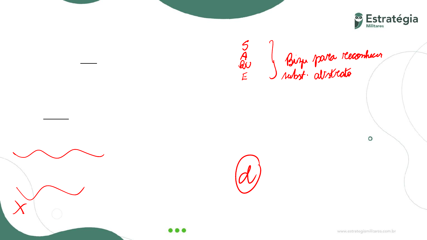 PORTUGUÊS - Profª Fabíola Soares 15. (Estratégia Militares 2022 - Prof.ª. Fabíola Soares) Leia: “Do que dissestes, alma fria, Já nada vos acode mais?... Éramos sós... Lá fora chovia... Quanta ternura em mim havia!” Os substantivos destacados no texto classificam-se, respectivamente, como a) abstrato e concreto. b) concreto e concreto. c) abstrato e abstrato. d) concreto e abstrato. PORTUGUÊS - Profª Fabíola Soares 16. (Estratégia Militares 2022 - Prof.ª. Fabíola Soares) Assinale a alternativa em que a relação coletivo/conjunto de seres está incorreta. a) prole/filhos b) flora/animais c) caravana/viajantes d) armada/navios de guerra PORTUGUÊS - Profª Fabíola Soares 17. (Estratégia Militares 2022 - Prof.ª. Fabíola Soares) Assinale a alternativa que completa o trecho abaixo com substantivos coletivo, sobrecomum e comum-de--dois, respectivamente. Na______, a ______ recebeu o valioso prêmio das mãos do _______. a) biblioteca, criança, jornalista b) praça, estudante, professor c) plateia, mulher, artista d) arena, atleta, oficial