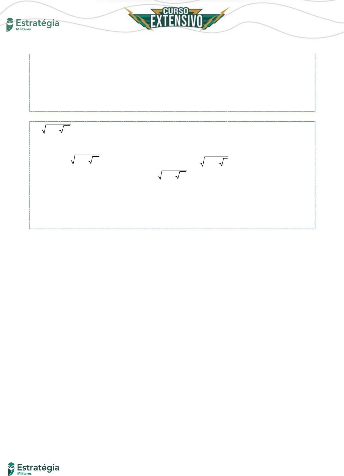 19 Prof. Ismael Santos AULA 03 – NÚMEROS IRRACIONAIS; RACIONALIZAÇÃO; RADICAL DUPLO 3 2 . x y x y = + = Temos, então, 2 1 x y = = b) 7 2 12− Comentário: Perceba que 7 2 12− se assemelha ao radical da forma: 2A b . Assim: 7 2 12− 12 7 x y x y = − = + Temos, então, 4 3 x y = = 20 Prof. Ismael Santos AULA 03 – NÚMEROS IRRACIONAIS; RACIONALIZAÇÃO; RADICAL DUPLO 4.0 – Lista de Questões 1. (Upe-ssa 3 2018) Qual é o valor da expressão √ 𝟒 (𝟐−√𝟔)𝟐 − √ 𝟒 (𝟐+√𝟔)𝟐 ? a) 𝟎 b) 𝟒 c) 𝟐√𝟔 d) 𝟒√𝟔 e) 𝟐 + 𝟐√𝟔 2. (Cmrj 2018) Utilize a identidade abaixo para resolver a questão. “Se A e B forem números reais positivos, então é sempre verdade que: 2 2A A B A A B A B 2 2 + − − − + = + Essa identidade pode ser provada elevando-se ao quadrado ambos os membros da igualdade.” A figura a seguir ilustra um plano inclinado de 1m de comprimento e aclive de 15 . A projeção horizontal p dessa rampa mede, em metros, 2 3 . 4 + A medida de p também pode ser expressa com exatidão por a) 2 2 . 3 b) 5 3 . 4 + 21 Prof. Ismael Santos AULA 03 – NÚMEROS IRRACIONAIS; RACIONALIZAÇÃO; RADICAL DUPLO c) 6 2 . 4 + d) 10 3 . 5 + e) 11 6 . 6 + 3. (Cp2 2018) Um professor gosta de criar desafios para seus estudantes, com expressões envolvendo um só número. Em certa aula, apresentou o seguinte problema dos quatro “quatros”: 4 4 4 x 4 = O valor de x é a) 16. b) 128. c) 128 2. d) 256 2. 4. (Pucrj 2018) Simplificando 33 3 3 1 9 ( 3 24), 3 + + encontramos: a) 9 b) 10 c) 3 3 d) 12 e) 1 5. (Puccamp 2017) Usando a tecnologia de uma calculadora pode-se calcular a divisão de 2 por 3 4 e obter um resultado igual a a) 4. b) 3 3. c) 5. d) 3 2.