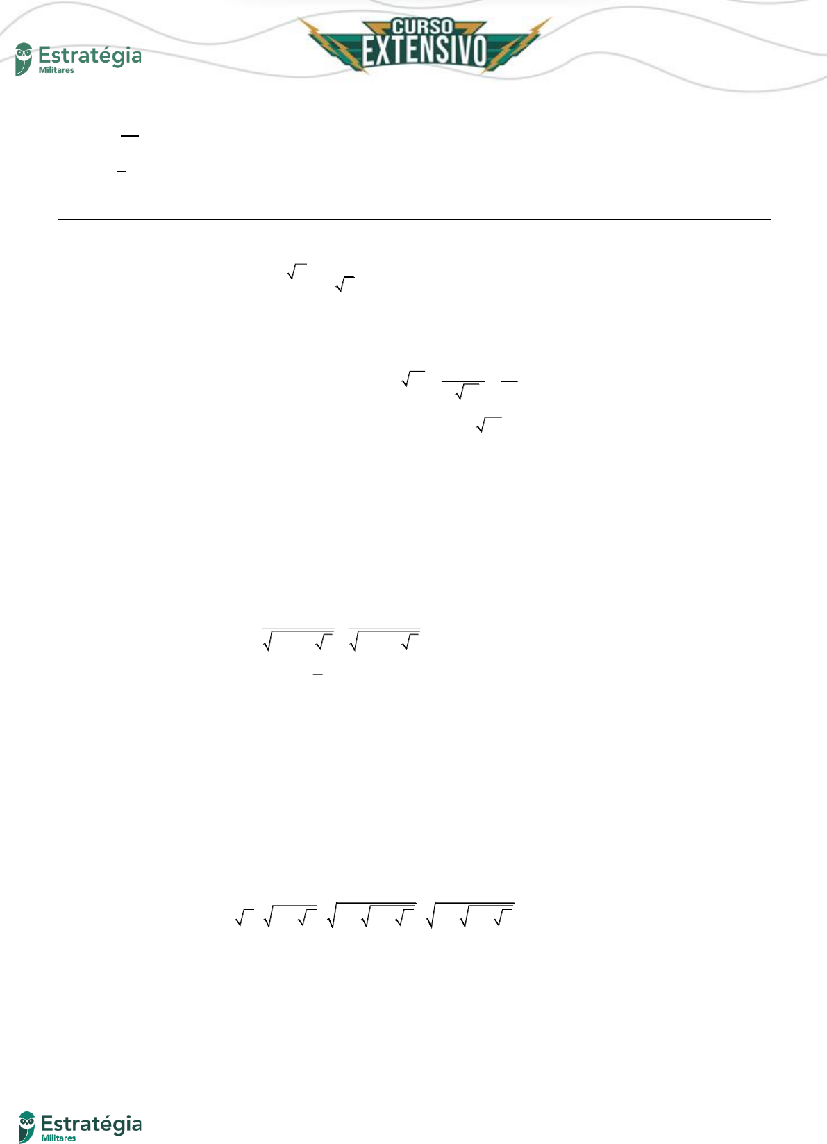 25 Prof. Ismael Santos AULA 03 – NÚMEROS IRRACIONAIS; RACIONALIZAÇÃO; RADICAL DUPLO c) √𝒙𝟓 𝟏𝟐 . d) √𝒙 𝟔 . 16. (Cftrj 2012) O “Método das Iterações” fornece um algoritmo que calcula o valor aproximado de raízes quadradas, indicado ao lado: A B A . 2 B + Onde: A é o número de que desejamos obter o valor aproximado da raiz quadrada e B é o quadrado perfeito mais próximo de A. Por exemplo, se A = 17, teremos B = 16 e, daí: 17 16 33 17 4,125. 82 16 + = = Aplicando o método acima, qual é o valor aproximado de 33 ? a) 5,73 b) 5,75 c) 5,77 d) 5,79 17. (Ifal 2011) O número 1 1 N 32 10 7 32 10 7 = + + − é um decimal ilimitado periódico. Se N for escrito sob a forma da fração irredutível a b então a b+ é igual a: a) 11. b) 12. c) 13. d) 14. e) 15. 18. (Epcar (Afa) 2011) Se 2 2 2 2 2 2 2 2 2 + + + − + , então ( ) 𝜶 ∈ (𝑰𝑹− 𝑰𝑵) ( ) α pode ser escrito na forma 𝜶 = 𝟐𝒌, k ∈ ℤ ( ) 𝜶 ∈ [(ℚ−ℤ) ∪ (𝑰𝑹 −ℚ)] ( ) [(ℤ∩ ℚ) ∩ (𝑰𝑹− 𝑰𝑵)] ⊃ 𝜶 26 Prof. Ismael Santos AULA 03 – NÚMEROS IRRACIONAIS; RACIONALIZAÇÃO; RADICAL DUPLO 19. (Ifce 2011) Racionalizando o denominador da fração 8 3 2 2 5 2 , obtemos, como resultado, a) 82 2 5 b) 8 32 2 5 c) 85 2 5 d) 8 35 2 2 e) 2 2 5 20. (Cftrj 2011) Qual, dentre as opções abaixo, equivale a √𝟑 + 𝟐√𝟐? a) −𝟑 + √𝟐 b) −𝟏,𝟓 + √𝟐 c) 𝟏 + √𝟐 d) 𝟐 +√𝟐 21. (Cftmg 2010) Considerando as seguintes afirmações que envolvem propriedades de potenciação e radiciação 8 2 I) a a a a a, (a 0) II) a b 2 ab a b, (a b 0) III) ( a b) a b,(a 0 e b 0) IV) ab a b, (a 0 e b 0), = + − = − − = − = pode-se concluir que são corretos apenas os itens a) I e II. b) I e IV. c) II e III. d) II e IV. 27 Prof. Ismael Santos AULA 03 – NÚMEROS IRRACIONAIS; RACIONALIZAÇÃO; RADICAL DUPLO 22. (Ufrgs 2010) O quadrado do número 2 3 2 3+ + − é a) 4. b) 5. c) 6. d) 7. e) 8. 23. (Ufrgs 2005) O número 3 + 2 2 é igual à raiz quadrada de a) 6 + 5 2 . b) 9 + 4 2 . c) 12 + 8 2 . d) 15 + 10 2 . e) 17 + 12 2 . 24. (Pucrj 2006) Assinale a alternativa INCORRETA: a) o dobro de 8 é 32 . b) 100 - 64 = 6 c) 2 + 8 = 3 2 d) 60 16+ = 8 e) 2 + 3 = 5 24+ 25. (Pucrj 2006) A expressão 5 5 5 5+ − é igual a: a) 0 b) 5 c) 5 - 5 d) 2 5 e) 20
