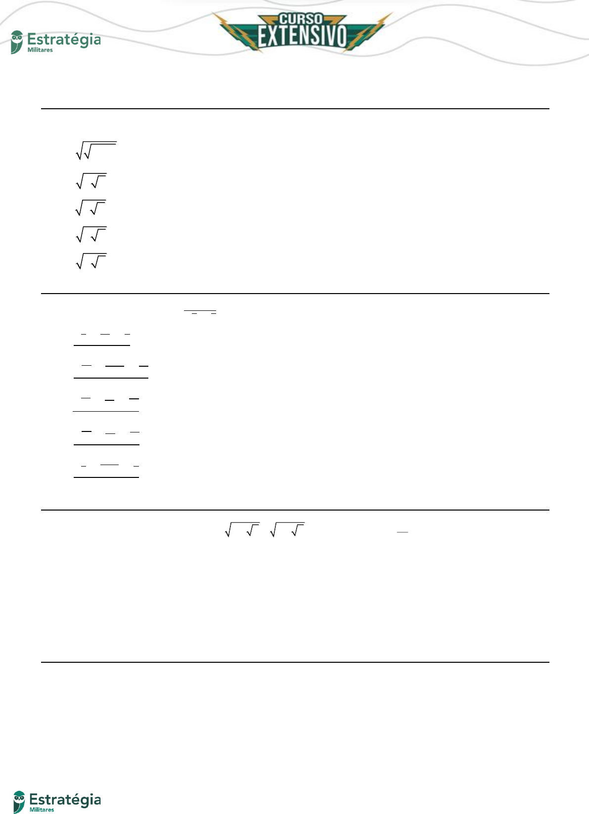 28 Prof. Ismael Santos AULA 03 – NÚMEROS IRRACIONAIS; RACIONALIZAÇÃO; RADICAL DUPLO 26. (Ufc 2007) Dentre as alternativas a seguir, marque aquela que contém o maior número. a) 3 (5.6) b) 36 5 c) 35 6 d) 3 5 6 e) 3 6 5 27. (Utfpr 2007) A expressão 𝟏 √𝒙 𝟑 − √𝒚 𝟑 é igual a: a) √𝒙 𝟑 + √𝒙𝒚 𝟑 + √𝒚 𝟑 𝒙−𝒚 b) √𝒙𝟐 𝟑 − √𝒙𝟐𝒚𝟐 𝟑 + √𝒚𝟐 𝟑 𝒙−𝒚 c) √𝒙𝟐 𝟑 + √𝒙𝒚 𝟑 + √𝒚𝟐 𝟑 𝒙−𝒚 d) √𝒙𝟐 𝟑 − √𝒙𝒚 𝟑 + √𝒚𝟐 𝟑 𝒙+𝒚 e) √𝒙 𝟑 − √𝒙𝟐𝒚𝟐 𝟑 − √𝒚 𝟑 𝒙+𝒚 28. (Cftmg 2007) Seja a expressão x = 3 5 3 5+ + − , então, o valor de 2x 5 é a) 2 b) 3 c) 5 d) 10 29 Prof. Ismael Santos AULA 03 – NÚMEROS IRRACIONAIS; RACIONALIZAÇÃO; RADICAL DUPLO 29. (Unifesp 2008) Se 0 < a < b, racionalizando o denominador, tem-se que 1 b a . b aa b − = −+ Assim O valor da soma 𝟏 𝟏+√𝟐 + 𝟏 √𝟐+√𝟑 + 𝟏 √𝟑+√𝟒 +. . . + 𝟏 √𝟗𝟗𝟗+√𝟏𝟎𝟎𝟎 é: a) 𝟏𝟎√𝟏𝟎− 𝟏. b) 𝟏𝟎√𝟏𝟎. c) 𝟗𝟗. d) 100. e) 101. 30. (Cftce 2005) Racionalizando o denominador da fração n 2n a. b b , obtemos: a) n 2na. b b + b) n 2na. b b − c) n 1na. b b − d) n 1n 2 a. b b + e) a . n b 31. (Ita 2005) Sobre o número x = [√(7 − 4√𝟑)]+√𝟑 é correto afirmar que a) x ∈ ] 0, 2 [. b) x é racional. d) x2 é irracional. e) x ∈ ] 2; 3 [. 32. (Cftce 2005) A expressão 3 x y y x , com x > 0 e y > 0, é igual a: 30 Prof. Ismael Santos AULA 03 – NÚMEROS IRRACIONAIS; RACIONALIZAÇÃO; RADICAL DUPLO a) 6 y x b) 3 xy c) x y d) 3 x y e) 6 x y 33. (Ufc 2004) O valor exato de 32 10 7 32 10 7+ + − é: a) 12 b) 11 c) 10 d) 9 e) 8 34. (CN 1982) Efetuando √ 𝟐+√𝟑 𝟐−√𝟑 + √ 𝟐−√𝟑 𝟐+√𝟑 , obtém-se: a) 𝟒 b) √𝟑 c) √𝟐 d) 𝟐 𝟑 e) 1 35. (CN 1981) 3 10 6 3+ é igual a: a) 1 7+ b) 1 6+ c) 1 5+ d) 1 3+