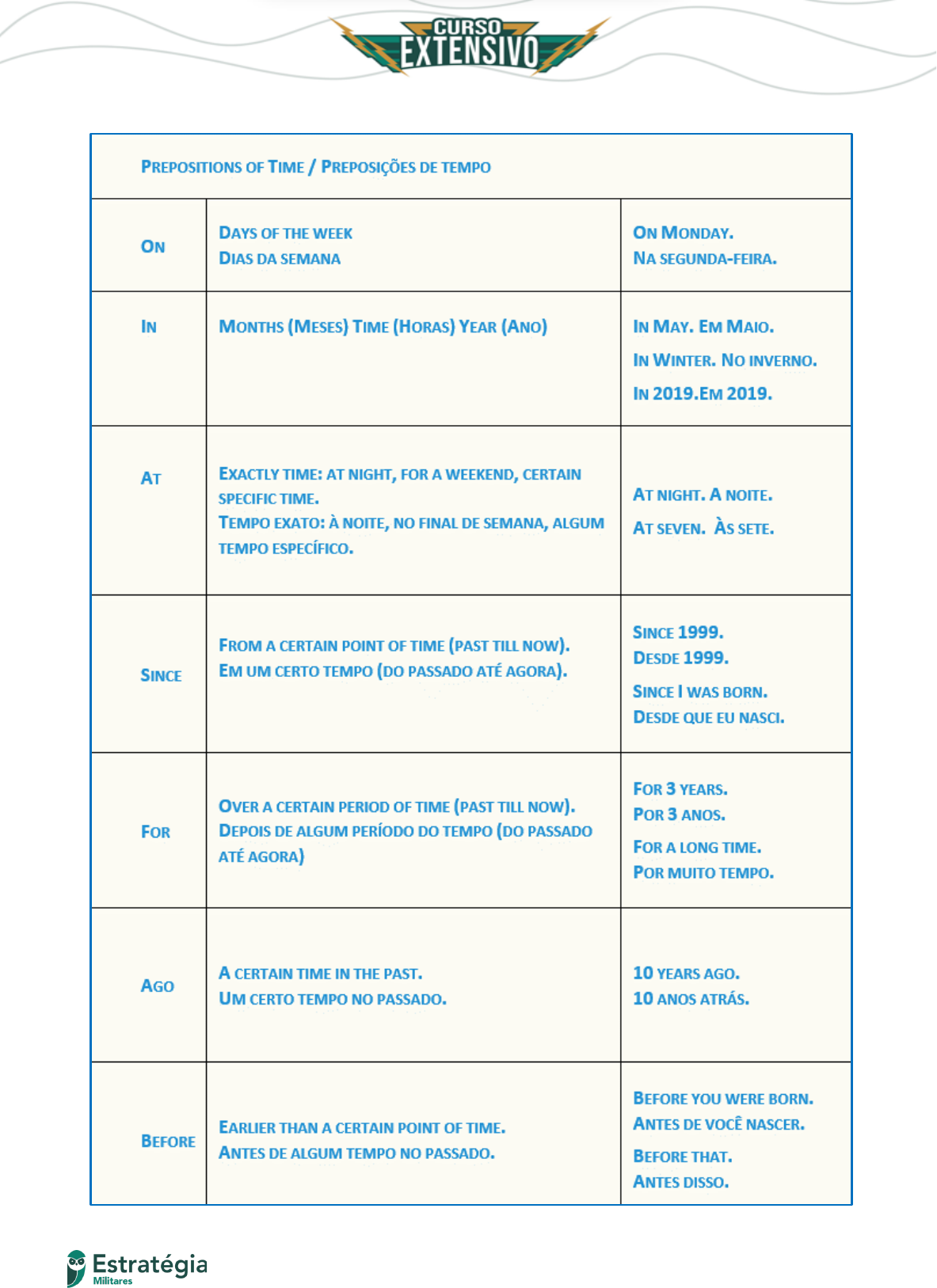 28 AULA 04 – Pronouns and Prepositions 29 AULA 04 – Pronouns and Prepositions 6.0 QUESTÕES DE PROVAS ANTERIORES 1. (Estratégia Militares 2020 – EEAR/INÉDITA) In “The next November, after the crops were harvested, the Pilgrims gave thanks to God at a feast to which they invited the Indians.” (lines 9, 10 and 11), the underlined word refers to No trecho, a expressão to which tem o sentido de “para o qual”, referindo-se o termo which a “feast”, o banquete, veja: no novembro seguinte, após a colheita, os peregrinos deram graças a Deus em um banquete para o qual convidaram os índios. (convidaram os índios para o banquete). a) they Como vimos, o termo se refere a feast, banquete, não a eles, they. ERRADA. b) feast Alternativa CORRETA, conforme explicado acima. c) God 30 AULA 04 – Pronouns and Prepositions Como vimos, o termo se refere a feast, banquete, não a Deus, God. ERRADA. d) the Indians Como vimos, o termo se refere a feast, banquete, não aos índios, the Indians. ERRADA. 2. (Estratégia Militares 2020 – EEAR/2015) Fill in the blanks with the suitable option Nessa questão, se você lembrasse que para datas com o dia a preposição é sempre ON, já seria possível acertá-la, pois só há uma alternativa começando com ON. ___ the 31st of October = datas com o dia → preposition ON many people ___ England, in the United States and even in Brazil prepare to celebrate Halloween, or the Witches Day. = lugares como bairros, cidades, estados, países, continentes → preposition IN Many years later in England, farmers used to go _____house _____house to ask for food. = expressão de casa em casa → de – origem = FROM / em – para onde está indo = TO. ü on – in – from – to a) for – to – on – in b) on – in – from – to c) to – from – in – for d) since – for – from – to